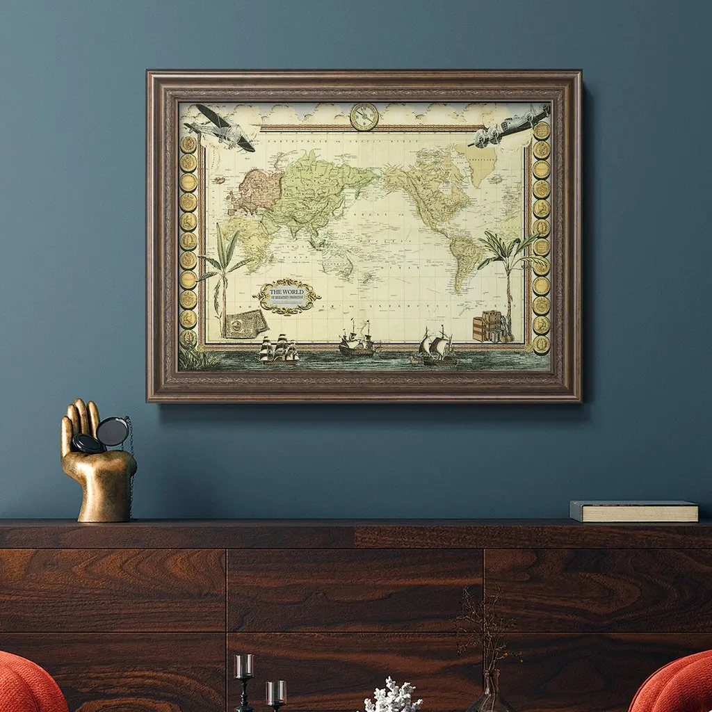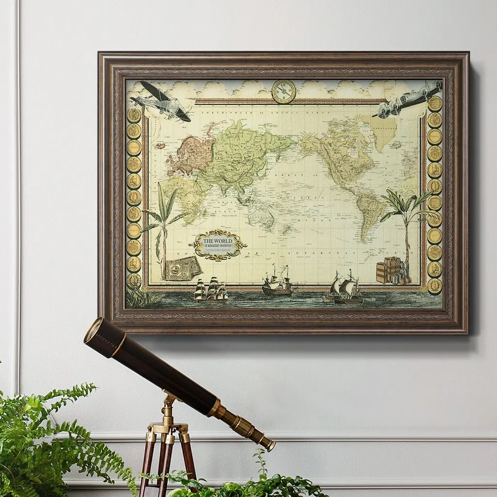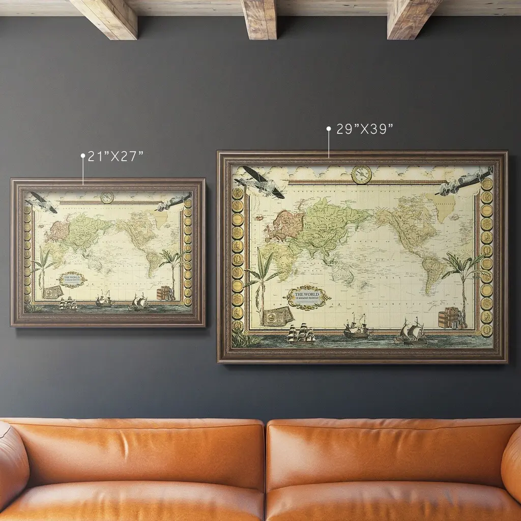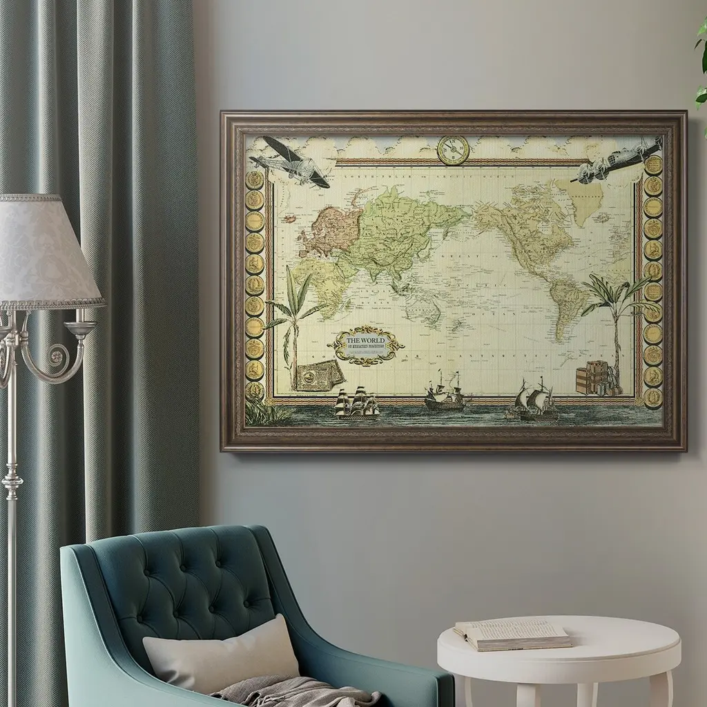 Adventure Map Premium Framed Canvas- Ready to Hang A Premium Framed Canvas created to last. Framed in distressed wood and available in an array of sizes and colors Featuring a beveled a solid wood stretcher bar, each piece comes ready to hand 3 SIZES AVAILABLE 16''X20'' - Overall Size 18'X27'' - Overall Size 24''x36'' - Overall Size Each piece is made to order. Each piece comes with hanging hardware. Made in the USA Ready to Hang Giclee Paper Print Acrylic Glass Beveled Matt Board