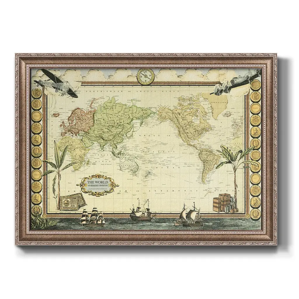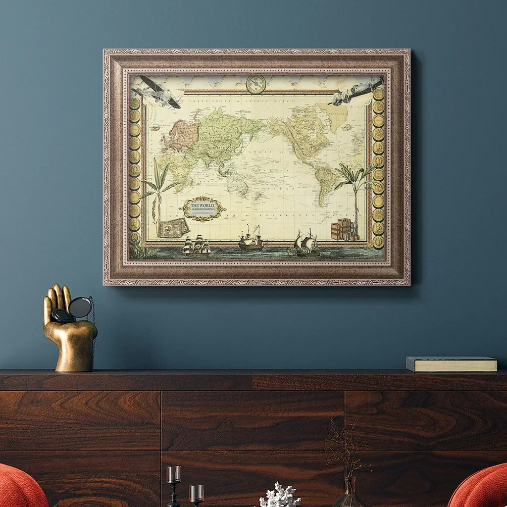 Adventure Map Premium Framed Canvas- Ready to Hang A Premium Framed Canvas created to last. Framed in distressed wood and available in an array of sizes and colors Featuring a beveled a solid wood stretcher bar, each piece comes ready to hand 3 SIZES AVAILABLE 16''X20'' - Overall Size 18'X27'' - Overall Size 24''x36'' - Overall Size Each piece is made to order. Each piece comes with hanging hardware. Made in the USA Ready to Hang Giclee Paper Print Acrylic Glass Beveled Matt Board