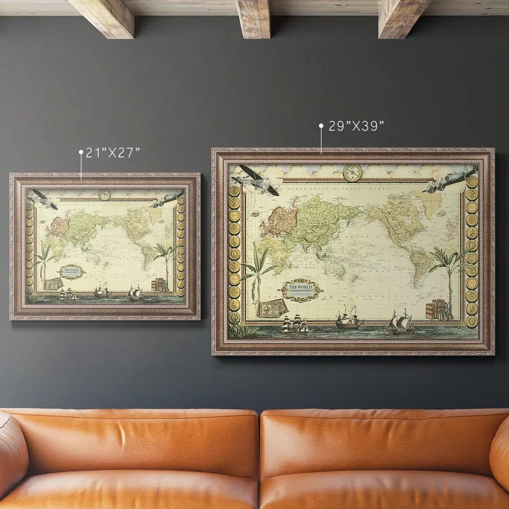 Adventure Map Premium Framed Canvas- Ready to Hang A Premium Framed Canvas created to last. Framed in distressed wood and available in an array of sizes and colors Featuring a beveled a solid wood stretcher bar, each piece comes ready to hand 3 SIZES AVAILABLE 16''X20'' - Overall Size 18'X27'' - Overall Size 24''x36'' - Overall Size Each piece is made to order. Each piece comes with hanging hardware. Made in the USA Ready to Hang Giclee Paper Print Acrylic Glass Beveled Matt Board