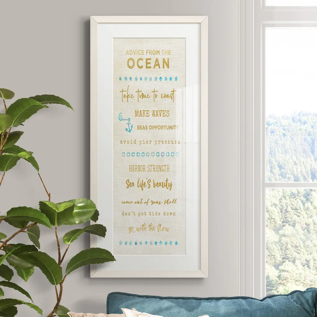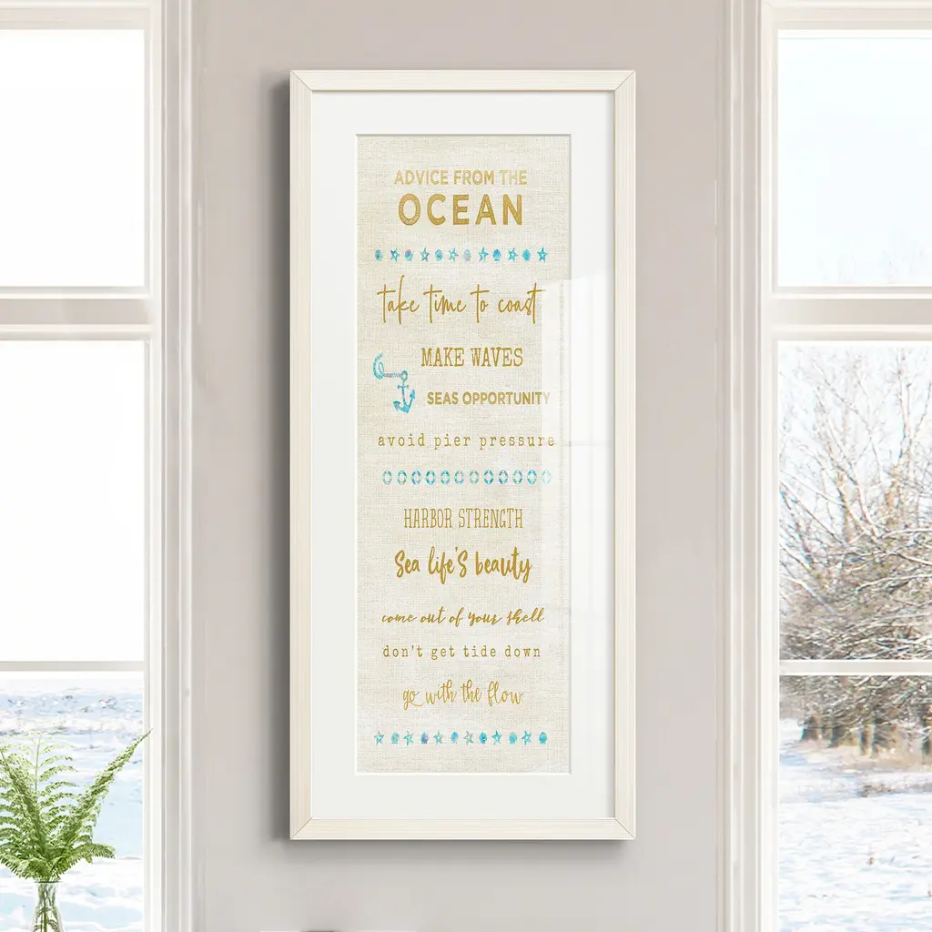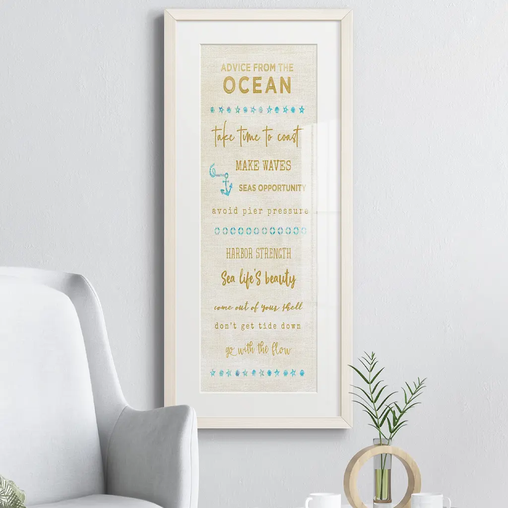 Advice from the Ocean-Premium Gallery Framed Print - Ready to Hang A Premium Framed Print created to last. Framed in distressed wood and available in an array of sizes and colors Featuring a beveled a solid wood stretcher bar, each piece comes ready to hand 1 SIZE AVAILABLE 12''X28'' - Overall Size Each piece is made to order. Each piece comes with hanging hardware. Made in the USA Ready to Hang Giclee Paper Print Acrylic Glass Beveled Matt Board