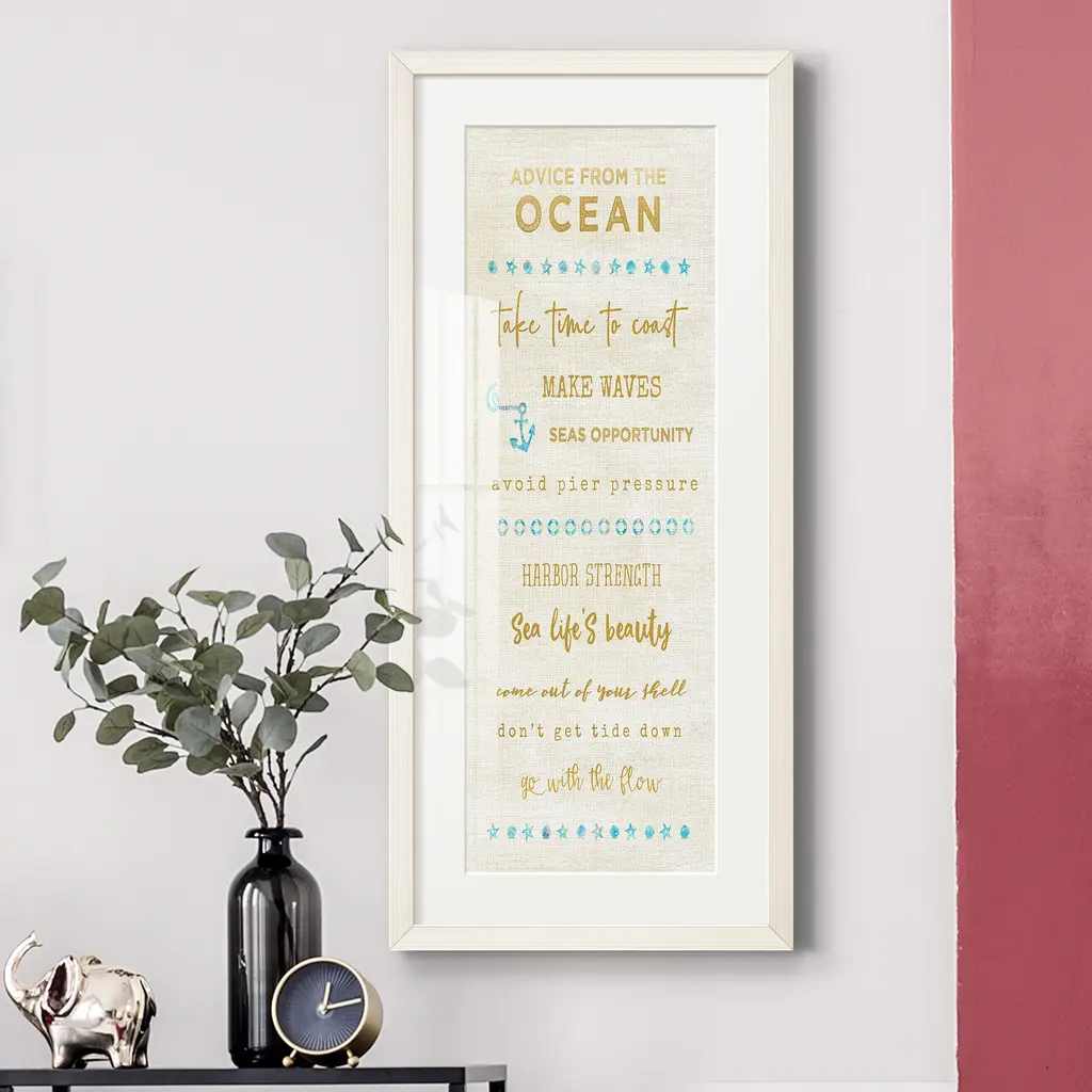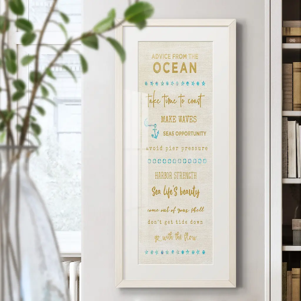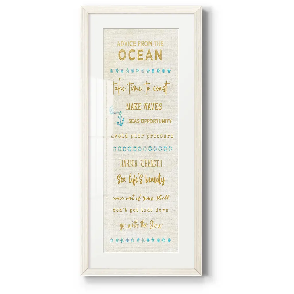 Advice from the Ocean-Premium Gallery Framed Print - Ready to Hang A Premium Framed Print created to last. Framed in distressed wood and available in an array of sizes and colors Featuring a beveled a solid wood stretcher bar, each piece comes ready to hand 1 SIZE AVAILABLE 12''X28'' - Overall Size Each piece is made to order. Each piece comes with hanging hardware. Made in the USA Ready to Hang Giclee Paper Print Acrylic Glass Beveled Matt Board