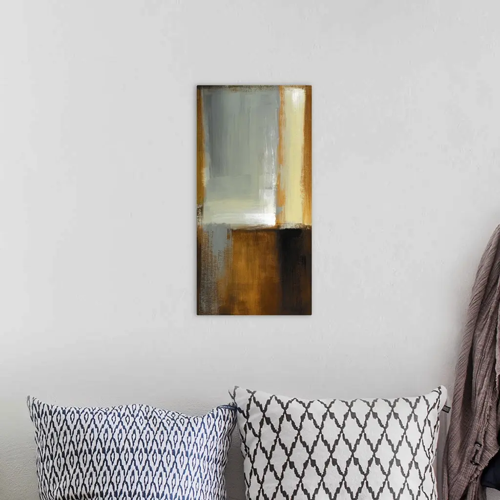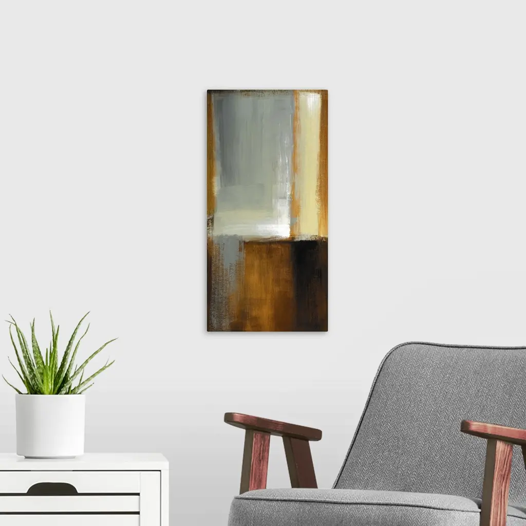 Vertical abstract painting on canvas of various patches of color layered on top of one another.