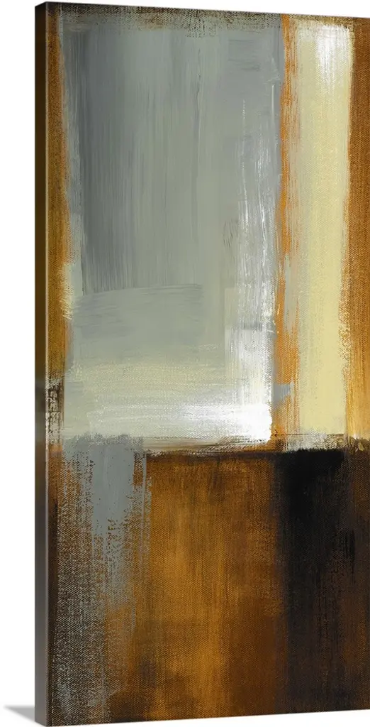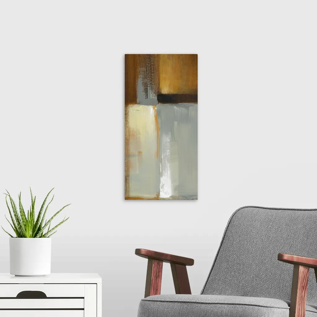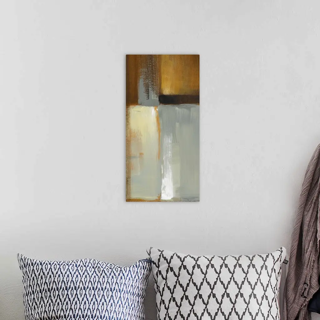 Vertical contemporary painting on a large wall hanging of large rectangular shapes in various colors, painted mostly vertically, with large, thick brushstrokes that are not smoothly blended.