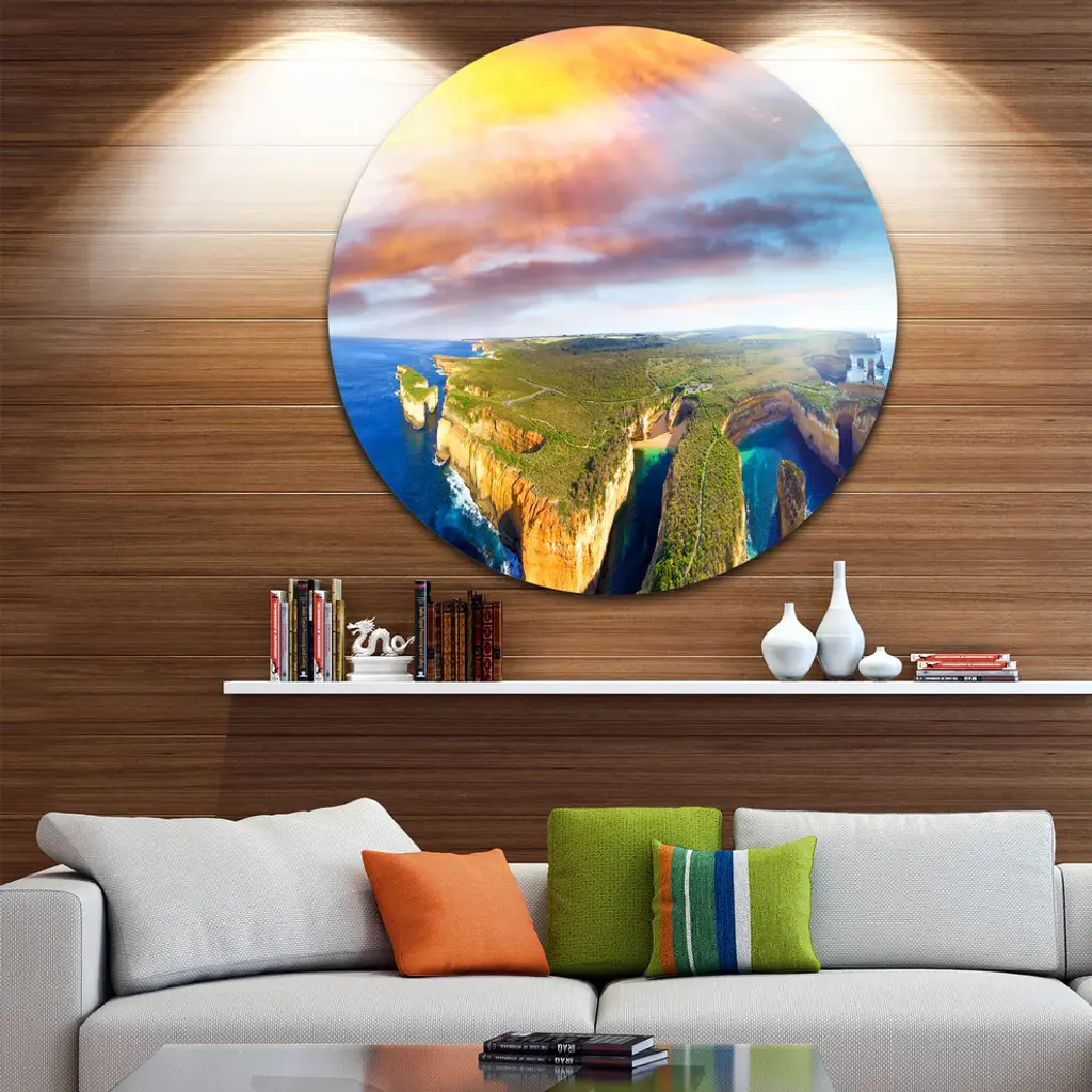 Bring Contemporary Abstraction to your home with this large Circle Metal wall art. This Aerial View of Great Ocean Road Metal Artwork makes it the focal point of any room or office. - White Gloss Coating ensures colors are extra vibrant with light reflection.- Aluminum grade Sheet Metal with 1 inch mounting frame on the back giving the illusion that the artwork is floating on the wall..- Mounting Brackets are included along with instructions.- High Quality Digital images are created directly into a glossy aluminum panel producing a stunning and captivating print into the glossy finish of the metal.- Water, Fire and Scratch resistant HD Aluminum panels.- Looks better than any photo paper and guaranteed to last at least 20 years- Easy to clean with a microfiber cloth. Colors are far superior to regular Canvas Art. - Easy to Hang
