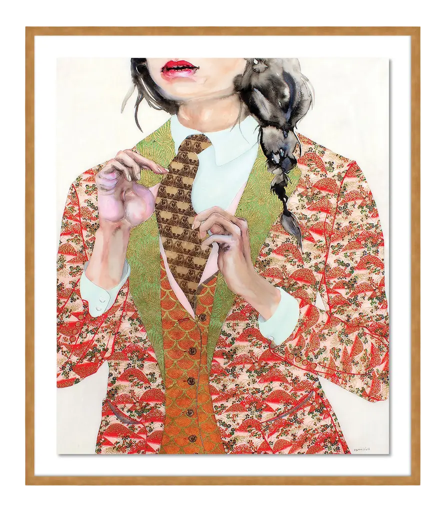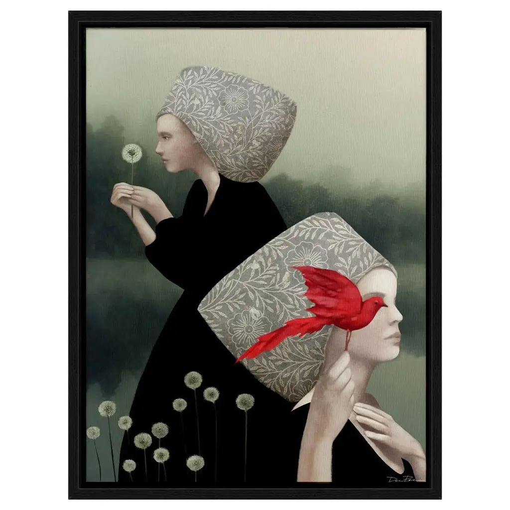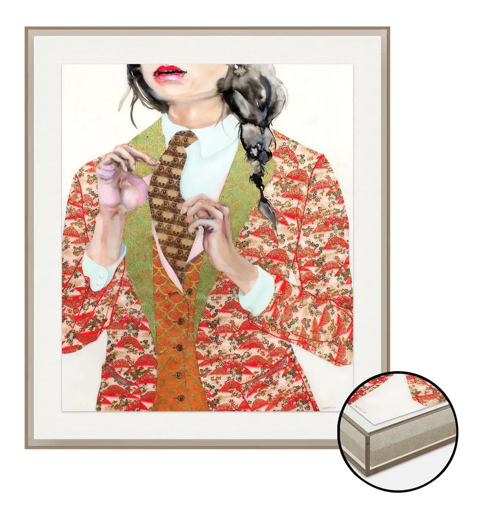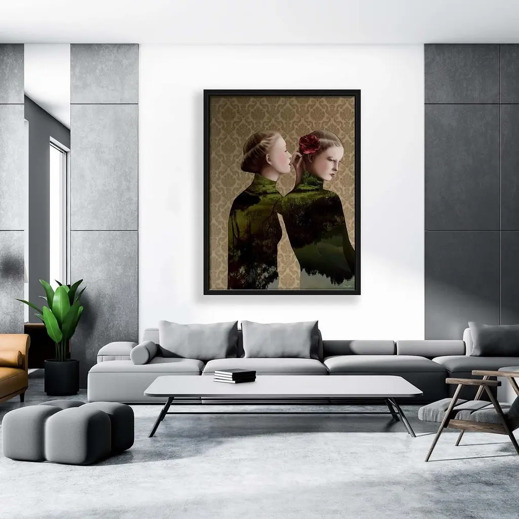 This Limited Edition, Pop-Surrealist digital artwork is made by assembling photographs and illustrations into a collage. This sensual piece features two elegant, identically dressed women, one of whom intimately whispers into the ear of the other. Numbered and signed by the artist with a Certificate of Authenticity. Printed on fine cotton canvas with a basswood box frame.Year of Creation: 2015Edition Number: 1/300Artist’s Signature: Printed on the Canvas + original signature on Limited Edition Certificate which will be given with the purchase of the itemCondition: NewMaterials: Cotton canvas, basswood box frame, dried fir structure