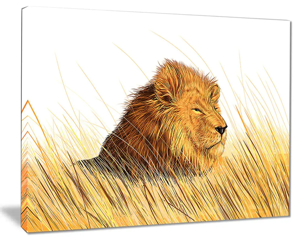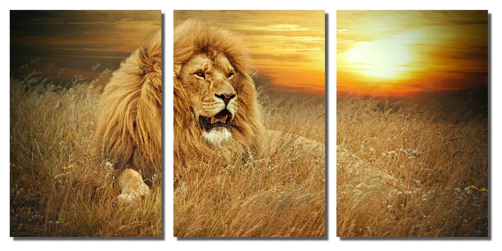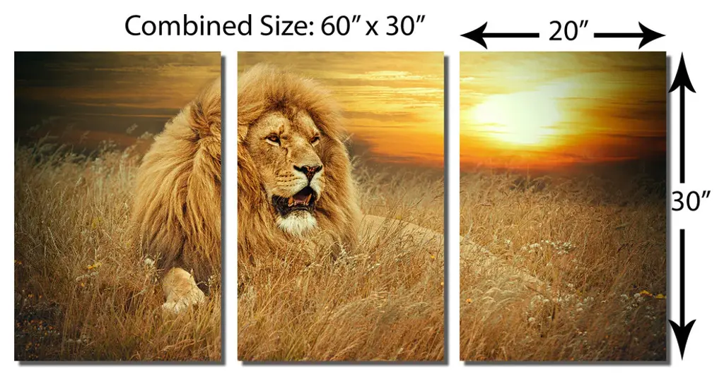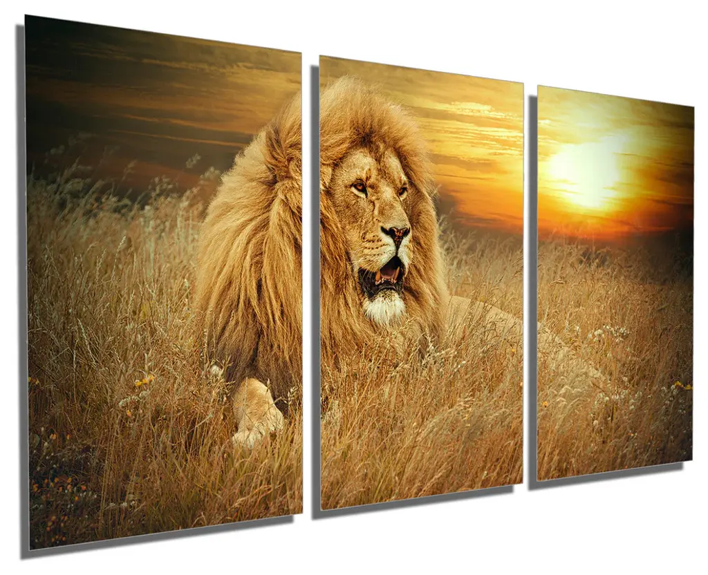 60" x 30" total size. Ready To Hang! (3 pieces - 20" x 30" each). 3 Panel Split (Triptych) Metal Print of an African Lion in a field during sunset. Modern metal wall art for home or office wall decor & interior design. Printed on Luxurious, HD aluminum glossy metal panels. Multi panel art.. HD aluminum panels. Metal print wall art. Includes Shadow Wall Mount on the back.• Aluminum Metal Wall Art• Made in USA• Ready to hang - No assembly required• Shadow mount hardware on the back• 0.045" thick HD Aluminum Panels• Scratch resistant, glossy finish• Superb color clarity, luxurious prints• Epson printing process• For indoor or moisture rich environment use• Easy to clean. Gently wipe with microfiber cloth.