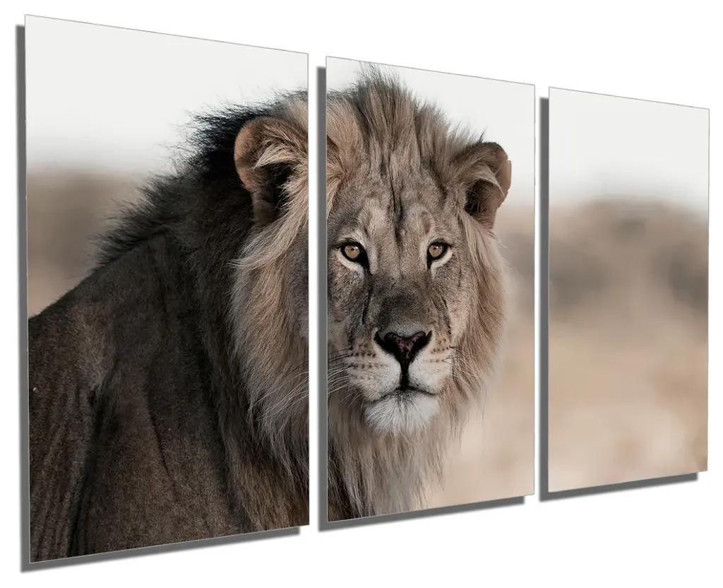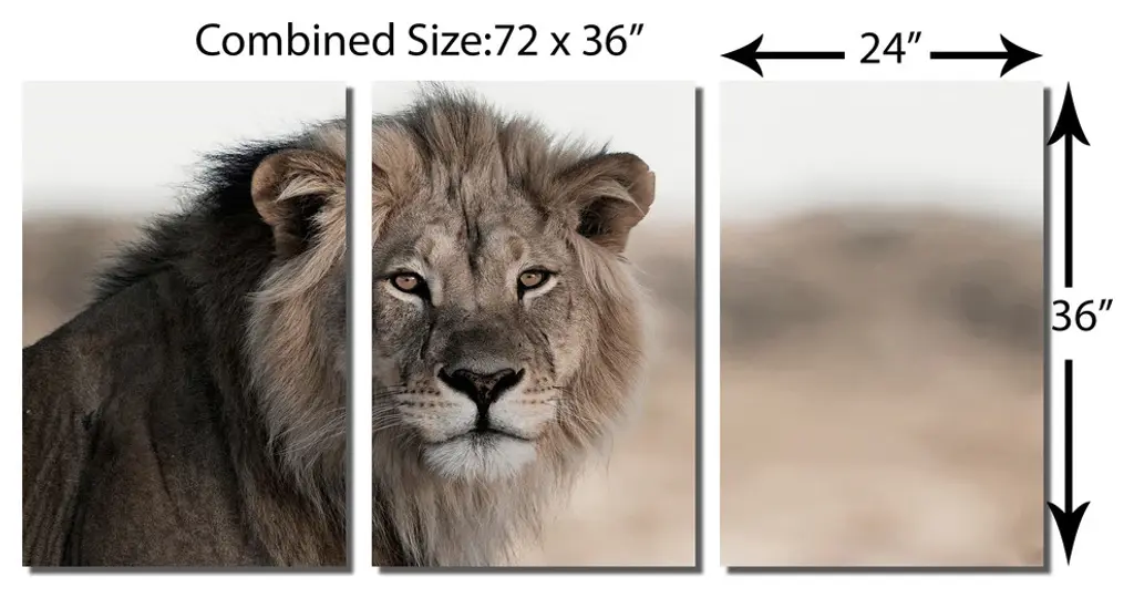 72" x 36" total size. Ready To Hang! (3 pieces - 24" x 36" each). 3 Panel Split (Triptych) Metal Print of an African Lion in a field in Cocoa brown, looking into the distance. Modern metal wall art for home or office wall decor & interior design. Printed on Luxurious, HD aluminum glossy metal panels. Multi panel art.. HD aluminum panels. Metal print wall art. Includes Shadow Wall Mount on the back.• Aluminum Metal Wall Art• Made in USA• Ready to hang - No assembly required• Shadow mount hardware on the back• 0.045" thick HD Aluminum Panels• Scratch resistant, glossy finish• Superb color clarity, luxurious prints• Epson printing process• For indoor or moisture rich environment use• Easy to clean. Gently wipe with microfiber cloth.