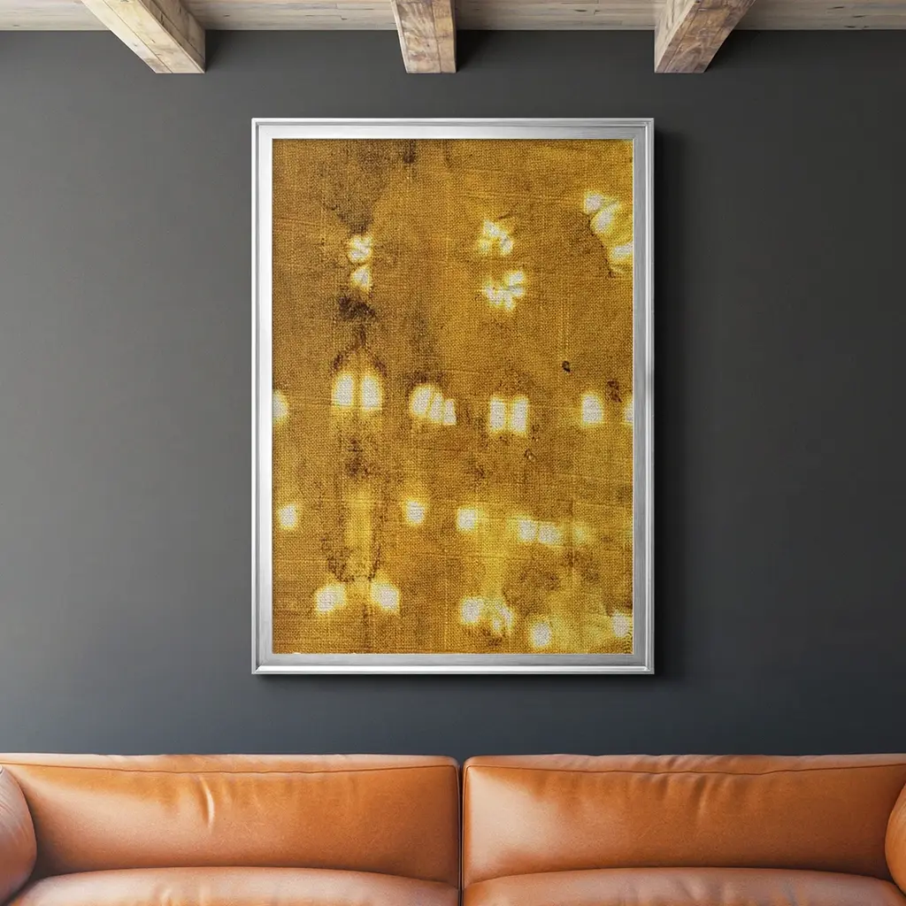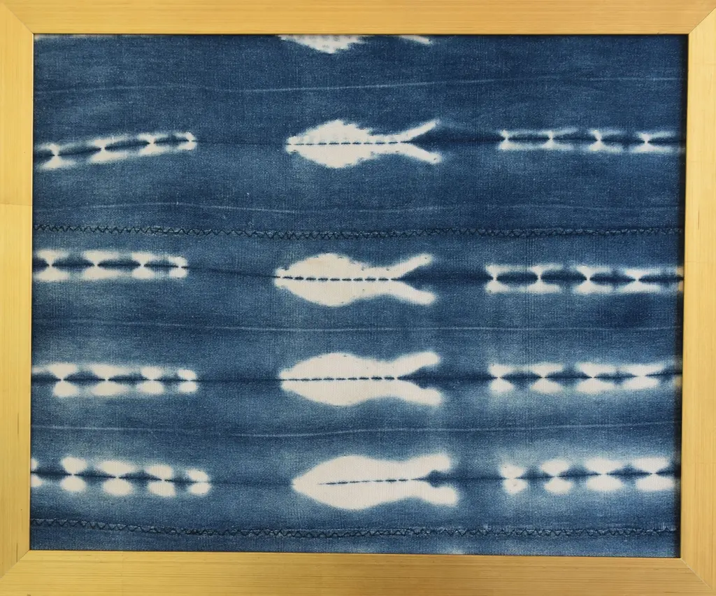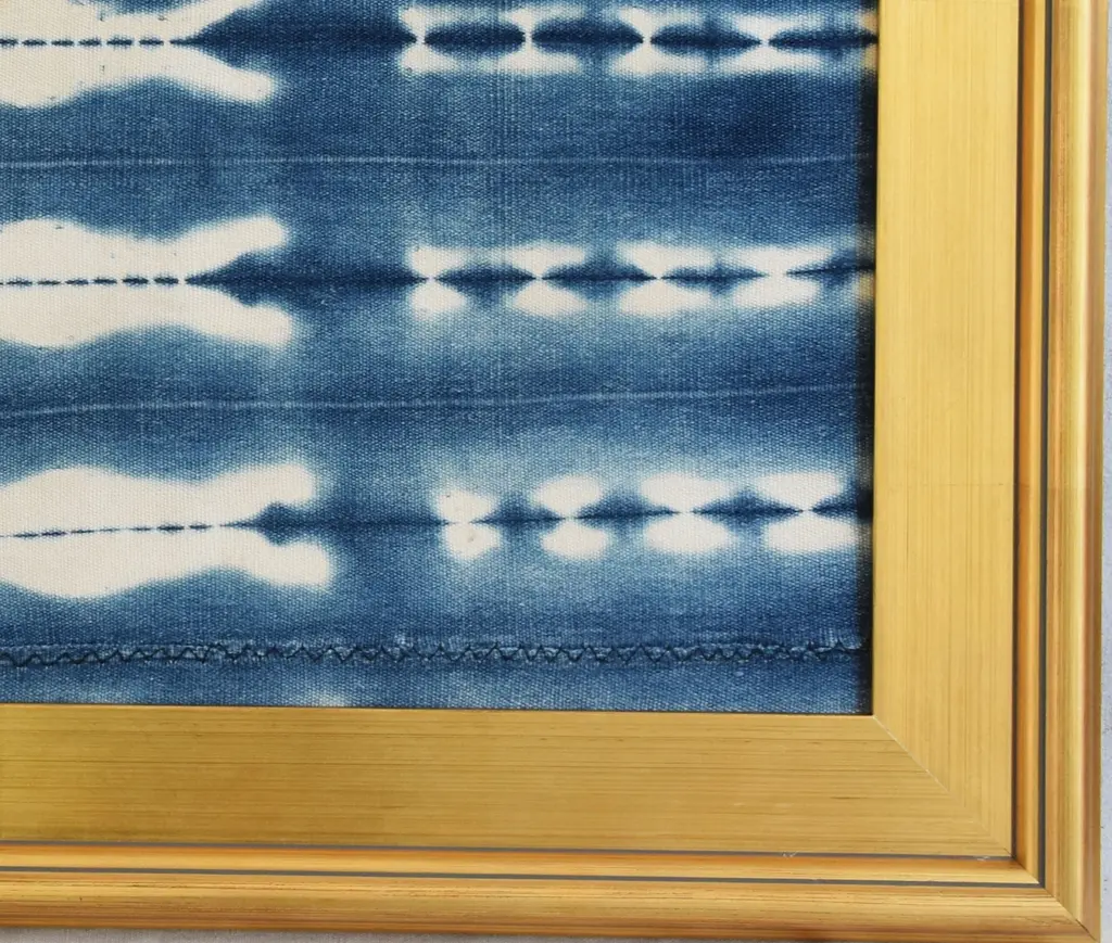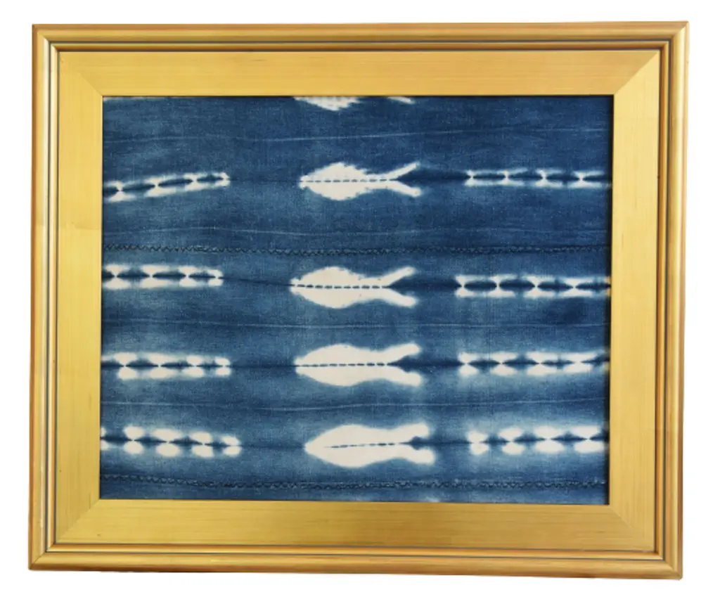 Custom-framed vintage blue & white nautical fish African textile remnant from Mali displayed in a gold frame under non-glare Plexiglass. One-of-a-kind. Included are the new gold wood frame and hanging hardware/wire. Textile, very good condition with wear consistent with age and use; frame, new excellent unused condition. *** I have two available...each will be unique and one-of-a-kind. Both were created from the same textile remnant and will be very similar.