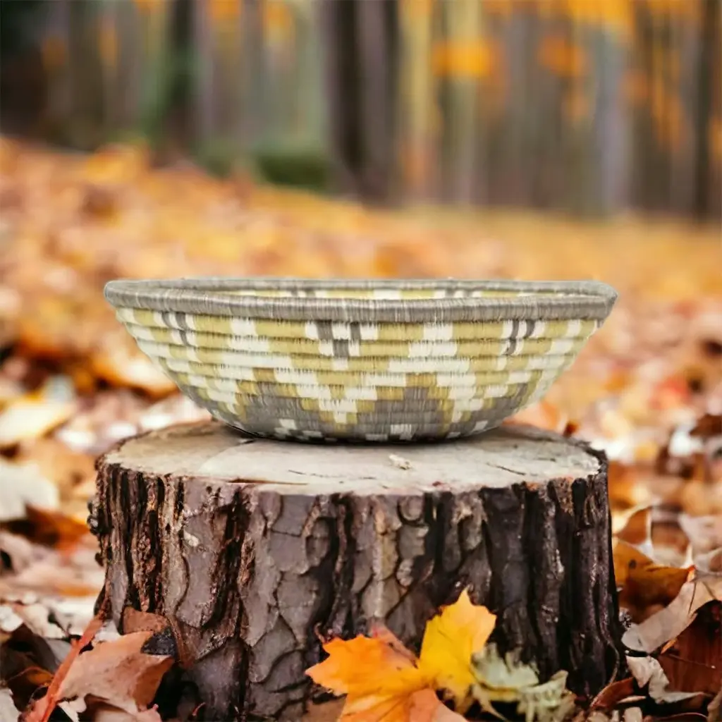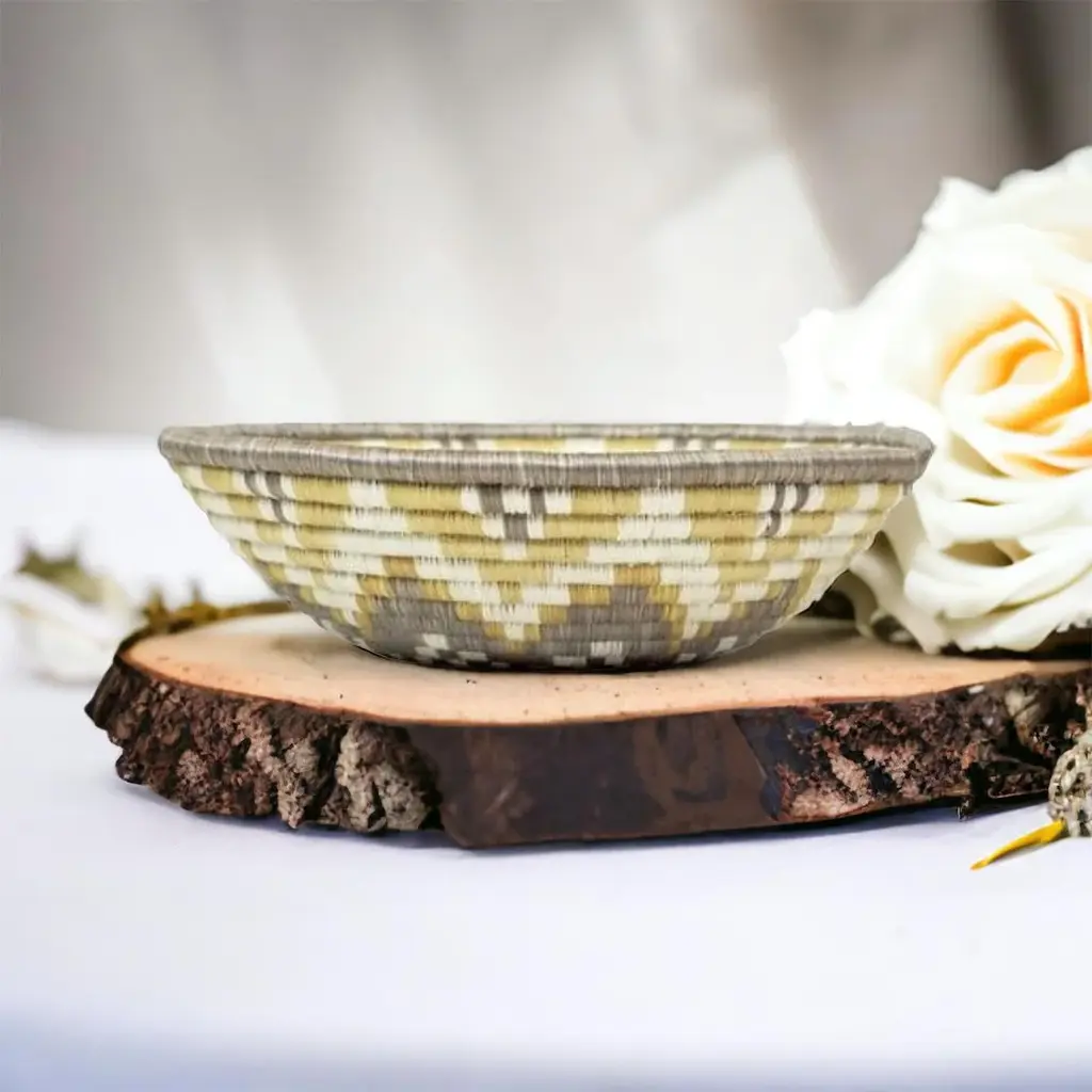 This perfect center piece Rwanda basket, African basket, Boho basket made of sweet grass and sisal. It can be used as bread/fruit bowl,wall art, wall decor. It comes with a loop in the back which, can be used as a wall hanging basket or given out as a gift. It's a stunning one-of-a-kind pieces rich in cultural meaning and purpose -- a perfect center piece, bread/fruit bowl, or wall hanging. Whether as a wall hanging or displayed as a centerpiece, these traditional baskets lend versatility around any home. Each bowl is intricately hand woven by The African Home Goods in Rwanda Baskets carry a special symbolism in Rwanda: friends give them to one another to celebrate milestones (weddings, births, etc.), and they are proudly displayed as a reflection of abundance in friendships, family and life. The linear rays emanating from the SUNRISE pattern of this basket paints a picture of dawn's first light peeking through the morning mist over the beautiful hills in Rwanda. The radiating light reveals stillness and peace, uniting the people of each region with a warm glow as they emerge from the dark of night. Approximately 12” W x 2.5” H. Safe to use with food. Includes a hang loop on the back for option of wall decor. Made by hand in Rwanda using organic dyes and all natural fibers of sisal and sweet grass. *All products are made by hand with love and vary slightly in color and size Care Instructions: Made of natural fibers and grass; do not submerge or wash with water. If necessary, use a damp cloth to wipe the basket clean.