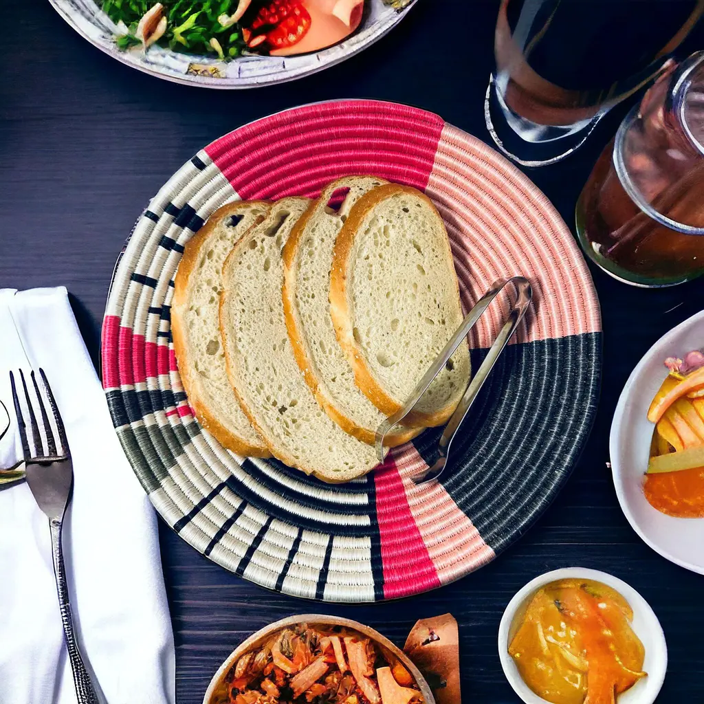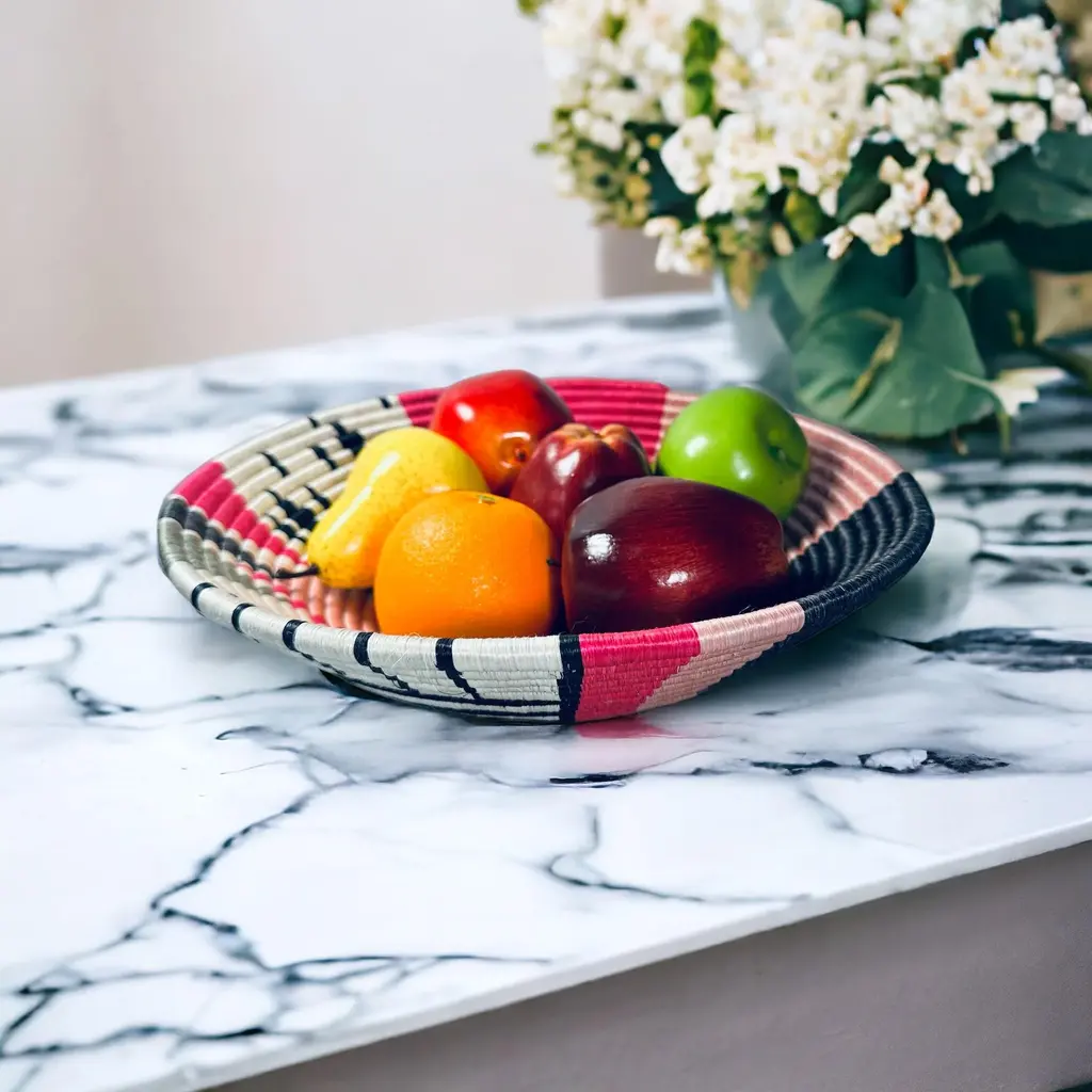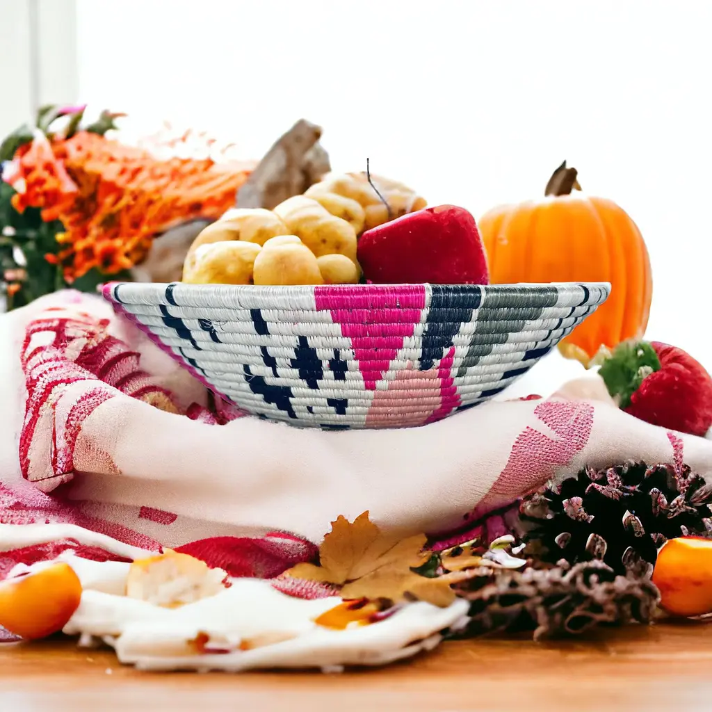 This perfect center piece Rwanda basket, African basket, Boho basket made of sweet grass and sisal. It can be used as bread/fruit bowl,wall art, wall decor. It comes with a loop in the back which, can be used as a wall hanging basket or given out as a gift. It's a stunning one-of-a-kind pieces rich in cultural meaning and purpose -- a perfect center piece, bread/fruit bowl, or wall hanging. Whether as a wall hanging or displayed as a centerpiece, these traditional baskets lend versatility around any home. Each bowl is intricately hand woven by The African Home Goods in Rwanda Baskets carry a special symbolism in Rwanda: friends give them to one another to celebrate milestones (weddings, births, etc.), and they are proudly displayed as a reflection of abundance in friendships, family and life. The linear rays emanating from the SUNRISE pattern of this basket paints a picture of dawn's first light peeking through the morning mist over the beautiful hills in Rwanda. The radiating light reveals stillness and peace, uniting the people of each region with a warm glow as they emerge from the dark of night. Approximately 12” W x 2.5” H. Safe to use with food. Includes a hang loop on the back for option of wall decor. Made by hand in Rwanda using organic dyes and all natural fibers of sisal and sweet grass. *All products are made by hand with love and vary slightly in color and size Care Instructions: Made of natural fibers and grass; do not submerge or wash with water. If necessary, use a damp cloth to wipe the basket clean.