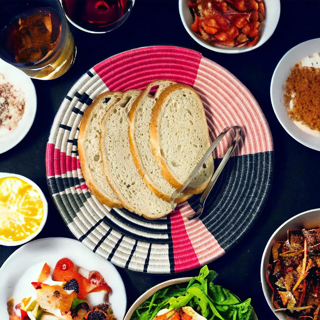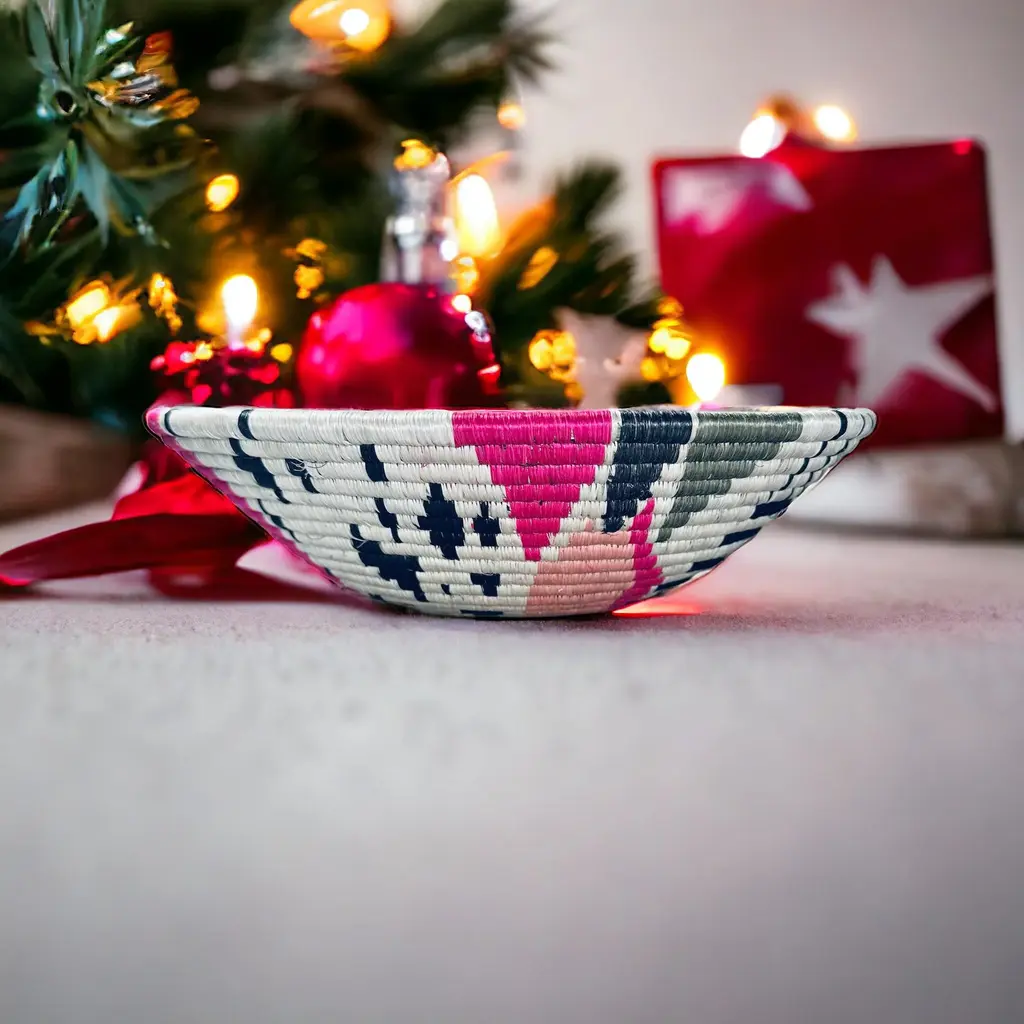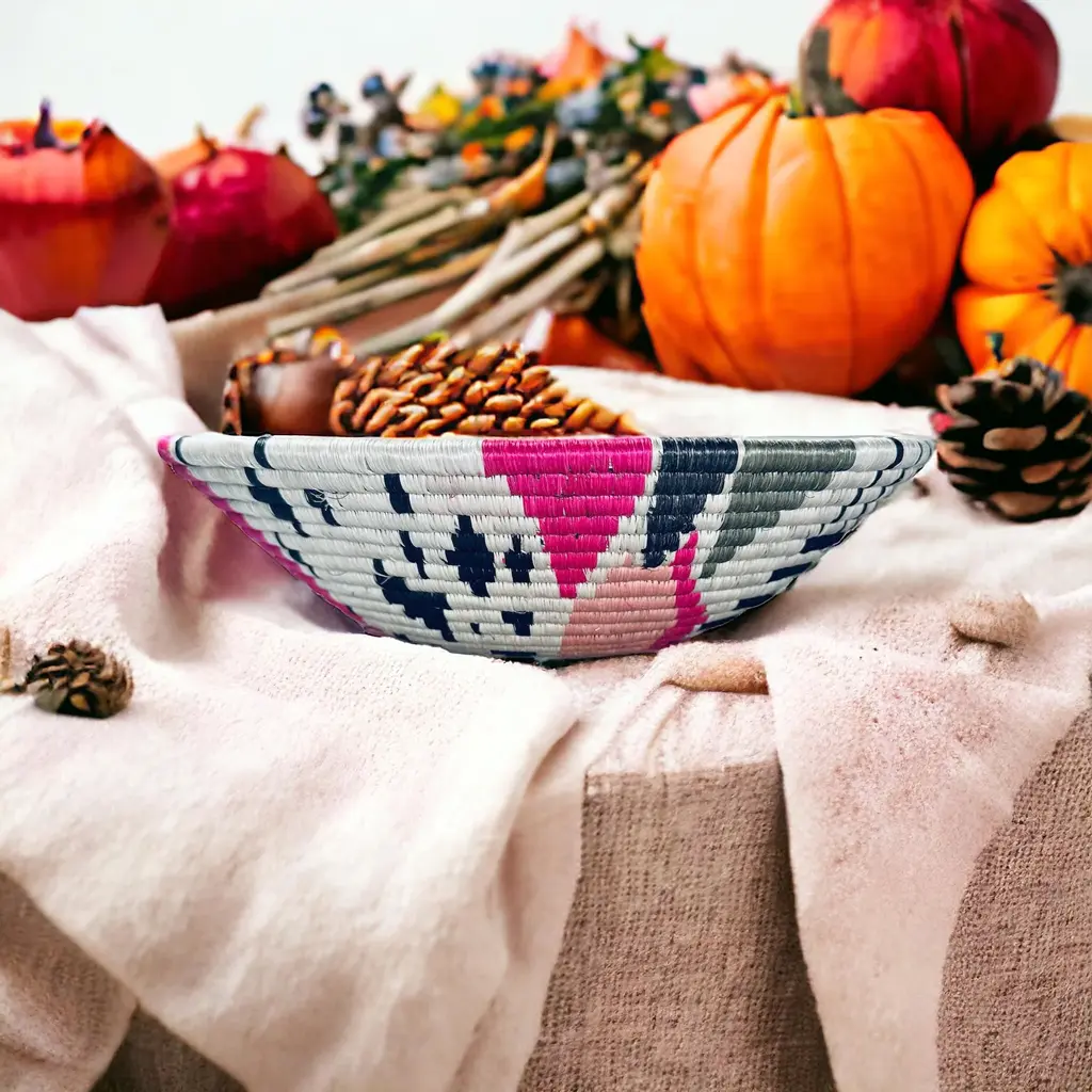 This perfect center piece Rwanda basket, African basket, Boho basket made of sweet grass and sisal. It can be used as bread/fruit bowl,wall art, wall decor. It comes with a loop in the back which, can be used as a wall hanging basket or given out as a gift. It's a stunning one-of-a-kind pieces rich in cultural meaning and purpose -- a perfect center piece, bread/fruit bowl, or wall hanging. Whether as a wall hanging or displayed as a centerpiece, these traditional baskets lend versatility around any home. Each bowl is intricately hand woven by The African Home Goods in Rwanda Baskets carry a special symbolism in Rwanda: friends give them to one another to celebrate milestones (weddings, births, etc.), and they are proudly displayed as a reflection of abundance in friendships, family and life. The linear rays emanating from the SUNRISE pattern of this basket paints a picture of dawn's first light peeking through the morning mist over the beautiful hills in Rwanda. The radiating light reveals stillness and peace, uniting the people of each region with a warm glow as they emerge from the dark of night. Approximately 12” W x 2.5” H. Safe to use with food. Includes a hang loop on the back for option of wall decor. Made by hand in Rwanda using organic dyes and all natural fibers of sisal and sweet grass. *All products are made by hand with love and vary slightly in color and size Care Instructions: Made of natural fibers and grass; do not submerge or wash with water. If necessary, use a damp cloth to wipe the basket clean.