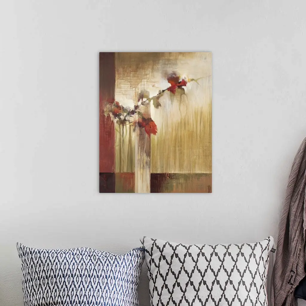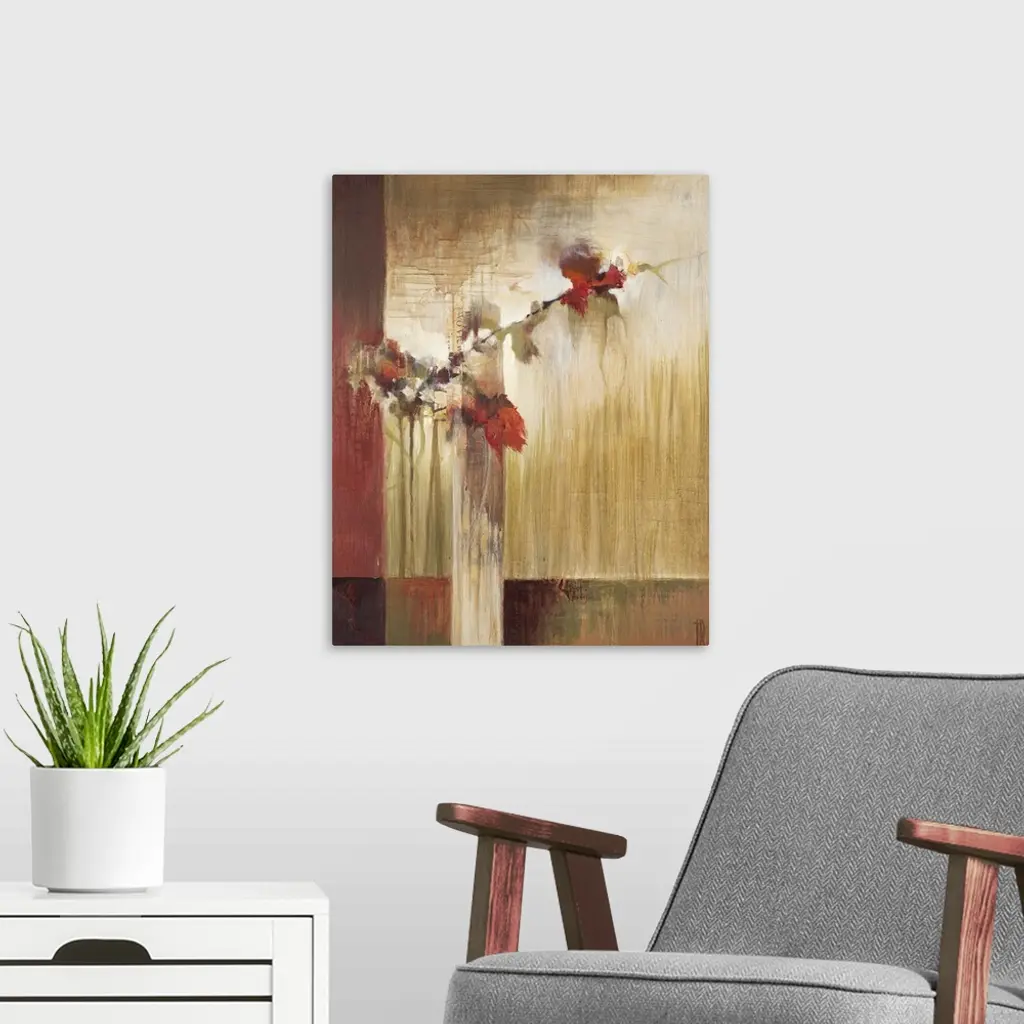 Contemporary painting of red flowers on a branch against an abstract muted background.