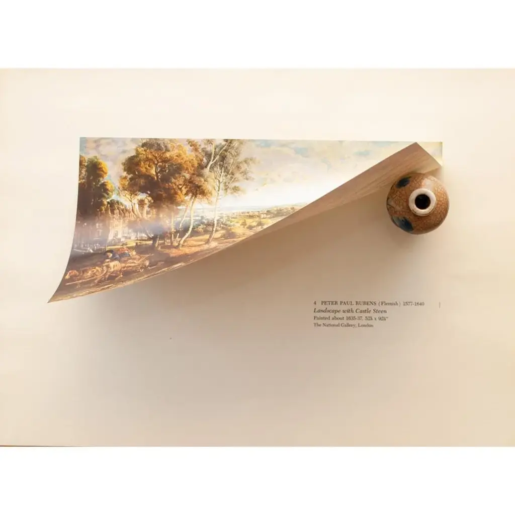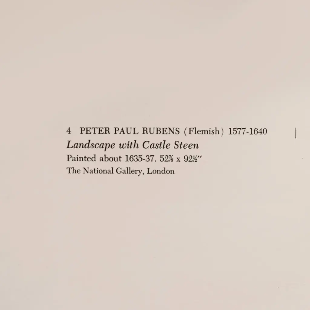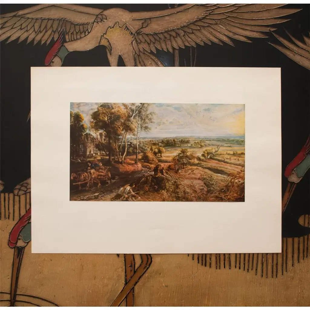 A lovely vintage First Edition Cottage Style offset lithograph after "Landscape With Castle Steen" by Peter Paul Rubens. Comes from a rare First Limited Edition art folio published in the 1950s. Printed on one side. Hand tipped on a board of heavy paper. Information regarding the original artwork will be found by lifting the plate. Excellent condition - minor edge wear on the board, never framed. Overall 14.75"W x 10.75"H Image 10.25"W x 5.75"H