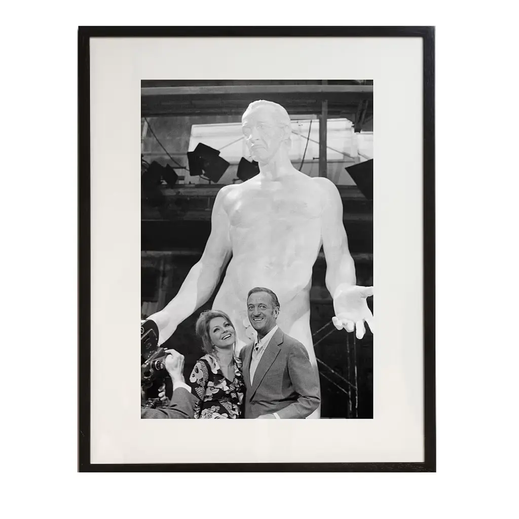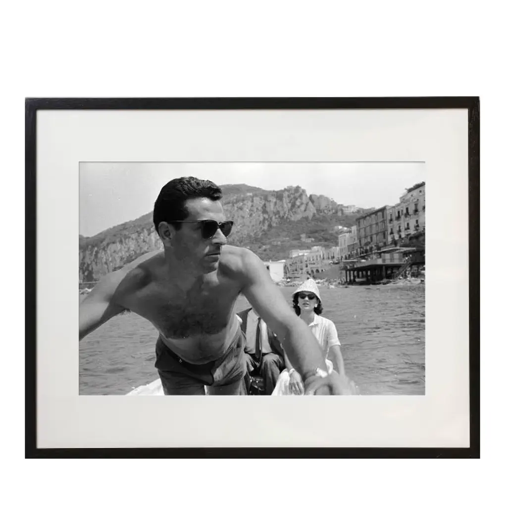 Behind the scenes of 'Caccia alla Volpe' ('After the Fox'), reunite with actors Victor Mature, Peter Sellers , and Italian director Vittorio de Sica from left to right. They have been photographed in Ischia, Italy where they were filming the movie. Mature was sitting on a chair bearing the name of his character, Tony Powell. The print on barysta paper (12x16" / 30x40 cm) includes a traditional wood frame (16x23x2" / 40x58x5 cm). Photo by Keystone/Hulton Archive/Getty Images. Accompanied by certificate of authenticity.