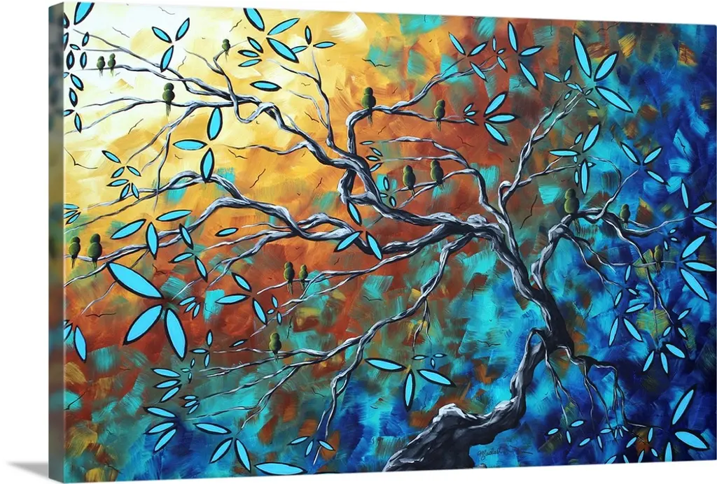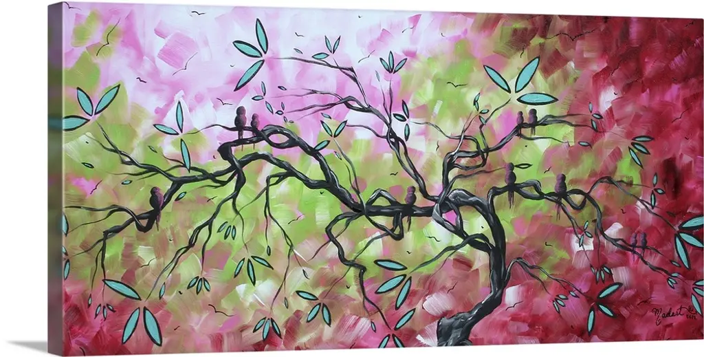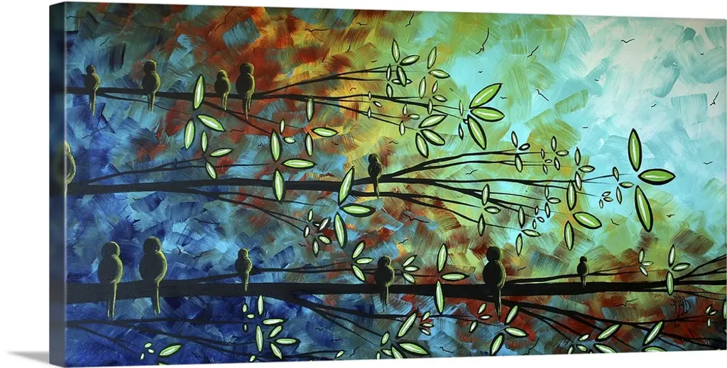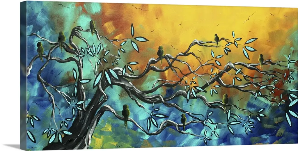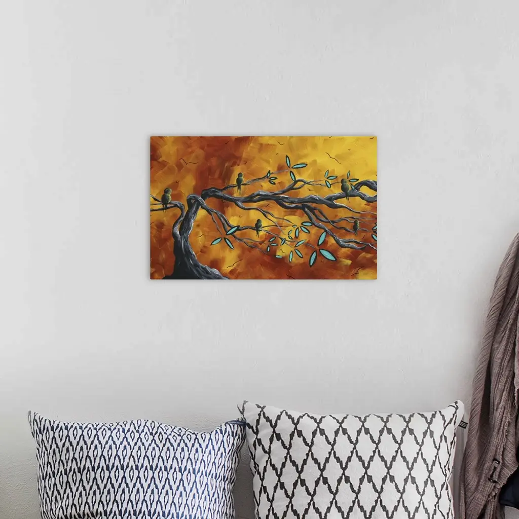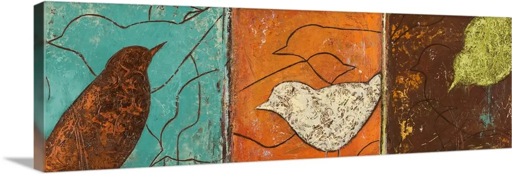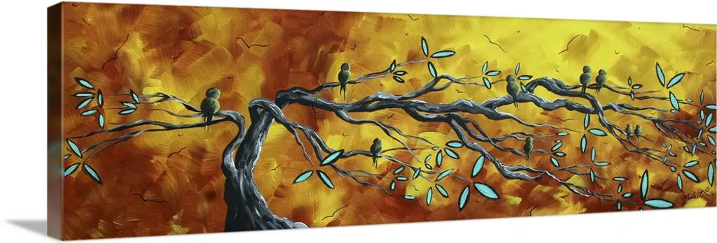 Canvas painting of five birds sitting on tree branches with a warm sunset made up of broad brush strokes in the background.