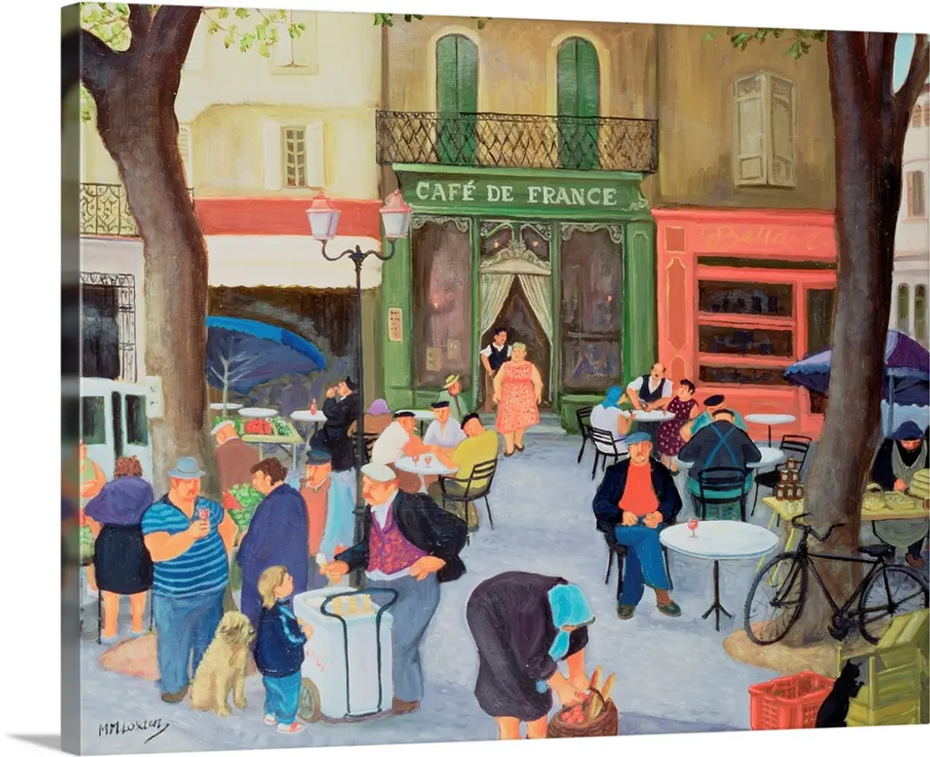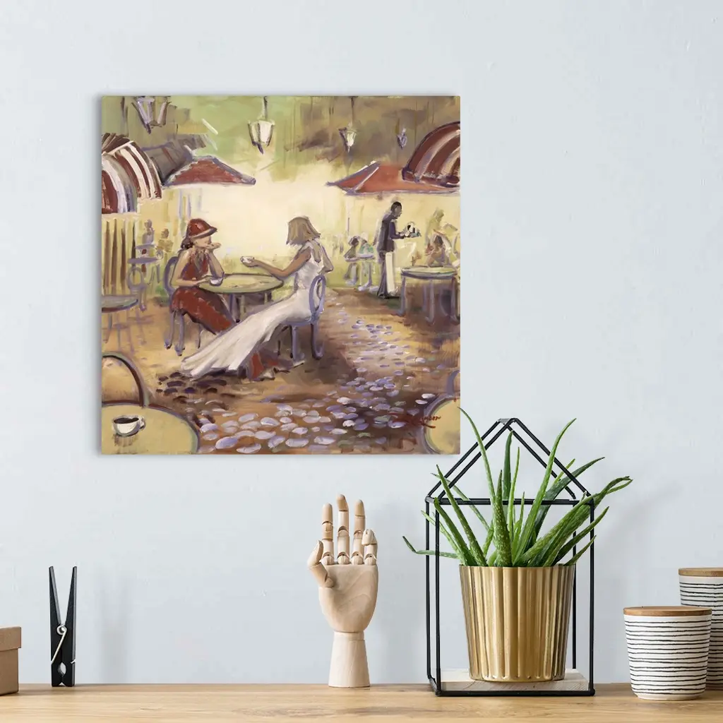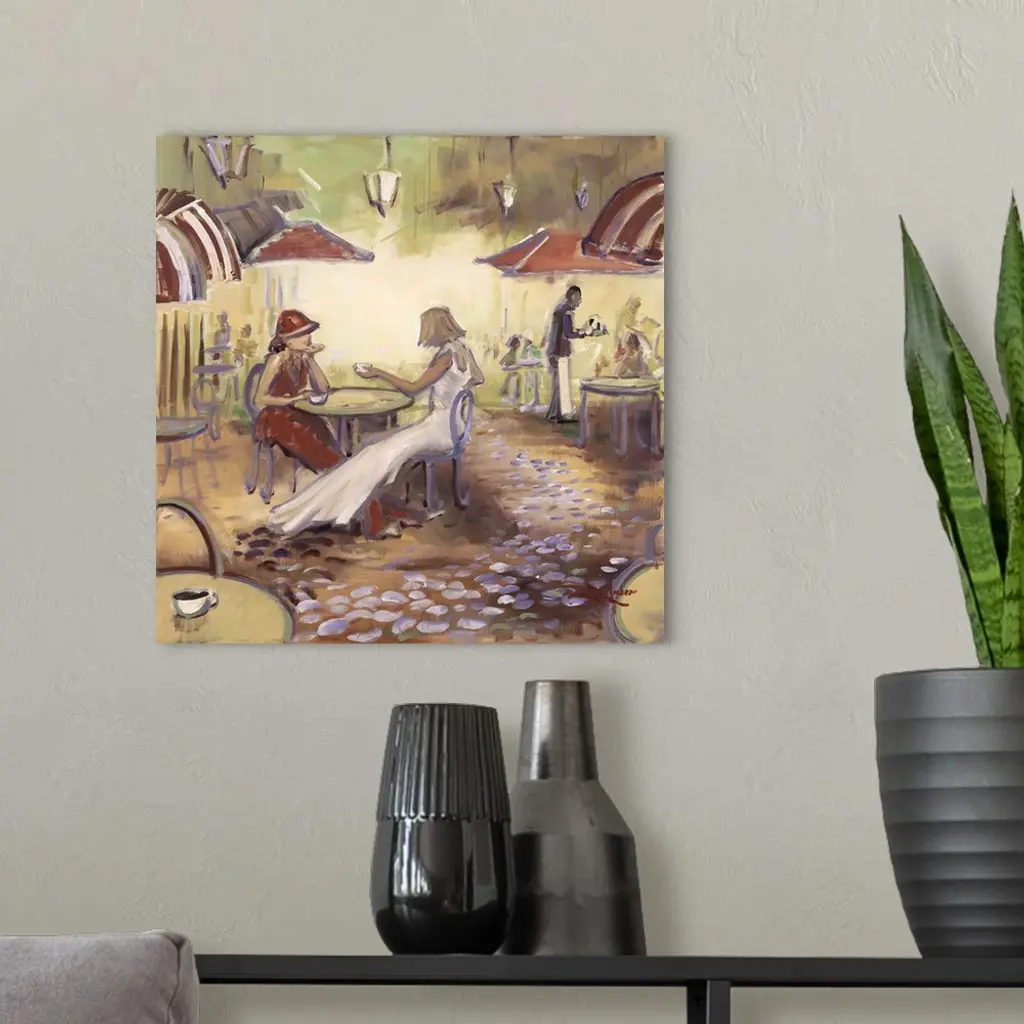 Contemporary artwork of two women in dresses sitting at a cafe.