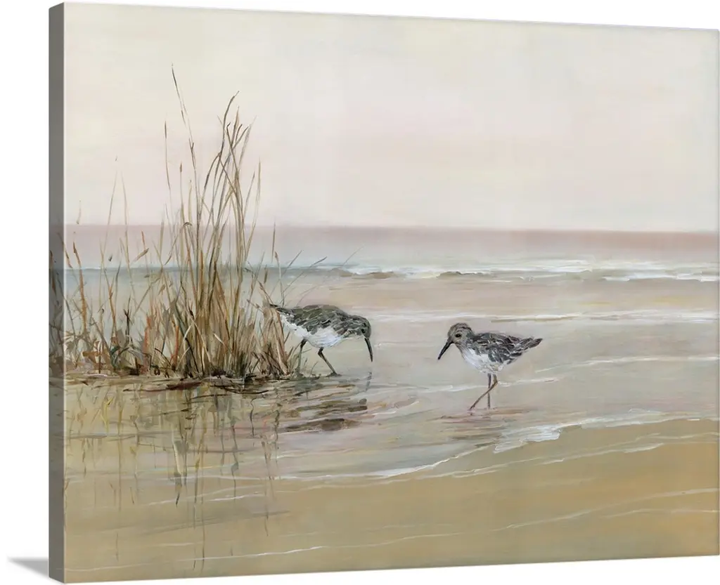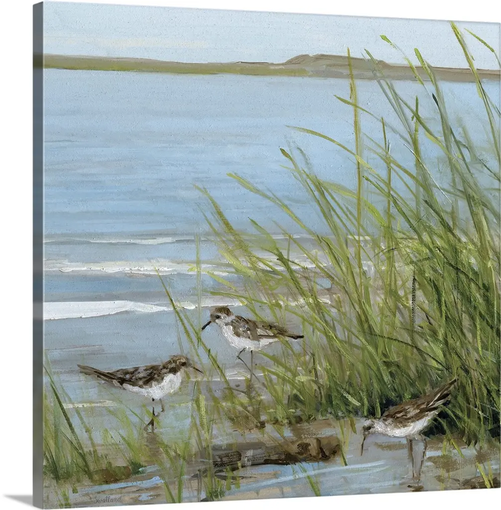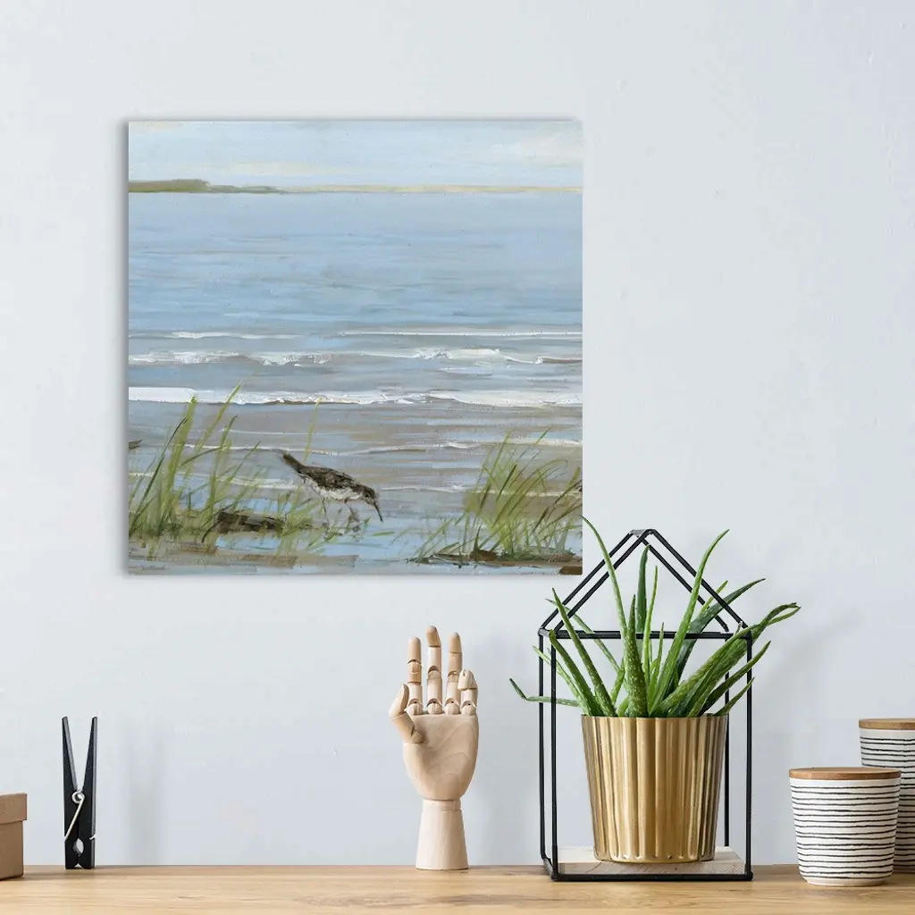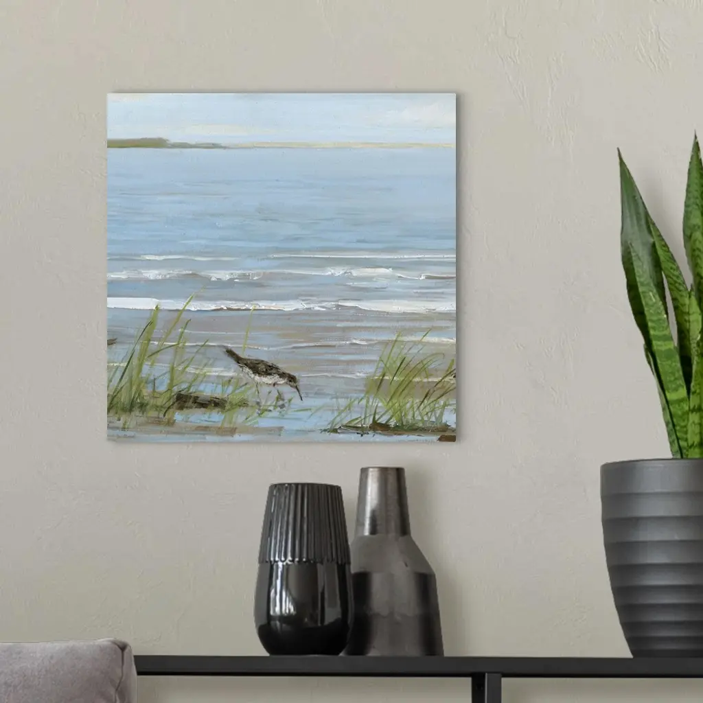 Contemporary square painting of a seabird grazing a shallow shore with small waves in the background.