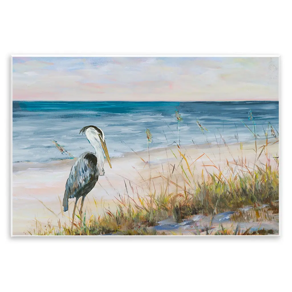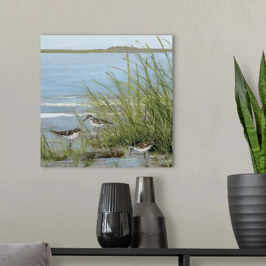 Contemporary painting of seabirds grazing in a grassy sound with small waves breaking in the background.