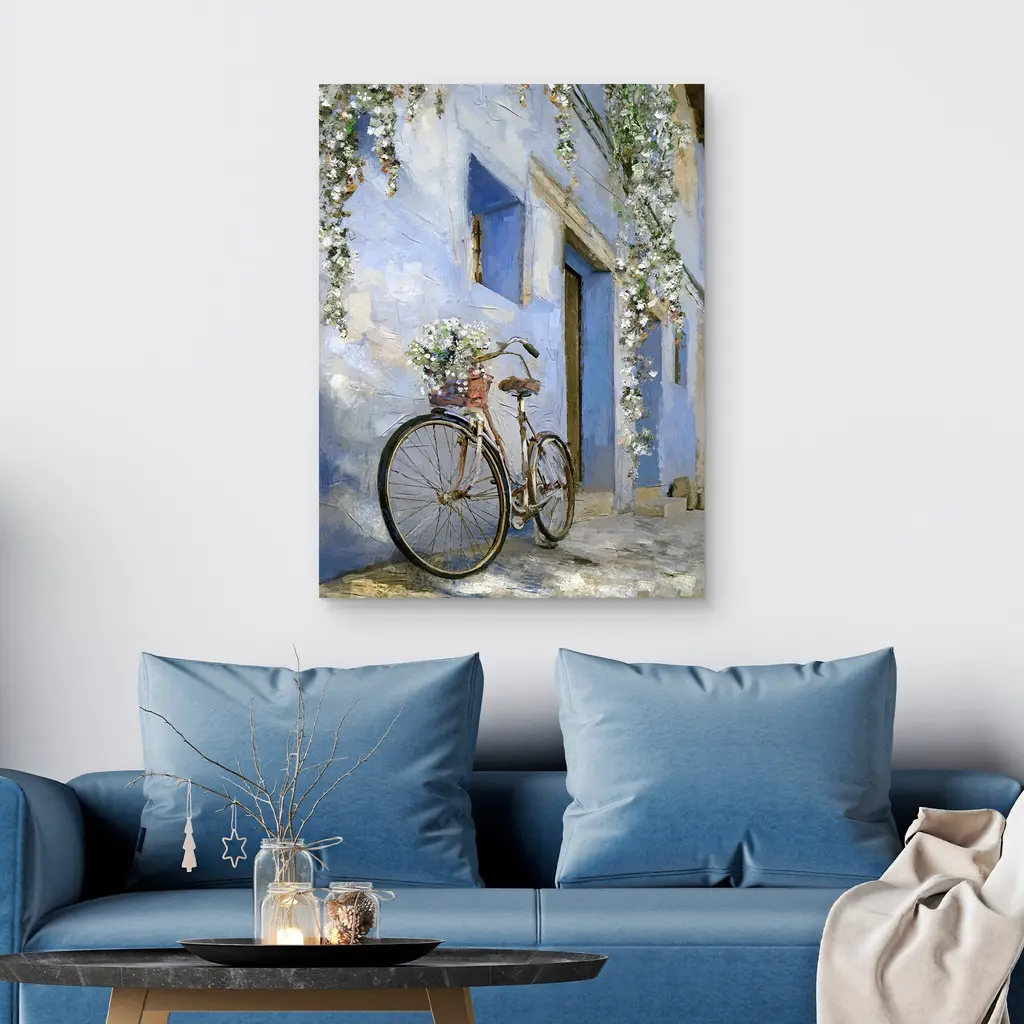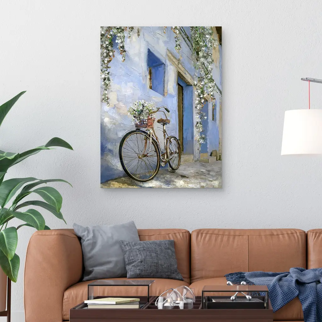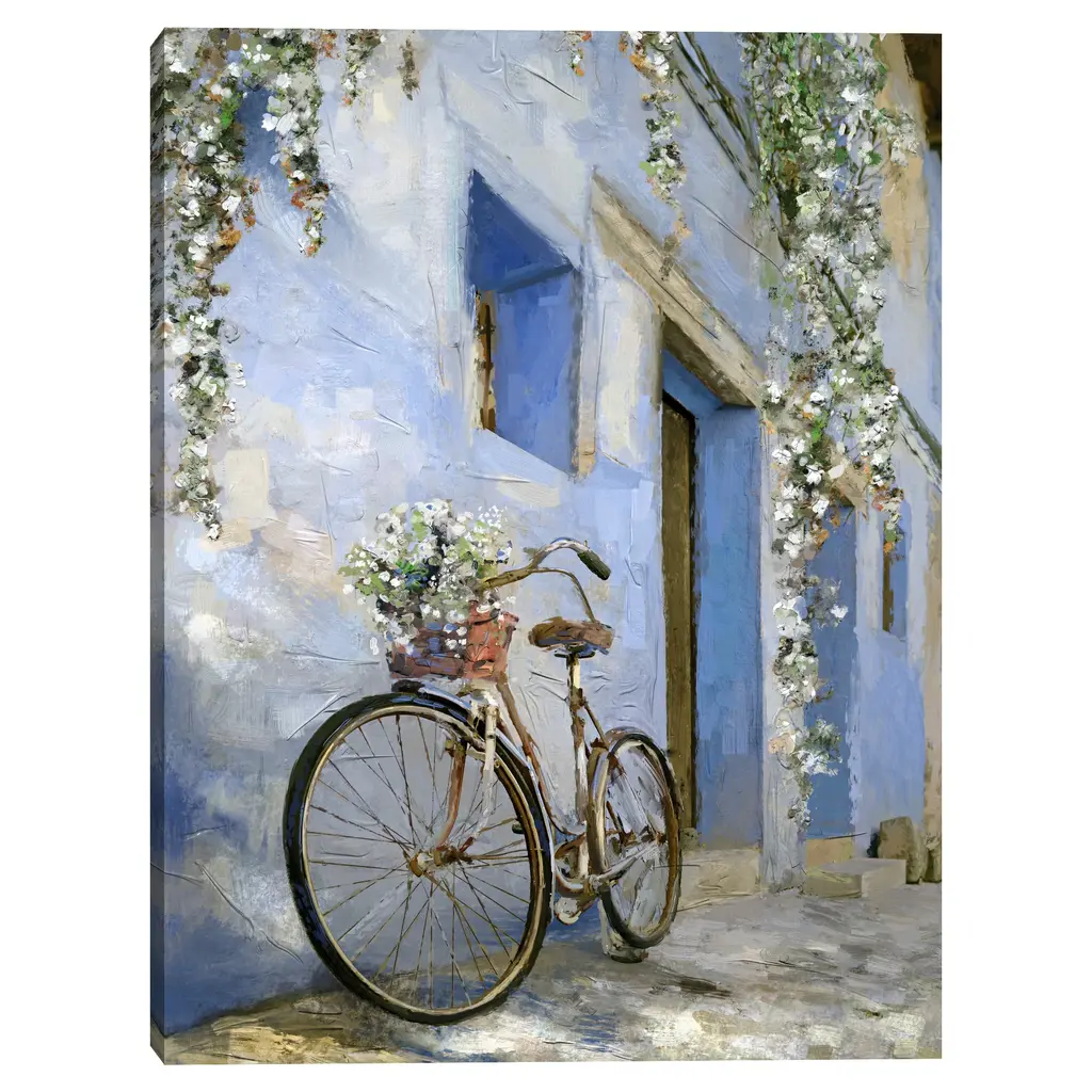 A vintage bicycle leans against the weathered facade of a rustic blue and gray home fringed with dainty florals. The momentary break of a delightful bike ride to collect flowers is the scene of Afternoon Pause by Studio Arts. For a more European feel, hang this canvas art print in your most precious space.
