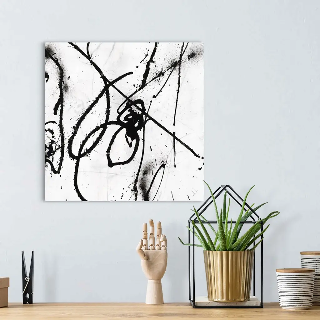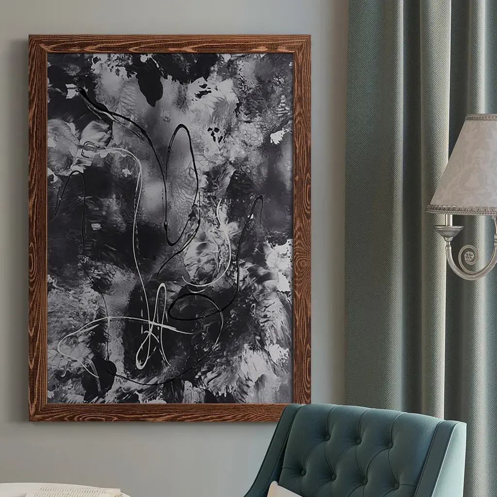 Black and white abstract painting of black strokes of paint in wandering directions.