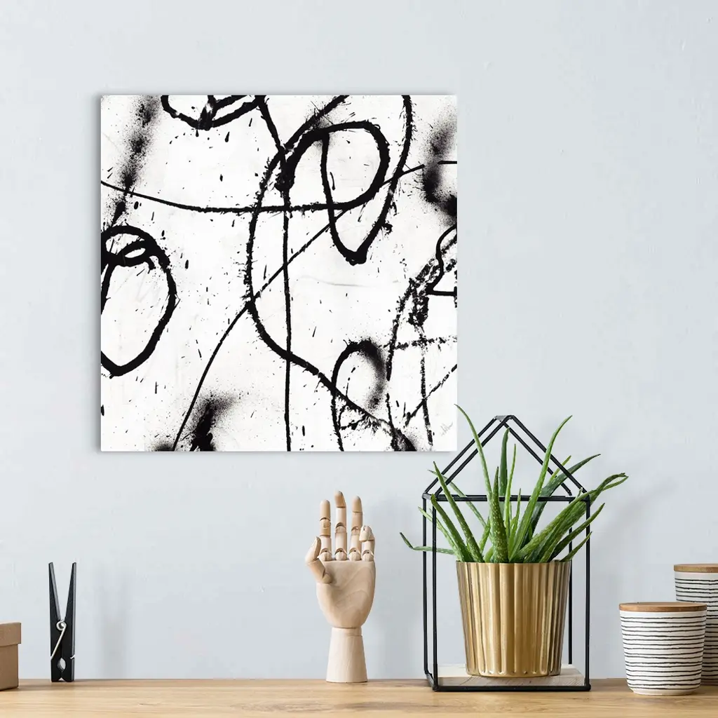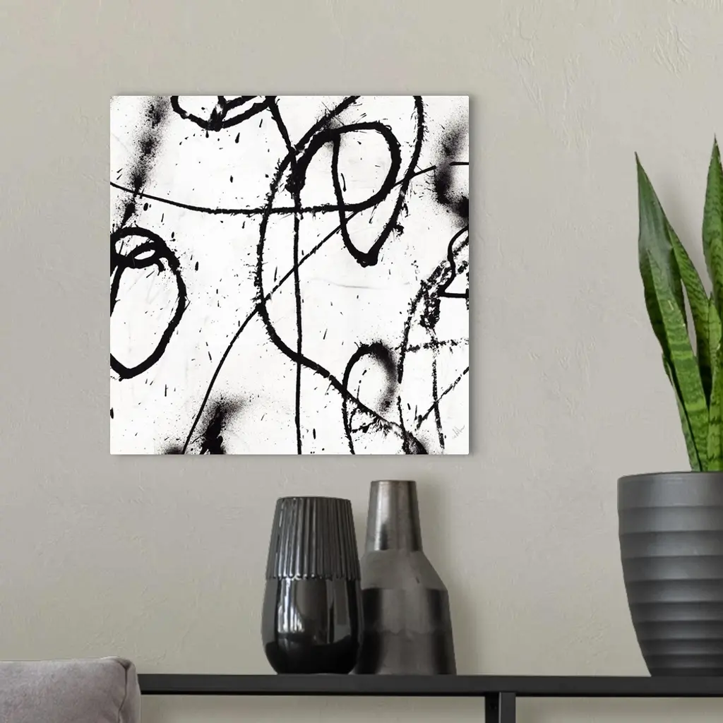 Black and white abstract painting of black strokes of paint in wandering directions.