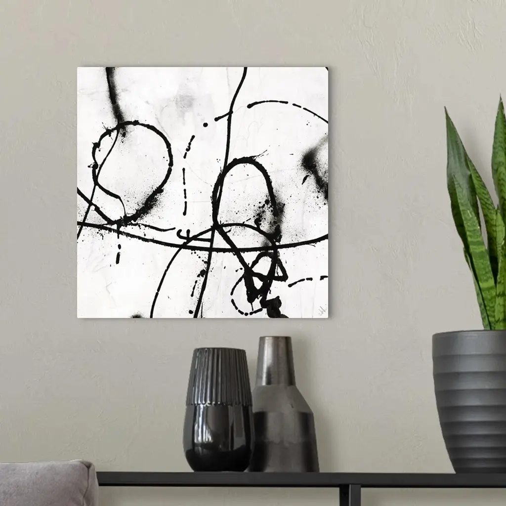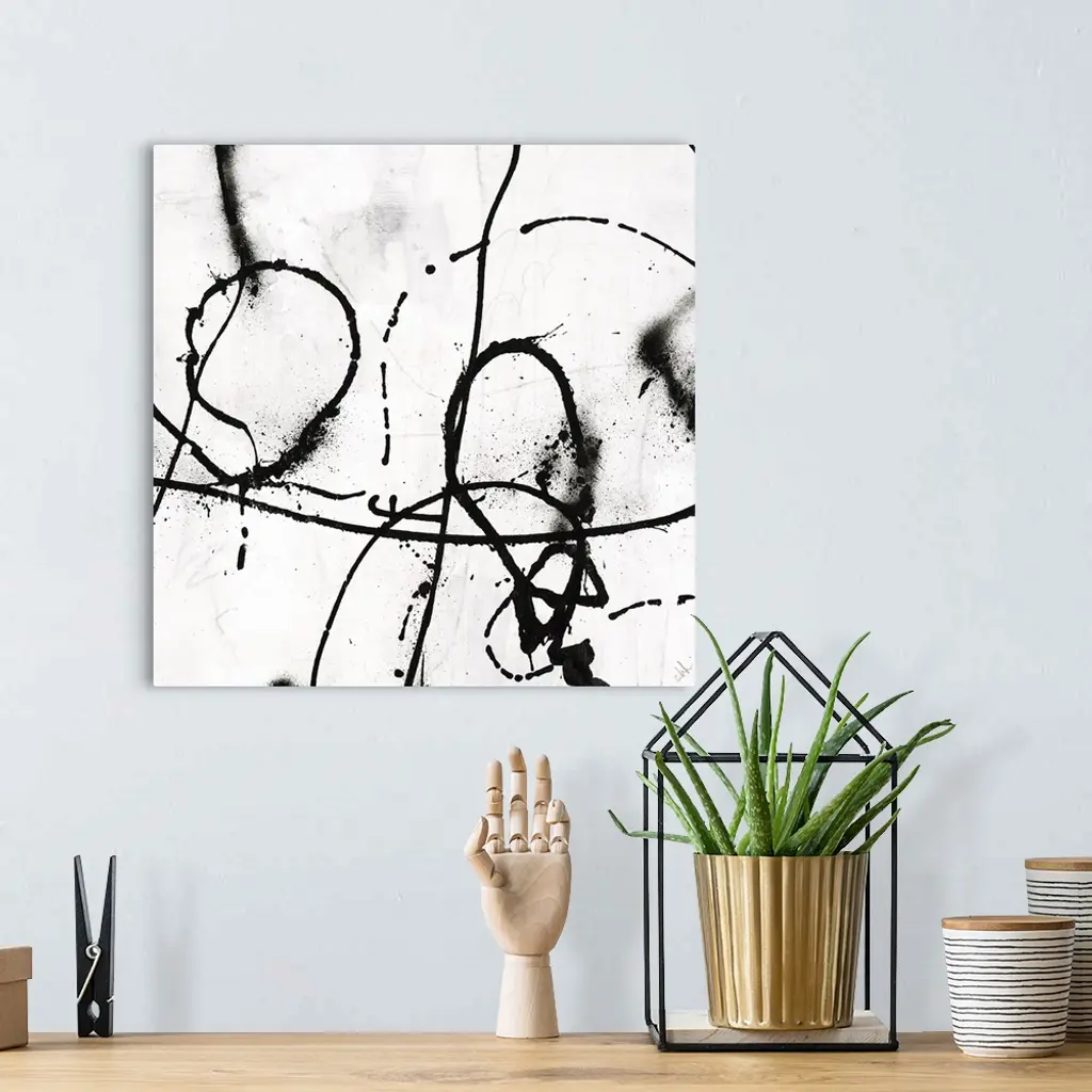 Black and white abstract painting of black strokes of paint in wandering directions.