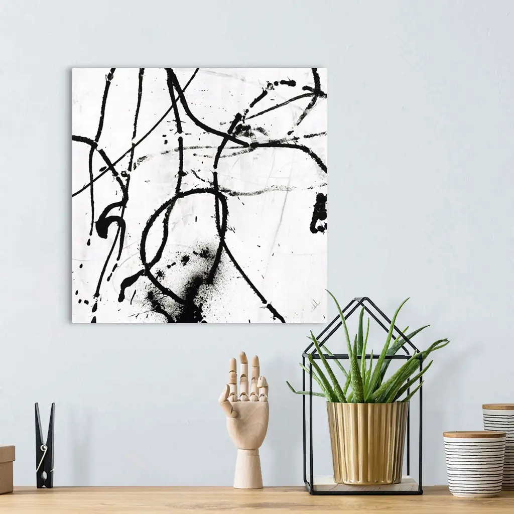 Black and white abstract painting of black strokes of paint in wandering directions.