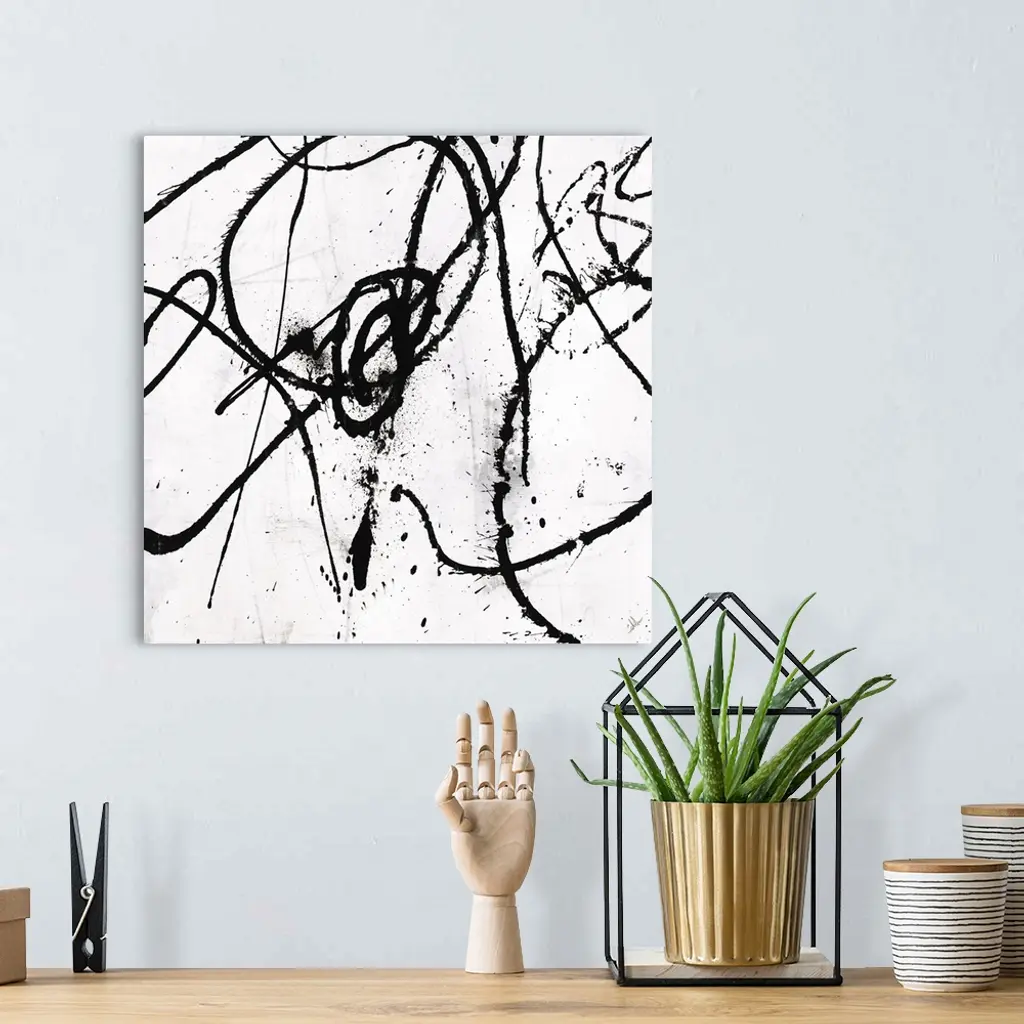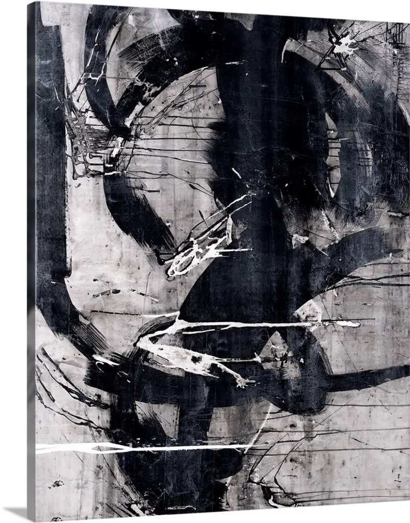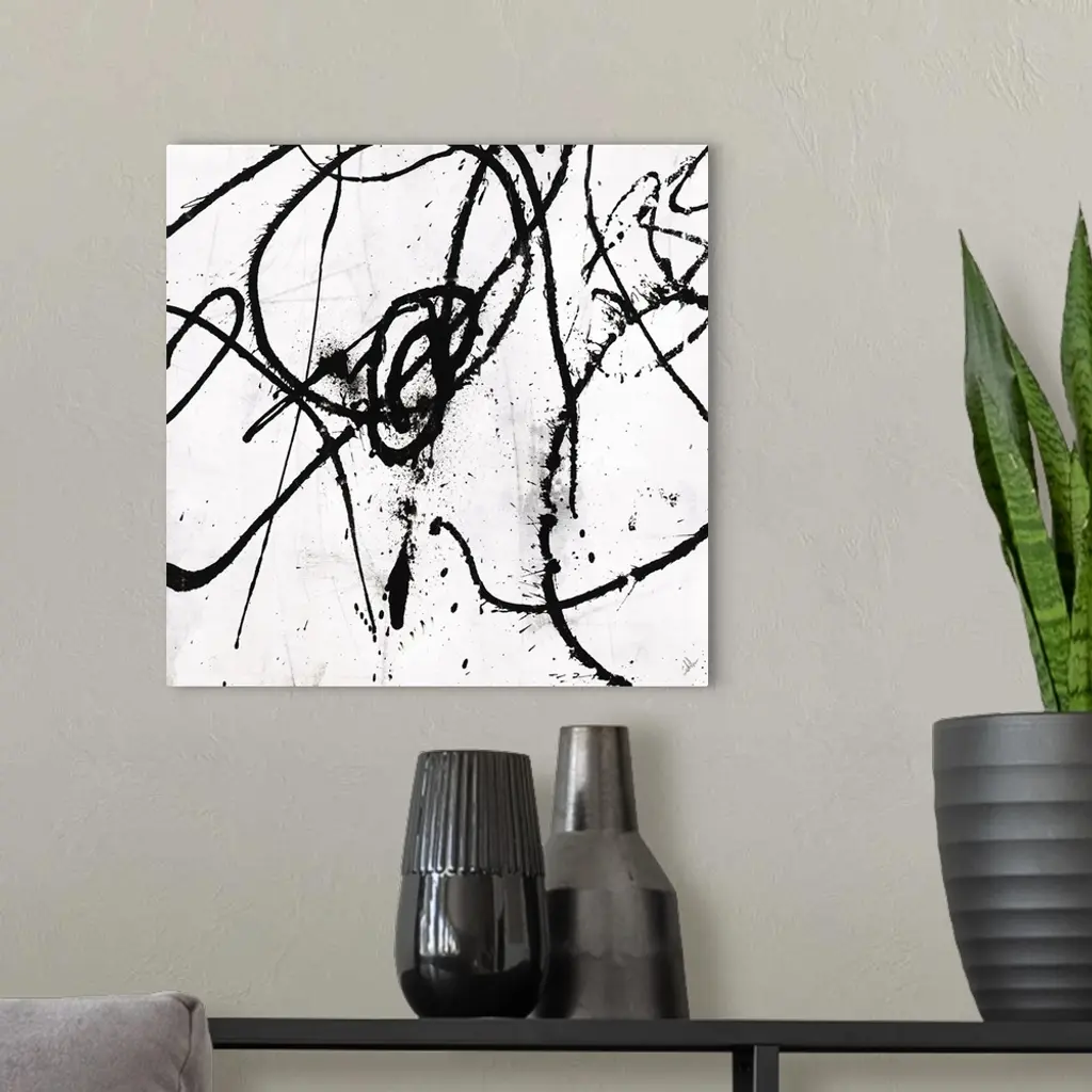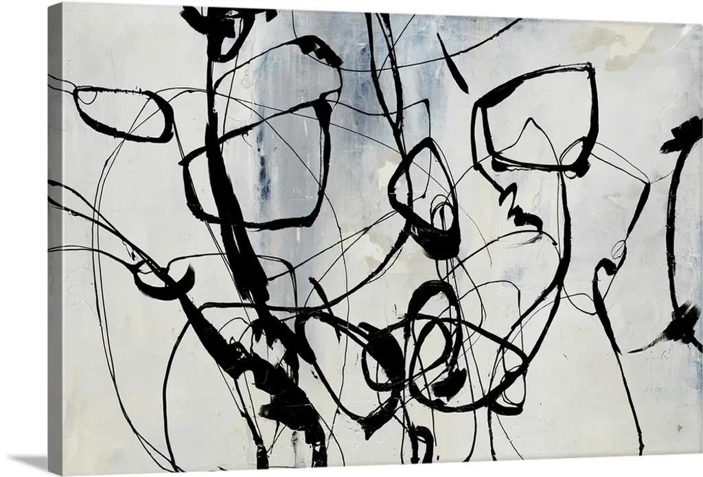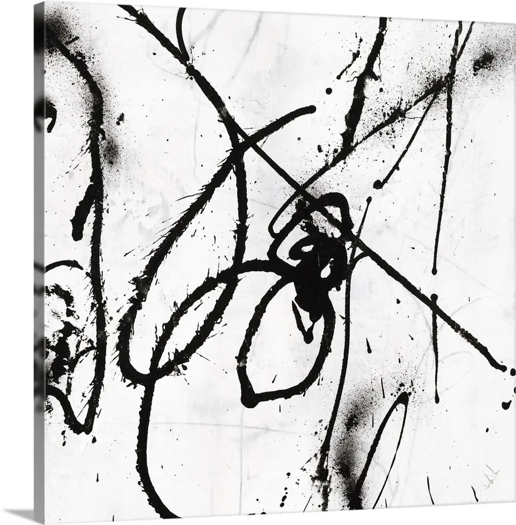 Black and white abstract painting of black strokes of paint in wandering directions.