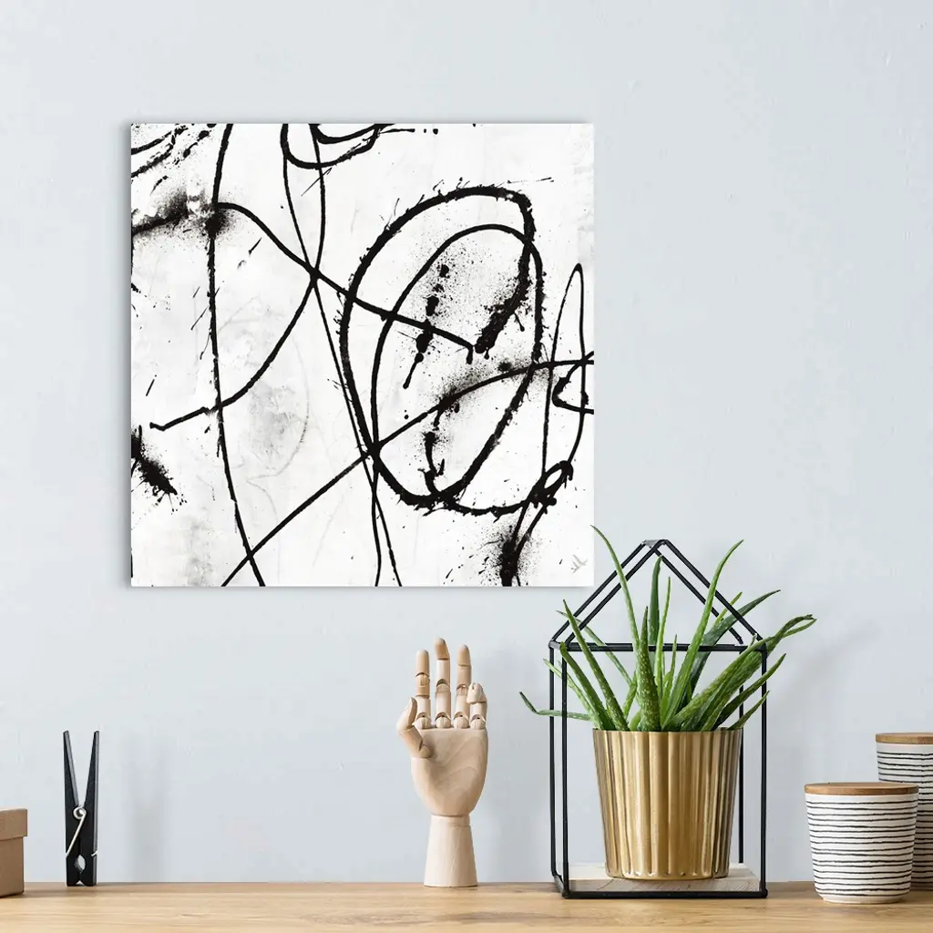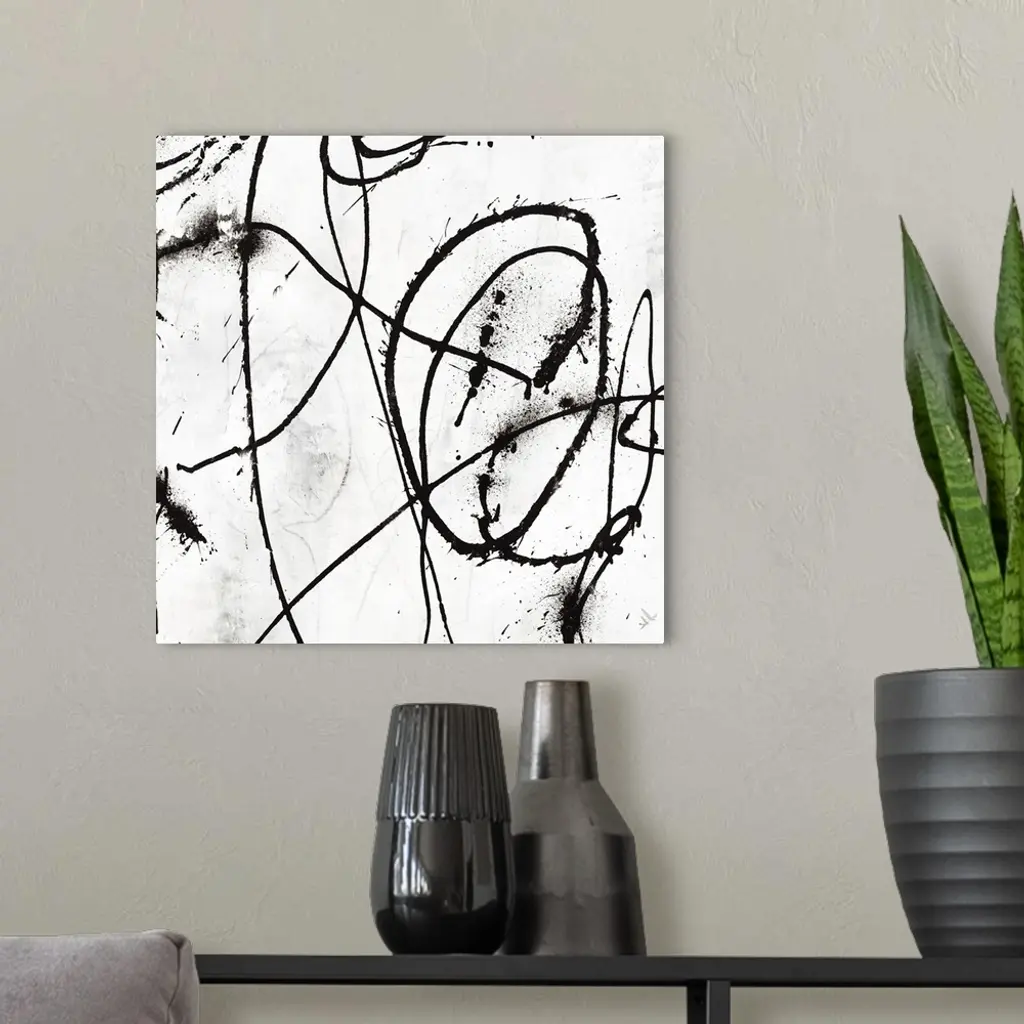 Black and white abstract painting of black strokes of paint in wandering directions.