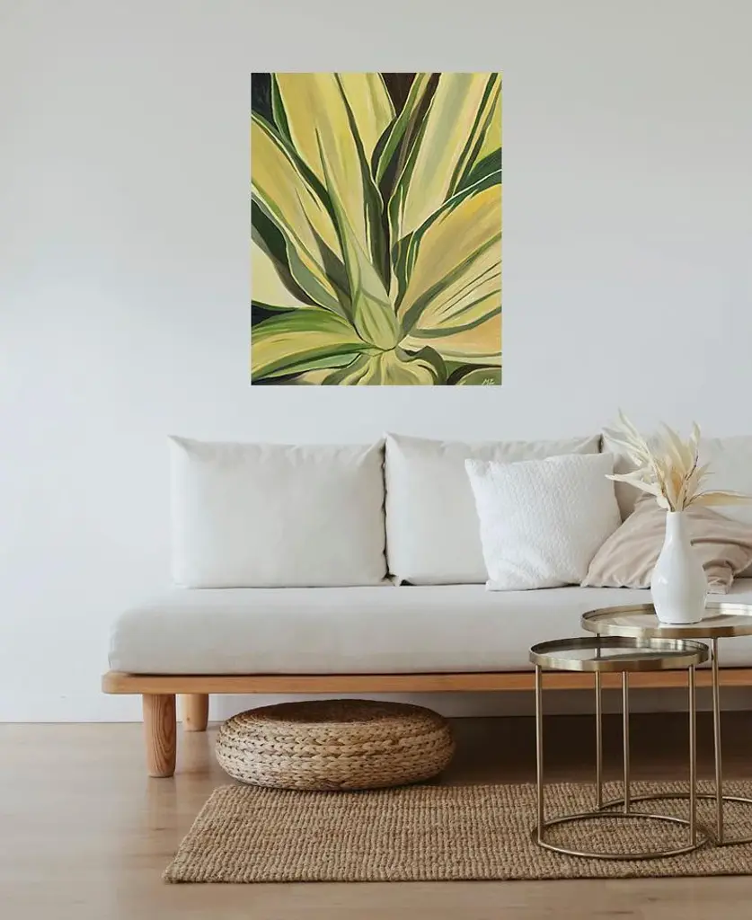 ‘Agave’ is a striking botanical study rendered in lush, layered green tones. The painting captures the sculptural beauty of the agave plant It’s sharp architectural leaves, fanning out in rythmatic formation, subtle variations of Jade, sage, and deep emerald give depth and movement to the foliage while the play of light and shadow adds a quiet drama. With its clean lines and bold presence, the work evokes both strength and serenity a homage to the enduring elegance of desert floral. This Giclee print on canvas is wired and ready to hang and signed on the front by the artist. The sides of the canvas are white Michele Zuzalek is a contemporary, abstract and landscape painter living and working in Santa Barbara, California and Washington DC. Her work is widely collected both nationally and internationally.