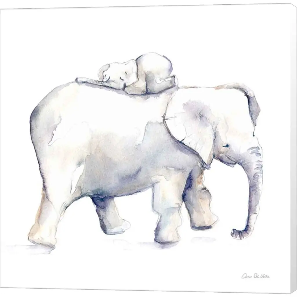 Baby Elephant Love III by Aimee Del Valle is a high quality piece of canvas artwork. The finished size of this piece is 12" X 12", and it has a depth 1.5". There is a UV protective coating over the entire image, and it is ready to hang on your wall with no hardware required. 100% Satisfaction Guaranteed.