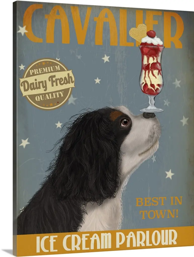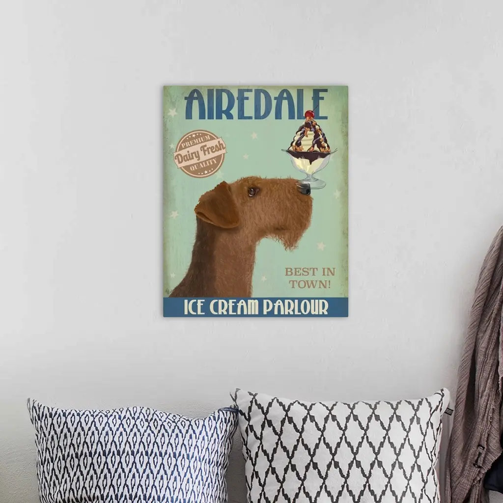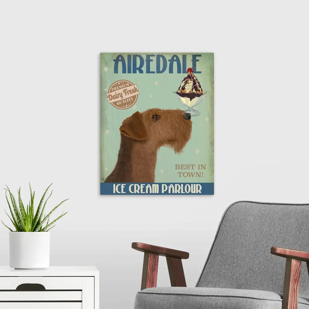 Decorative artwork of an Airedale balancing an ice cream sundae on its nose in an advertisement for an ice cream parlour.