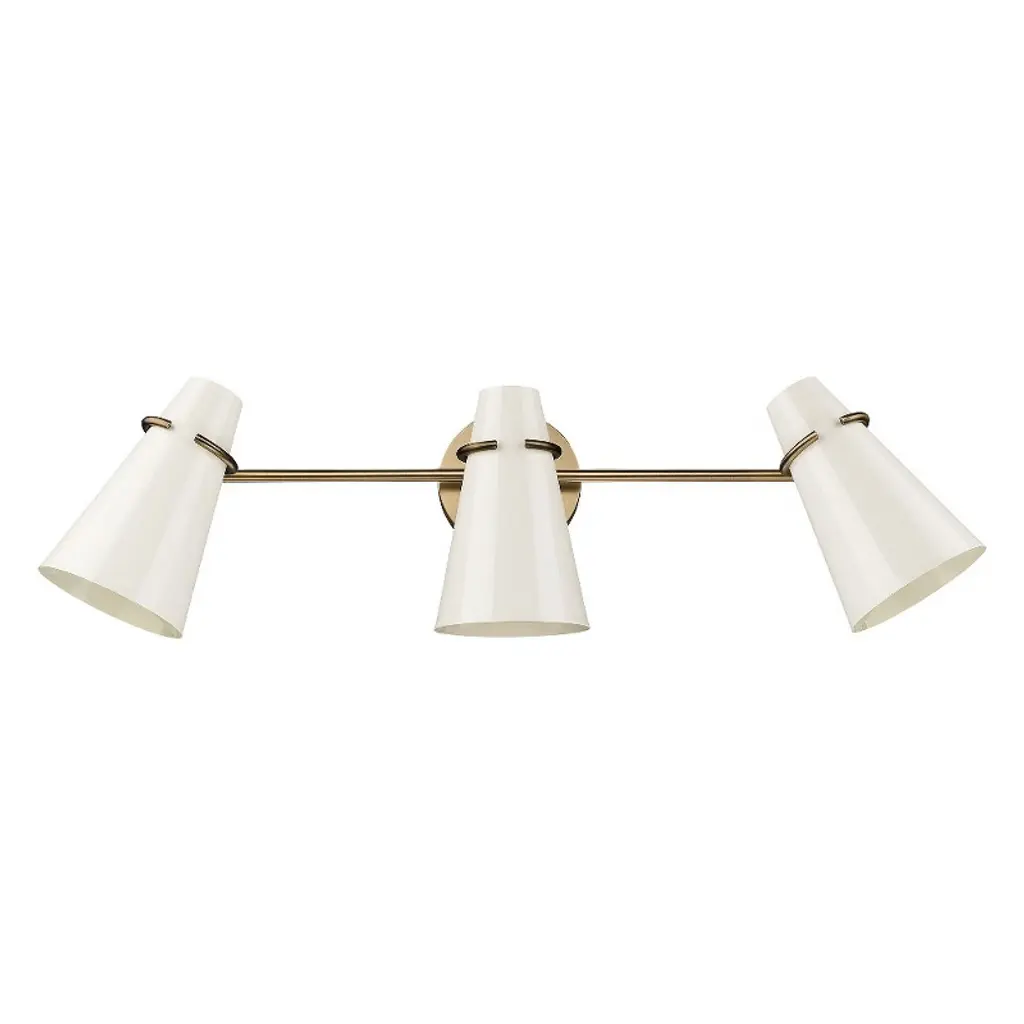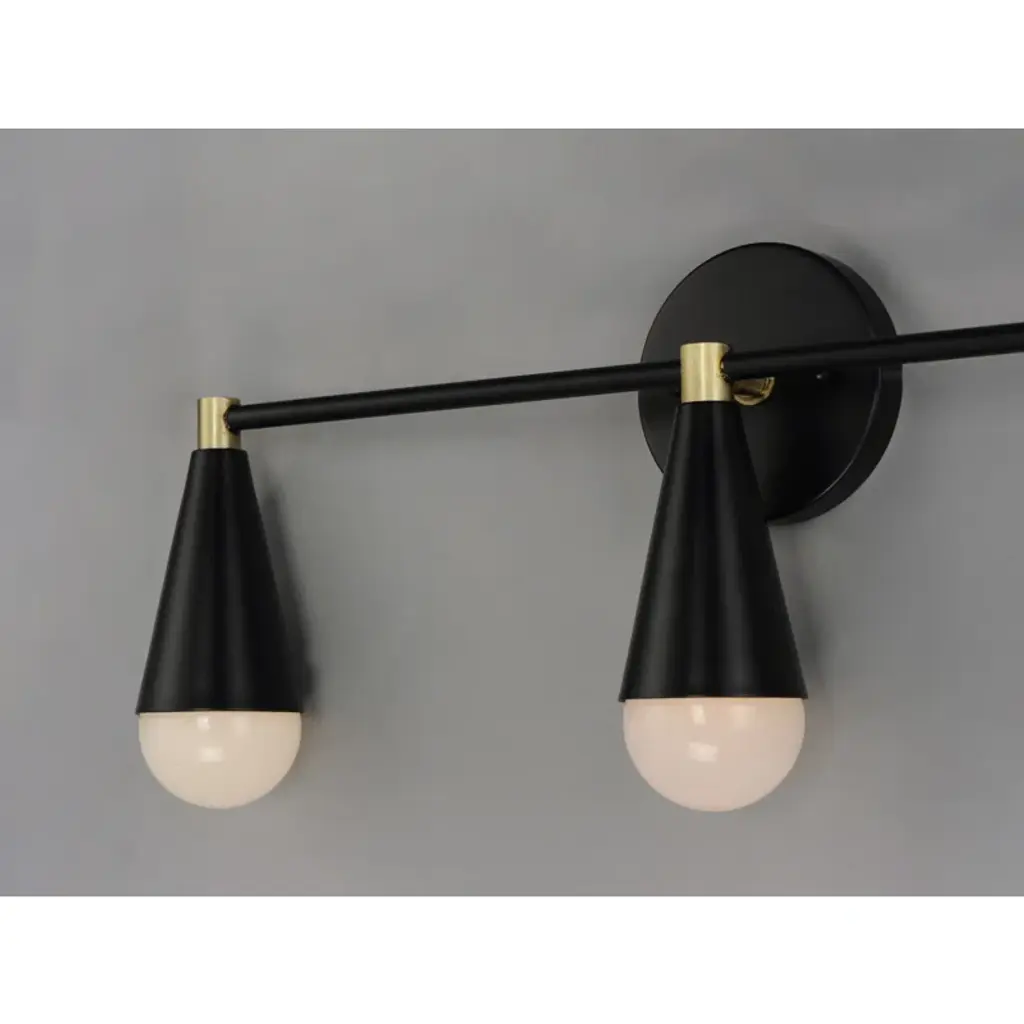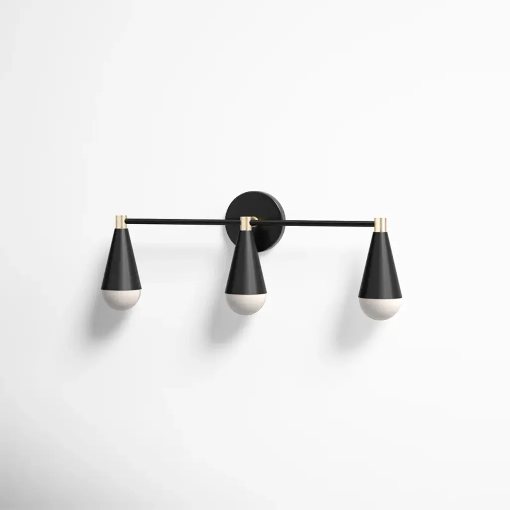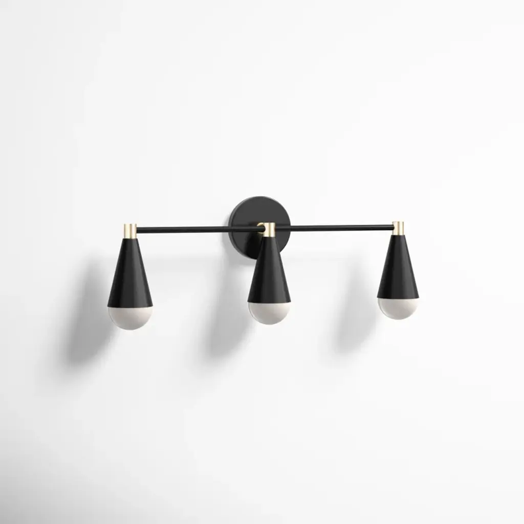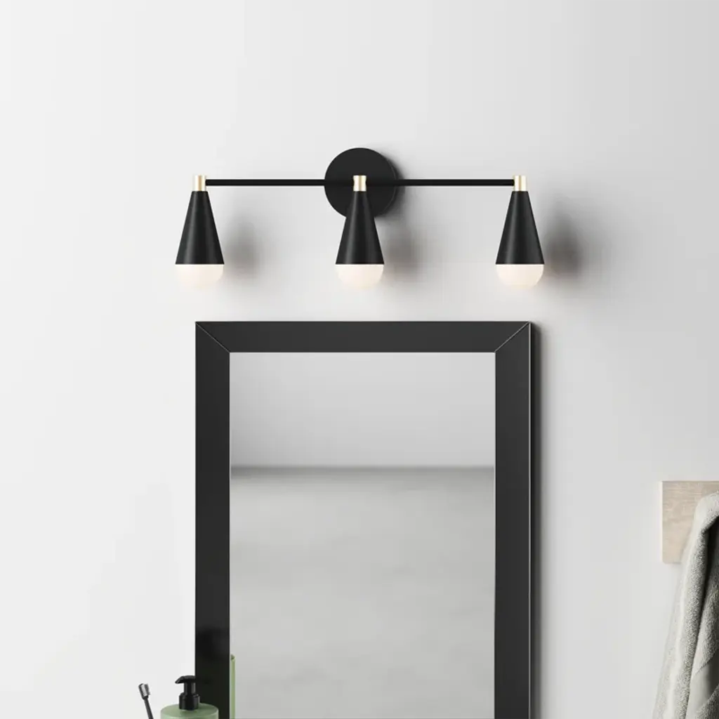 Add a mid-century vibe to your bathroom with this streamlined 3-light vanity light. Crafted with steel in a black finish, this fixture features three cone-shaped shades. They suspend from a slim rod attached to a circular backplate. Gold-finished cylindrical accents at the top of each shade add a hint of glam style. Inside each shade, a standard bulb (sold separately) nests inside to become an element of the design. This fixture's reversible mounting allows you to cast light upward or downward. Rated safe for damp spaces. Compatible with a dimmer switch.