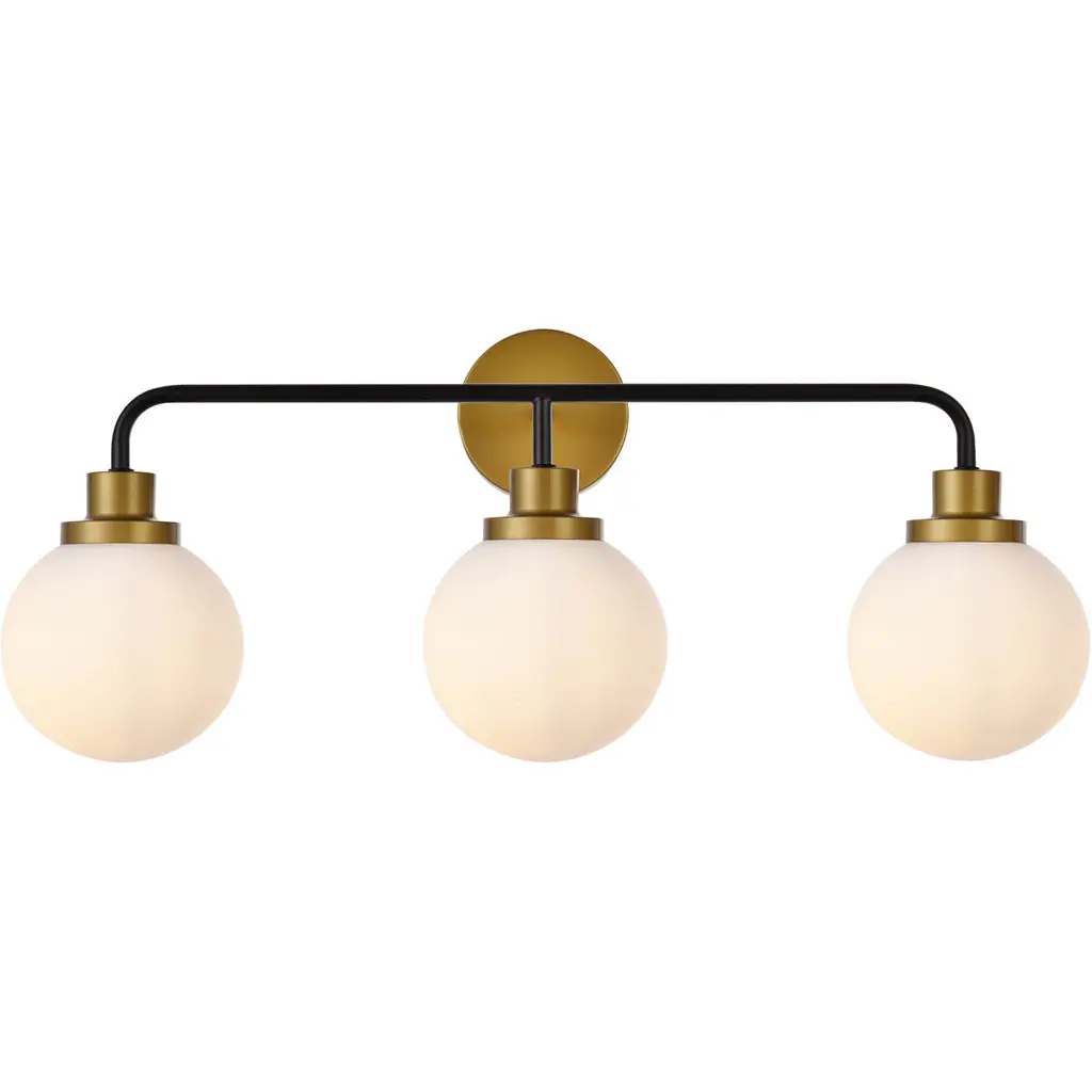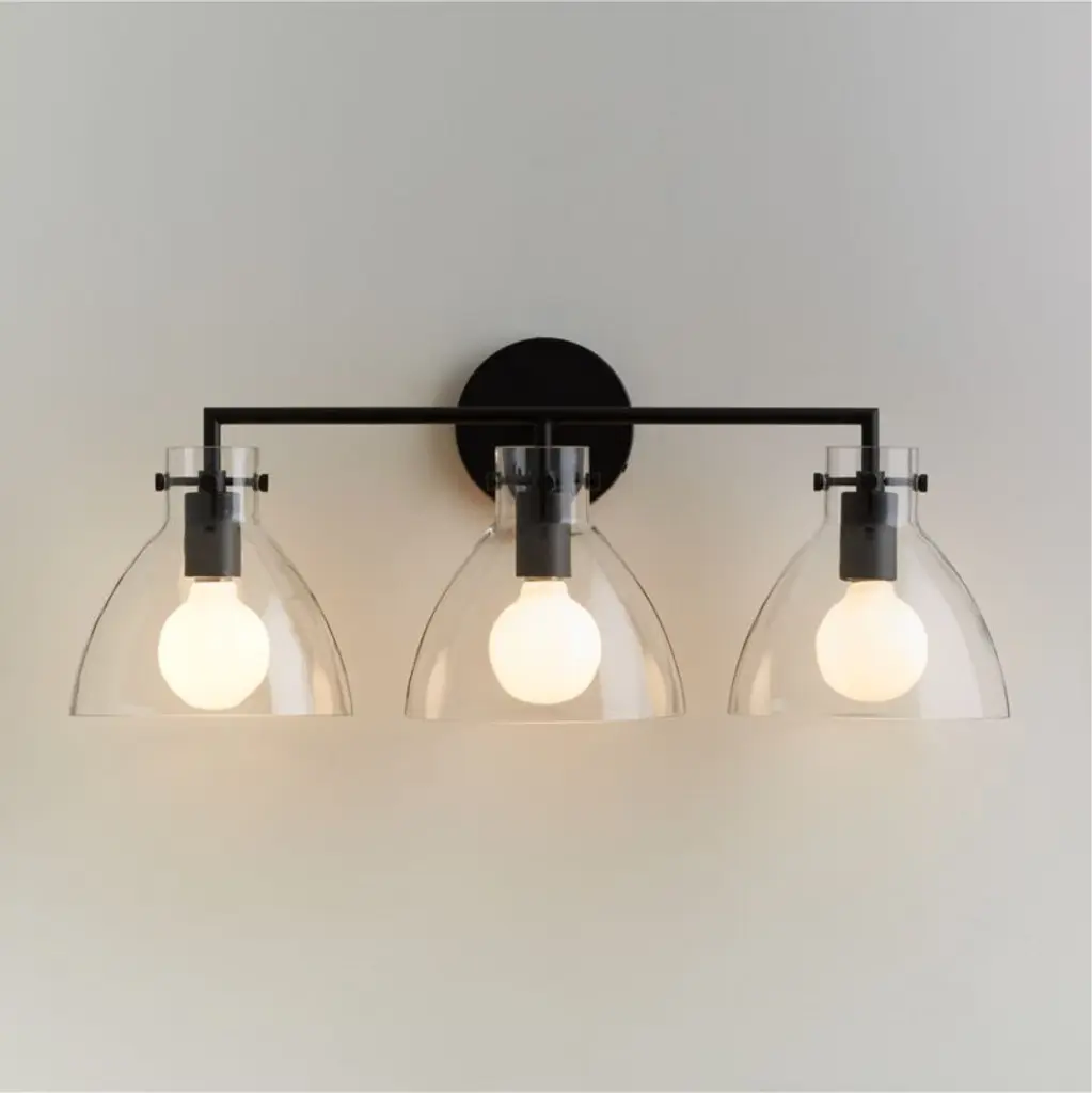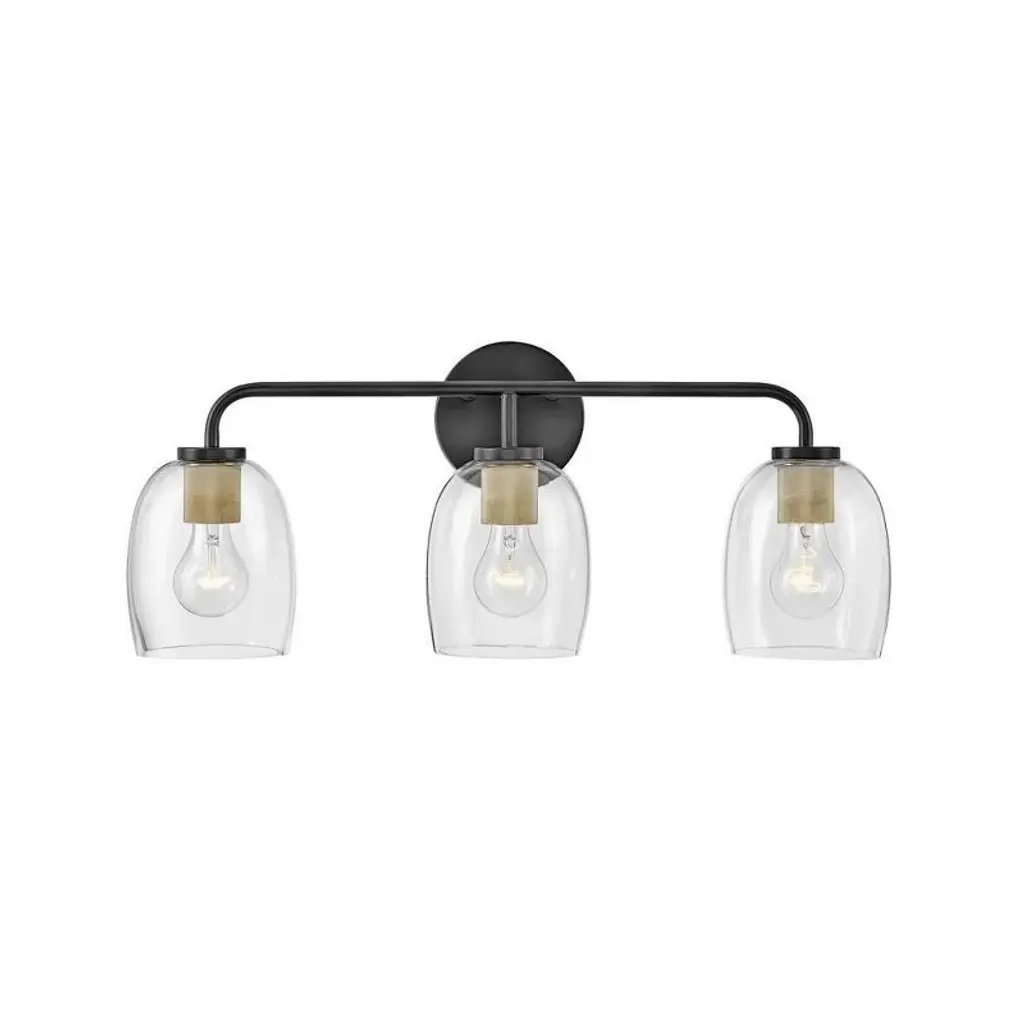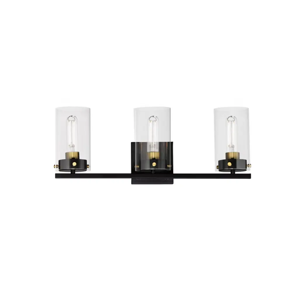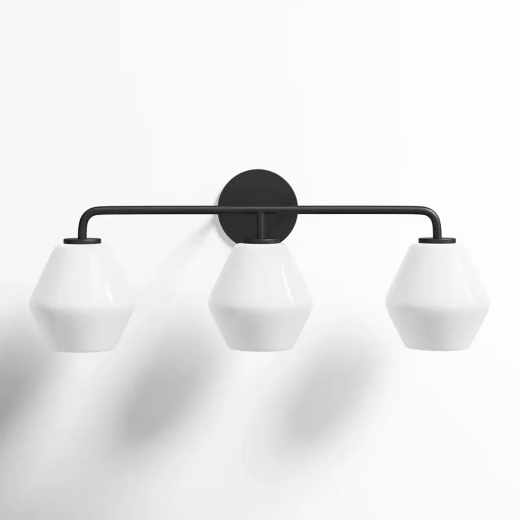 Add a mid-century vibe to your bathroom with this streamlined 3-light vanity light. Crafted with steel in a black finish, this fixture features three cone-shaped shades. They suspend from a slim rod attached to a circular backplate. Gold-finished cylindrical accents at the top of each shade add a hint of glam style. Inside each shade, a standard bulb (sold separately) nests inside to become an element of the design. This fixture's reversible mounting allows you to cast light upward or downward. Rated safe for damp spaces. Compatible with a dimmer switch.