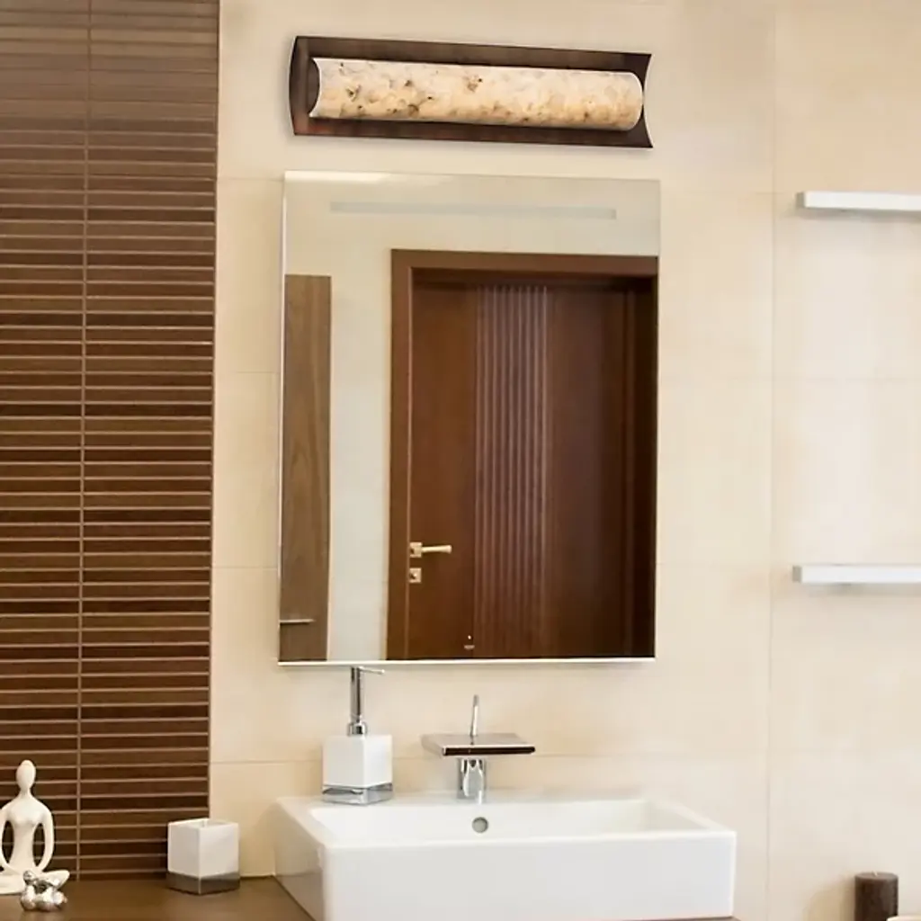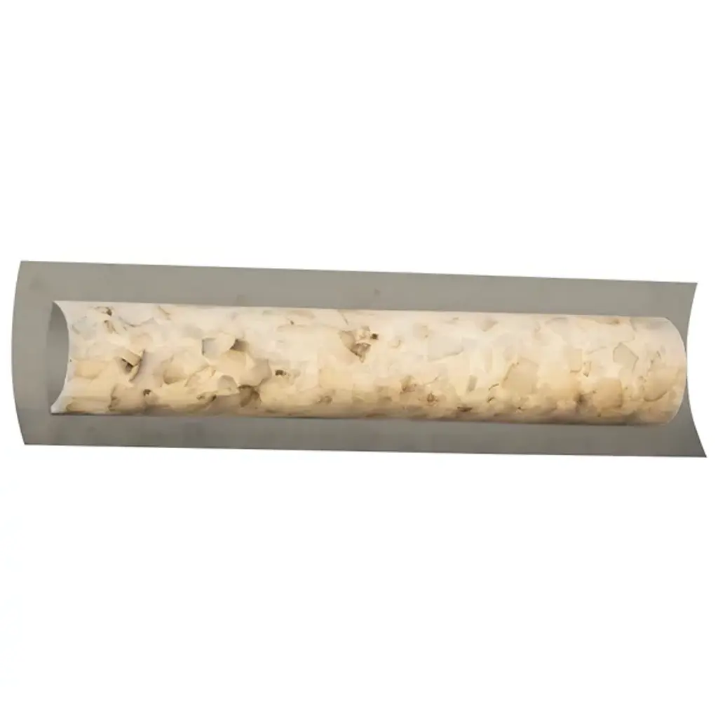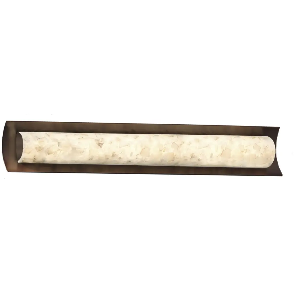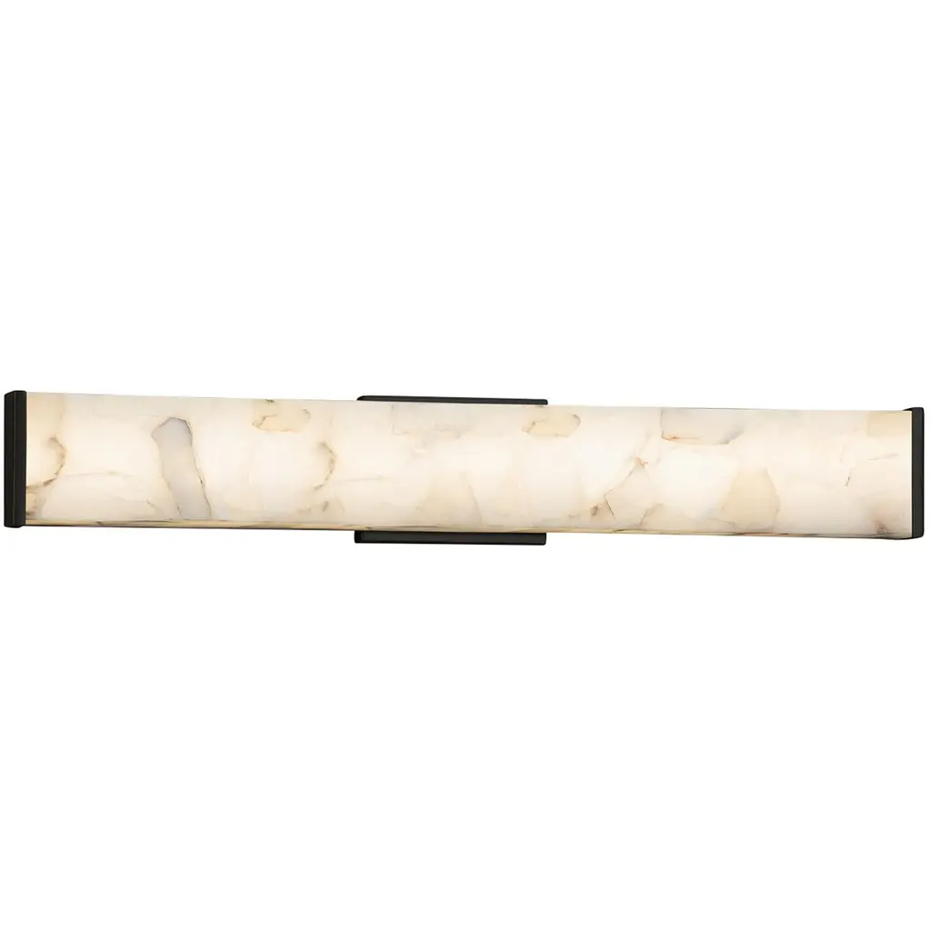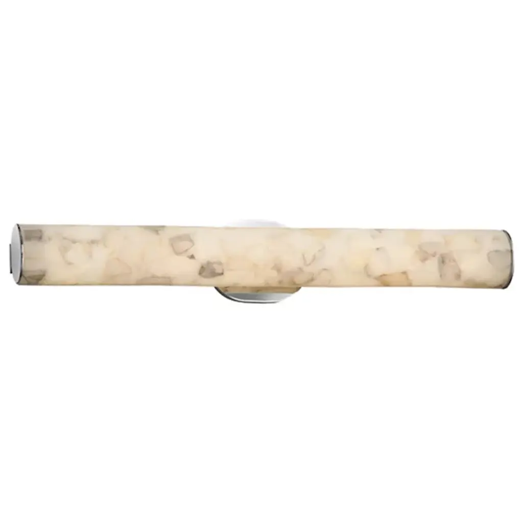 Draw a straight line to sophistication with the Alabaster Rocks! Lineate LED Vanity Light. Showcasing Alabaster Stone shavings set in Resin against a curved wall plate, it installs vertically or horizontally. The stunning mosaic-like bath bar is the ideal luminary for the top and/or sides of the bathroom vanity mirror.