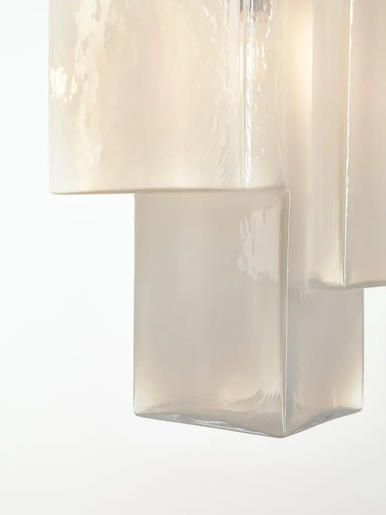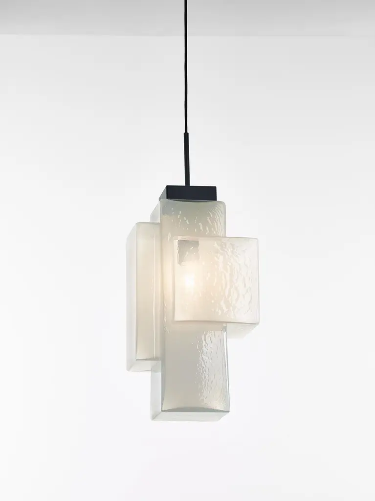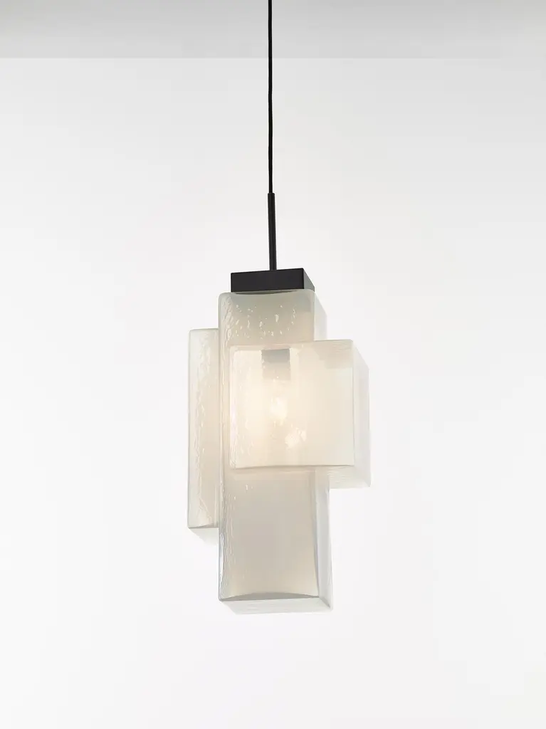 Alabaster white tetris pendant light by Dechem StudioDimensions: W 30 x D 23 x H 200 cmMaterials: metal, glass.Also available: different colors available.In this complex lighting fixture, strict geometric and architectural lines contrast with the organic and natural surface of the glass which is uneven and wrinkled from contact with the metal mold during production. These stacked cubes of glass are produced in different colours, including smoke grey, poppy red, clear glass, cobalt blue and alabaster white, always combined with a solid matte black fixture.Glass, just like people or trees, is perfectly capable of being shaped and formed. One can imprint just about anything into it, give it a form, and capture a passing moment, breath a new life into it. Later it stiffens and freezes like a petrified fossil, like magma, like a witness. No one can move it. It is solid as a rock and if you urge it, it rather shatters into pieces than to surrender.We are DECHEM.We are Michaela and Jakub, designers and storytellers in Bohemian glass. Our work is based on contemporary design combined with a mastery of production and a healthy respect for old Central European Craft and traditions.We design, produce and sell our collections of lights and decorative glass products. We produce unique light fixtures made from a combination of mouth-blown glass and handcrafted brass. Our glamorous chandeliers light up any space with a playful yet elegant appearance.A significant component of our work is blowing glass into a colour gradient. The wide range of fresh gradient colours is a distinctive feature of the Bandaska vase from our collection. It draws inspiration from traditional milk containers, well-known in Czech village households, and their elegant lines are now coming into modern homes in the form of our glass vases and lights.In addition to our normal production, we love to devise bespoke luminous objects for interiors. They arise from experimenting with unconventional materials and unusual combinations.Along with our own work, we like to be part of special collaborations and exhibitions. We have collaborated with renowned galleries and institutions, and curated and exhibited projects in Milano, London, Frankfurt, Istanbul and several other cities around the world.All of our creations are manufactured with care in Czech workshops using unique methods, including hand-blowing, snapping, cutting, grinding, firing, engraving and glass painting.We founded DECHEM studio in Prague in 2012 as partners in both work and life after years of studying glass Craft and design, and we have grown it into a renowned and award-winning design studio.