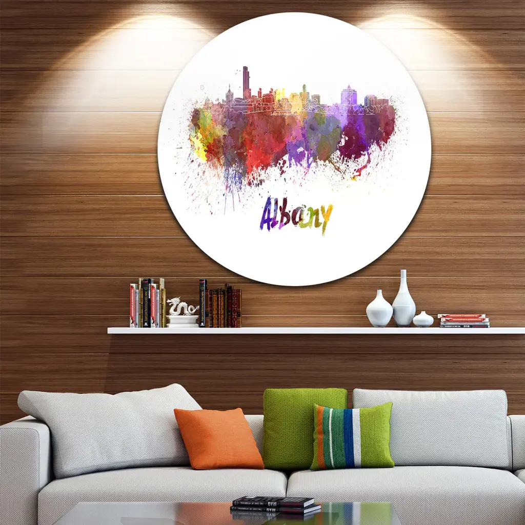 Bring Contemporary Abstraction to your home with this large Circle Metal wall art. This Albany Skyline Metal Artwork makes it the focal point of any room or office. - White Gloss Coating ensures colors are extra vibrant with light reflection.- Aluminum grade Sheet Metal with 1 inch mounting frame on the back giving the illusion that the artwork is floating on the wall..- Mounting Brackets are included along with instructions.- High Quality Digital images are created directly into a glossy aluminum panel producing a stunning and captivating print into the glossy finish of the metal.- Water, Fire and Scratch resistant HD Aluminum panels.- Looks better than any photo paper and guaranteed to last at least 20 years- Easy to clean with a microfiber cloth. Colors are far superior to regular Canvas Art. - Easy to Hang