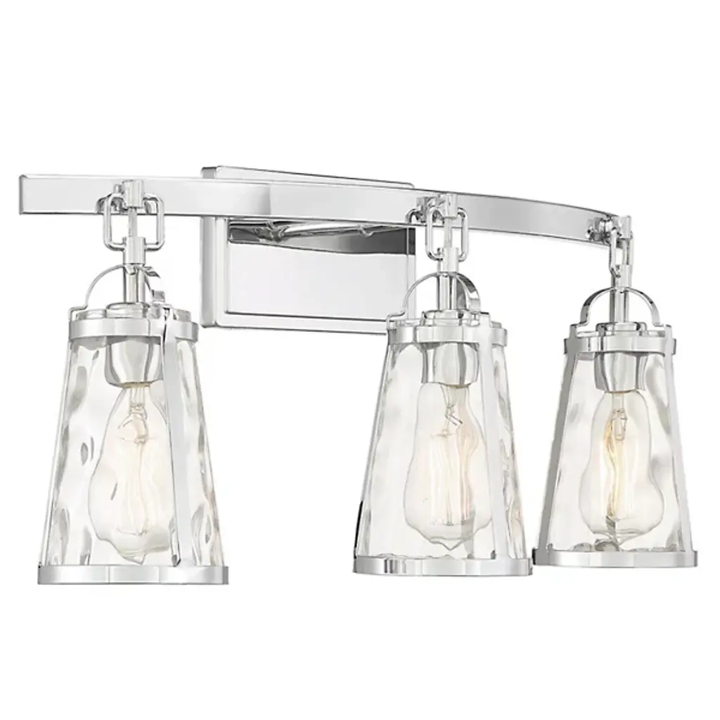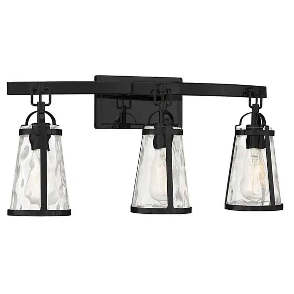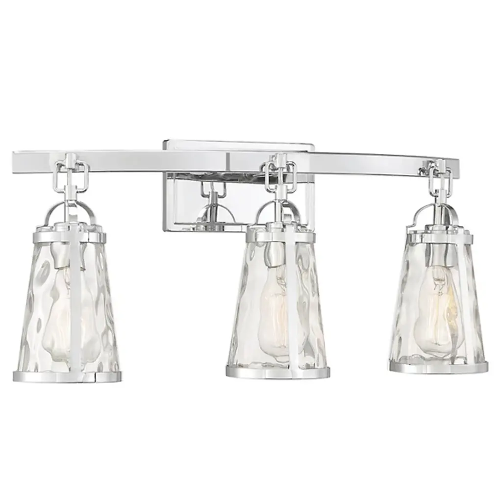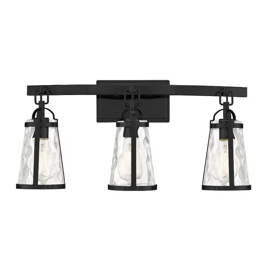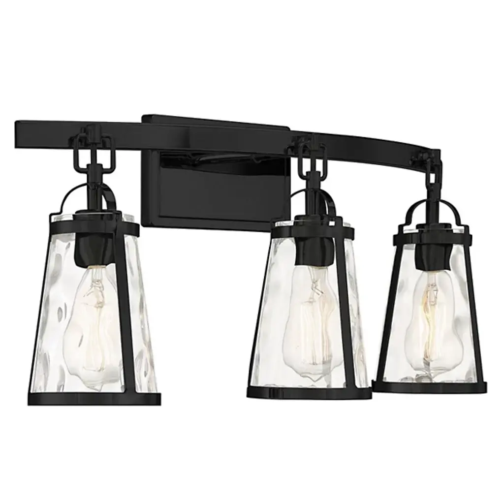 A beautiful marriage of glass and light. Give your daily routine a sophisticated feel as you freshen up with the seductive glow of the Albany Vanity Light from Savoy House. Lay the low-profile metal backplate over your mirror for a clean-edged look. Hanging from a curved crossbar, the metal frames bring a classic personality in their lantern-like silhouettes. The flowy, textured glass inside mesmerizes as it softens the light and the image of the bulb. Warm, radiant light glazes the glass and creates a bright aura around the bathroom.