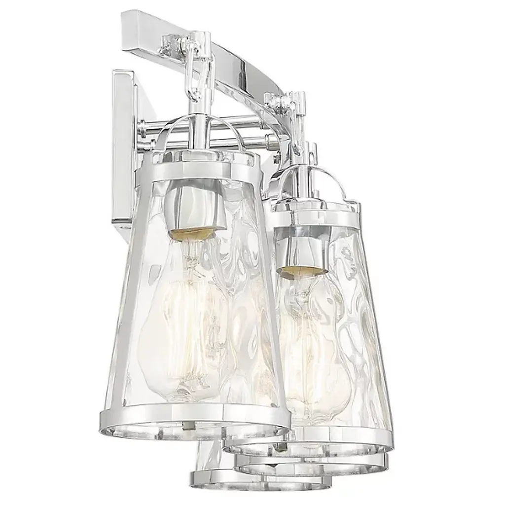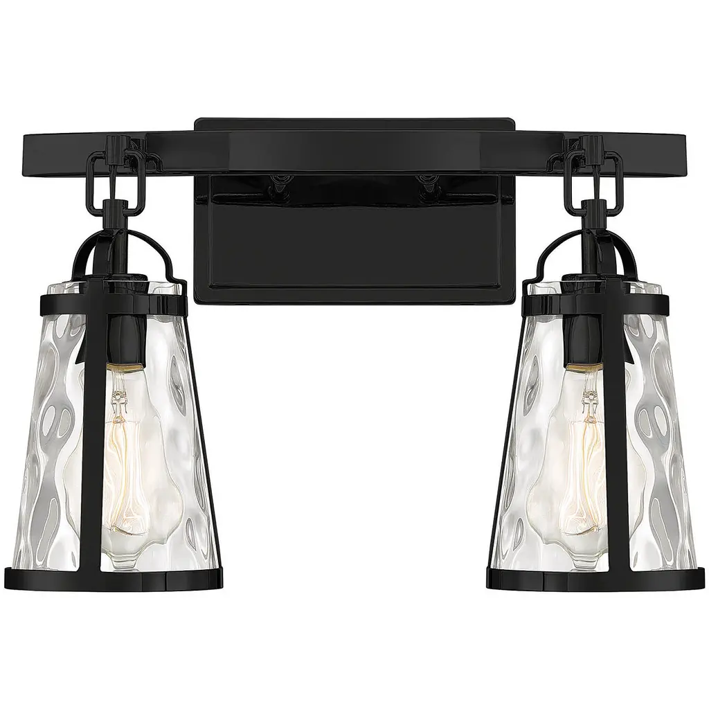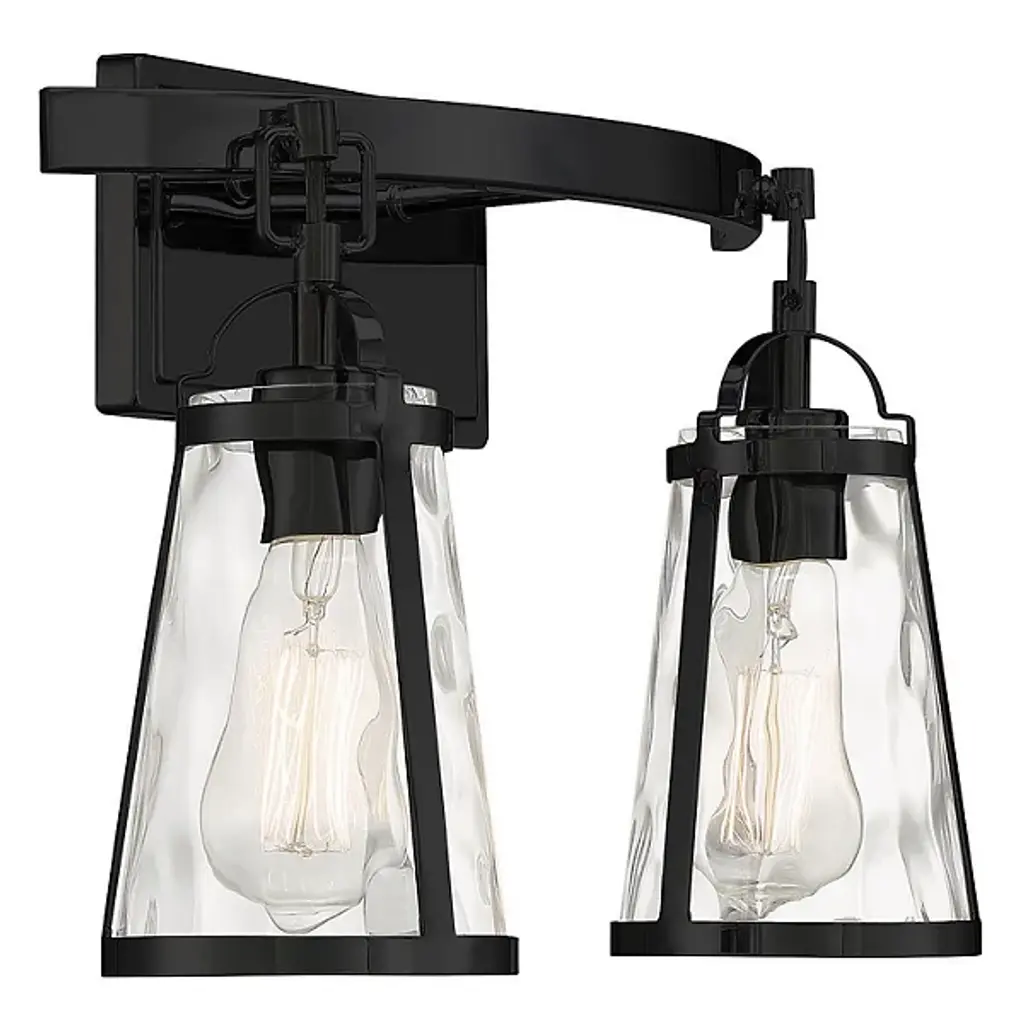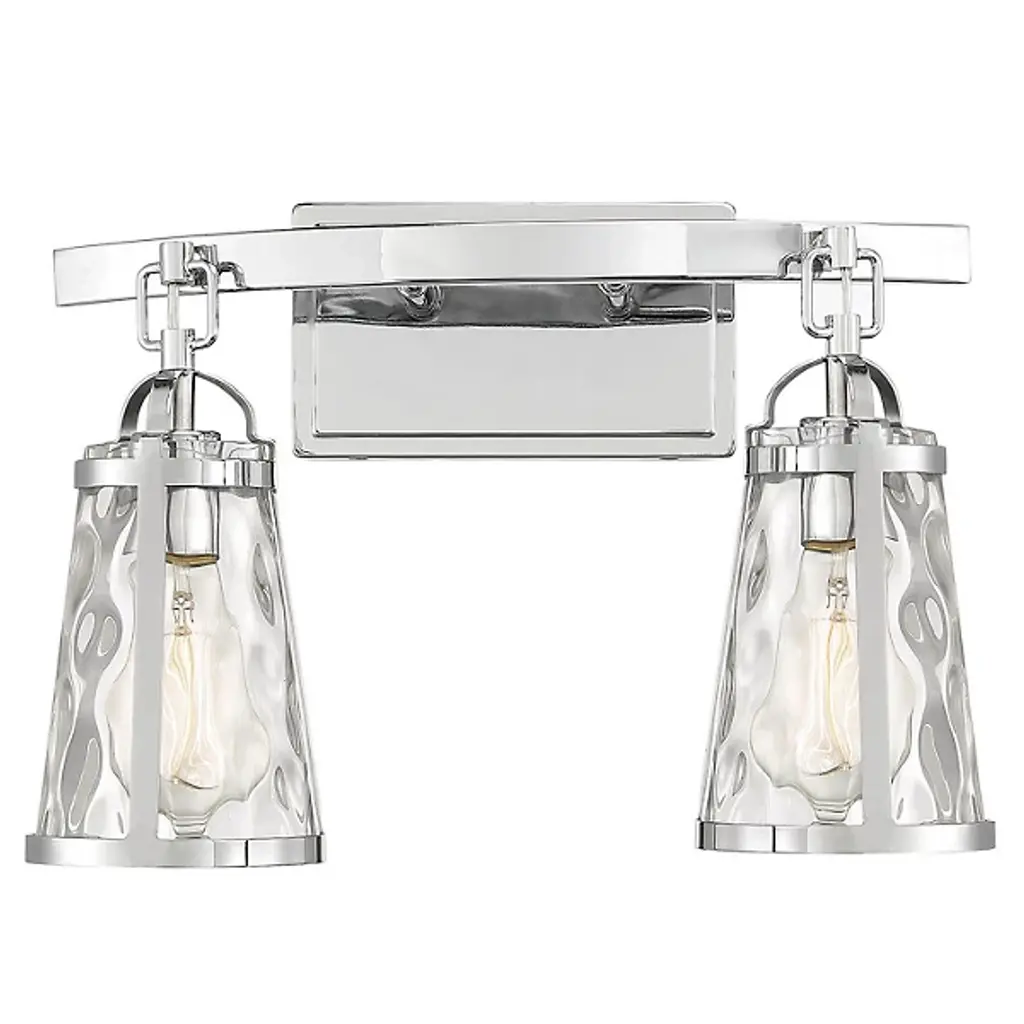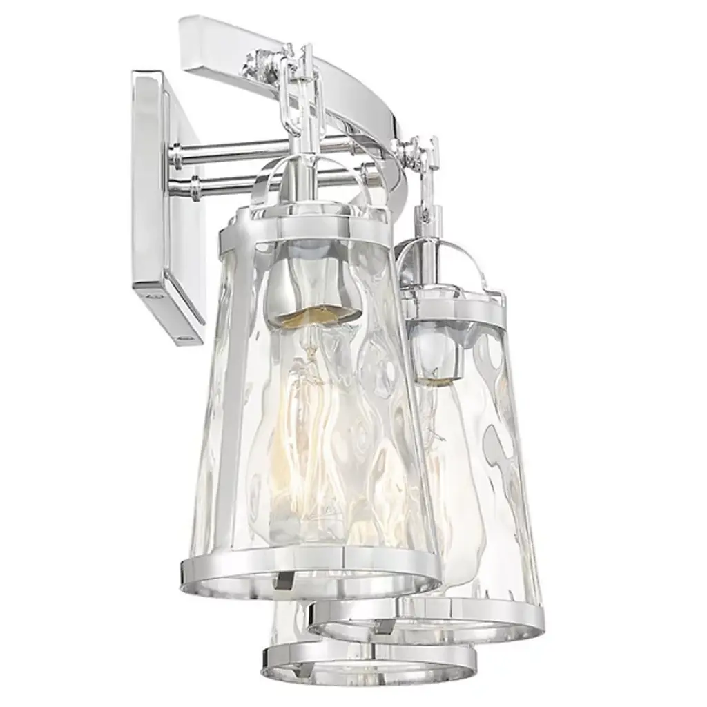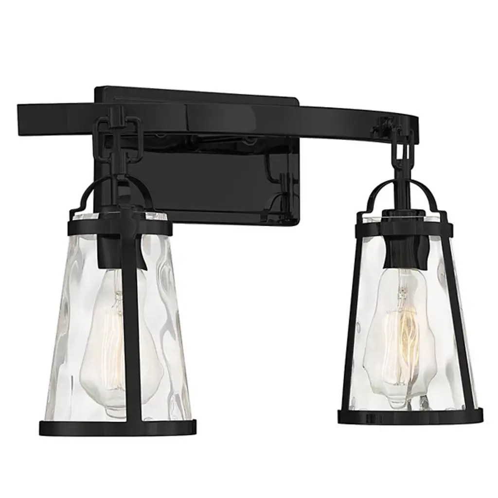 A beautiful marriage of glass and light. Give your daily routine a sophisticated feel as you freshen up with the seductive glow of the Albany Vanity Light from Savoy House. Lay the low-profile metal backplate over your mirror for a clean-edged look. Hanging from a curved crossbar, the metal frames bring a classic personality in their lantern-like silhouettes. The flowy, textured glass inside mesmerizes as it softens the light and the image of the bulb. Warm, radiant light glazes the glass and creates a bright aura around the bathroom.