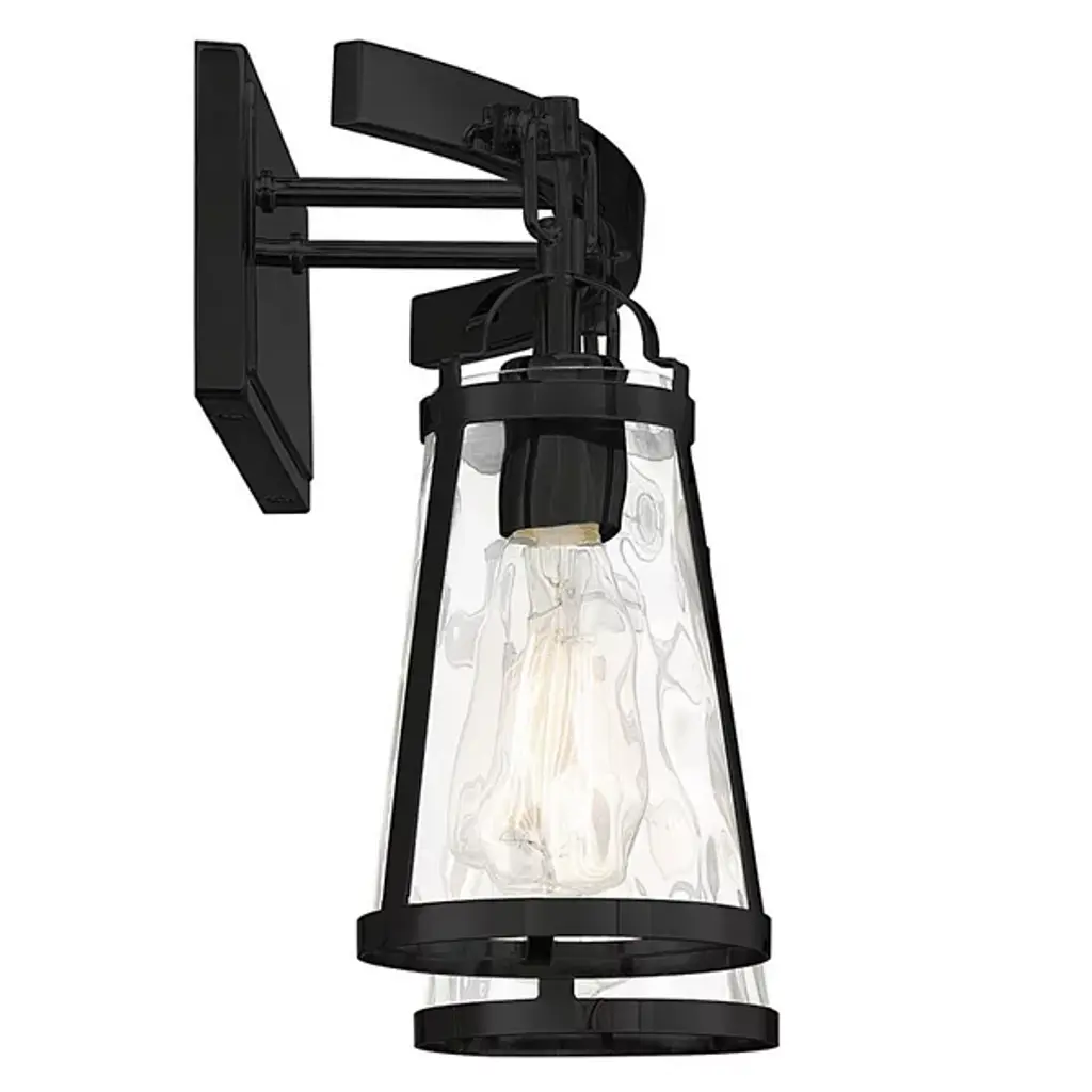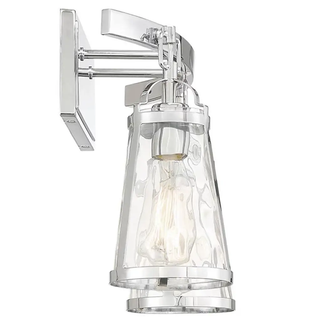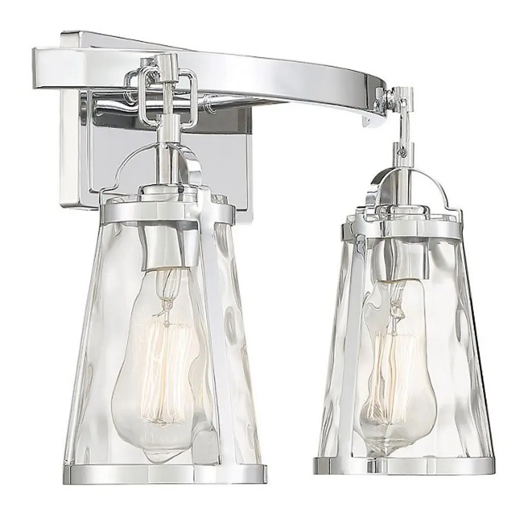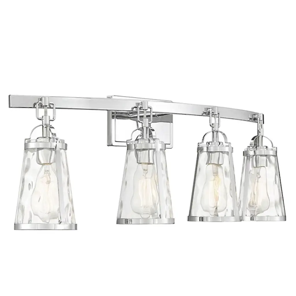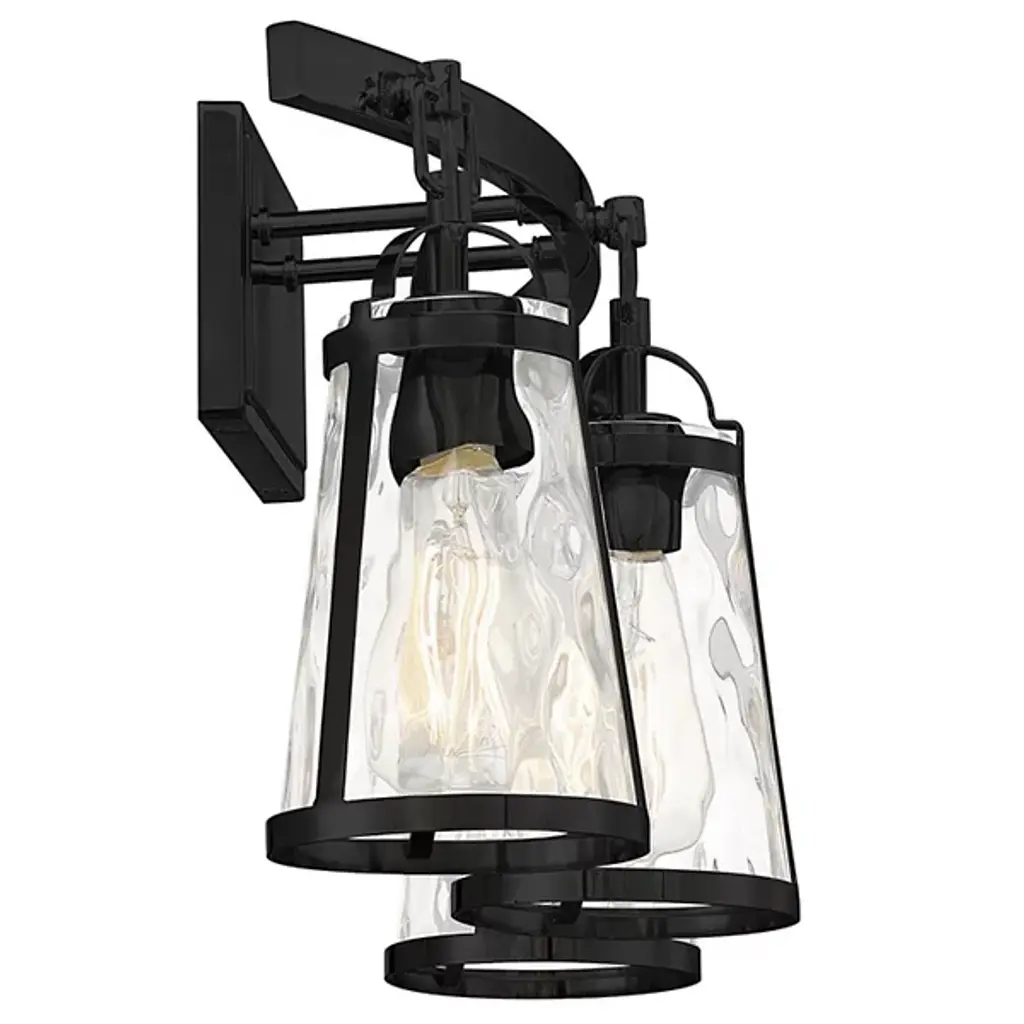 A beautiful marriage of glass and light. Give your daily routine a sophisticated feel as you freshen up with the seductive glow of the Albany Vanity Light from Savoy House. Lay the low-profile metal backplate over your mirror for a clean-edged look. Hanging from a curved crossbar, the metal frames bring a classic personality in their lantern-like silhouettes. The flowy, textured glass inside mesmerizes as it softens the light and the image of the bulb. Warm, radiant light glazes the glass and creates a bright aura around the bathroom.