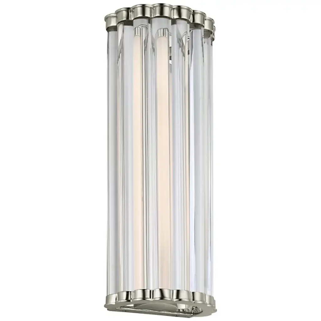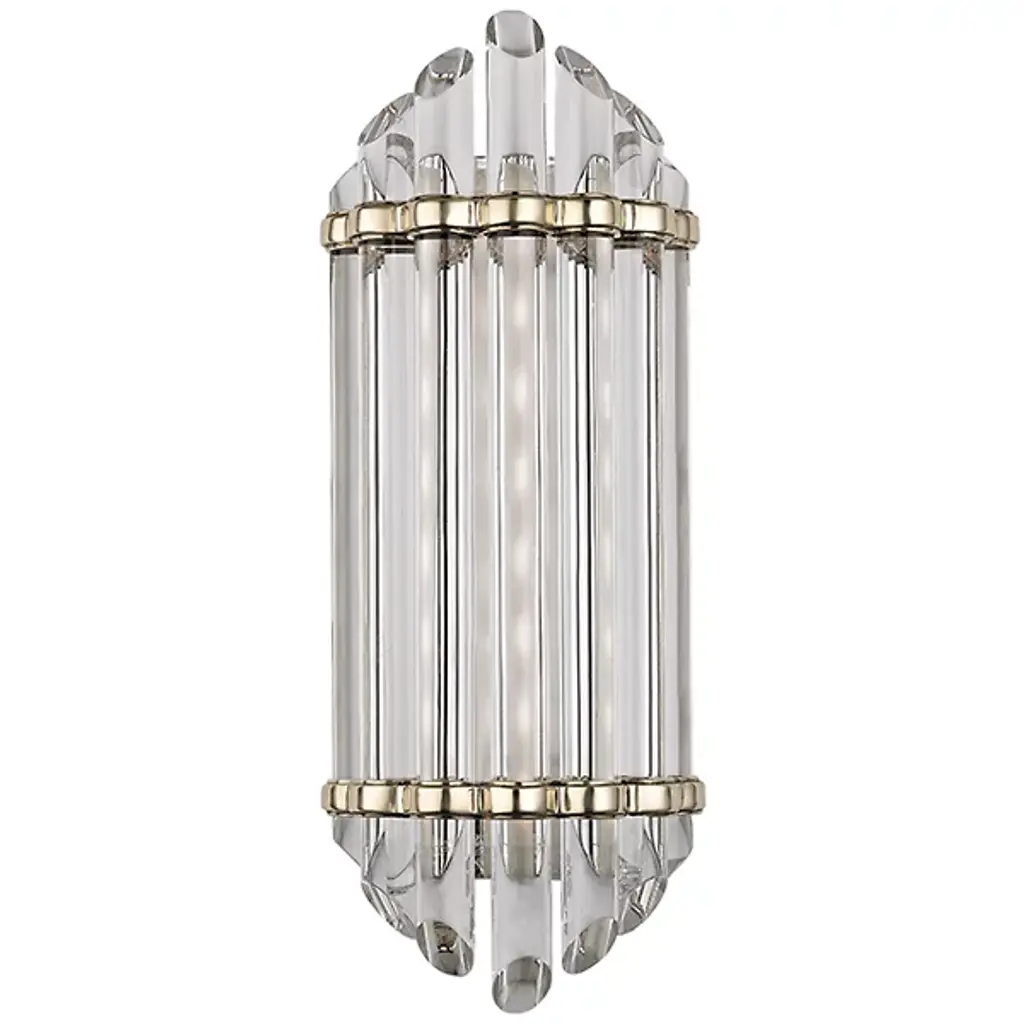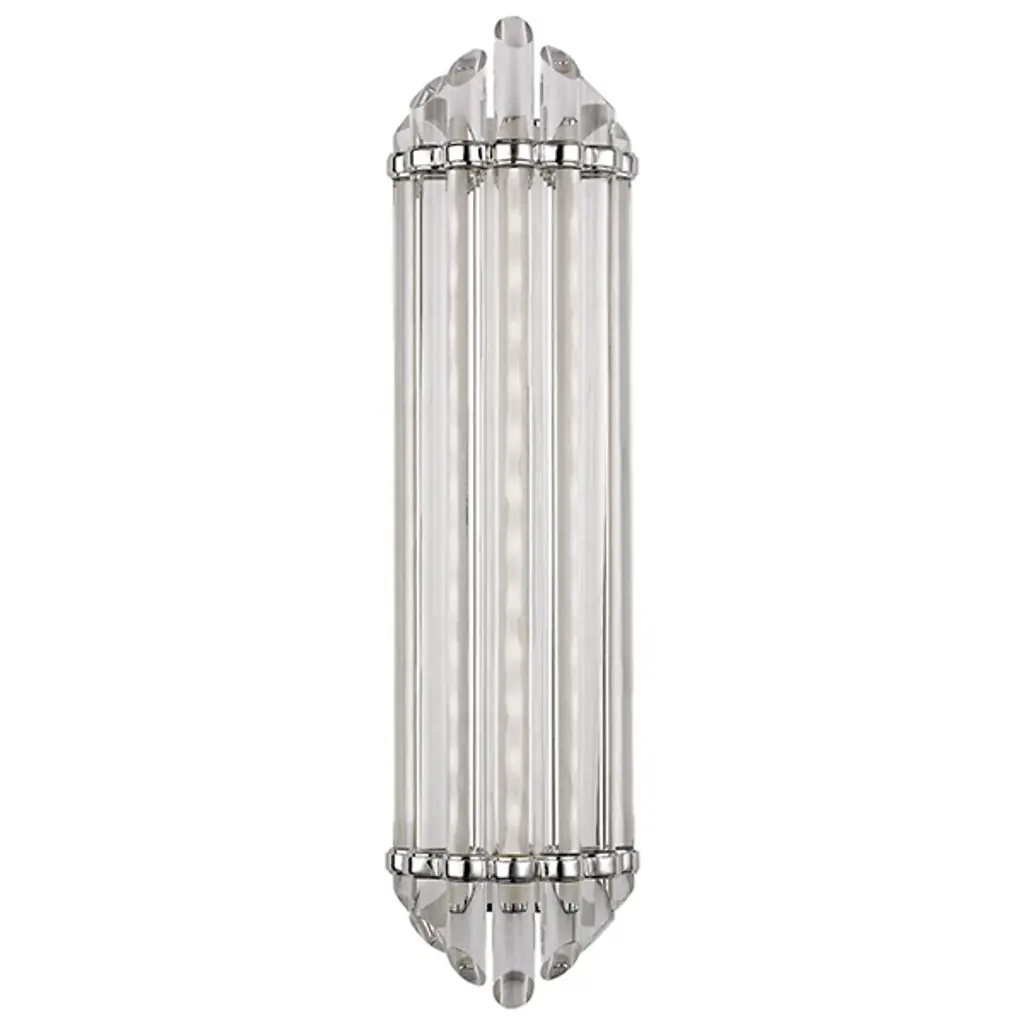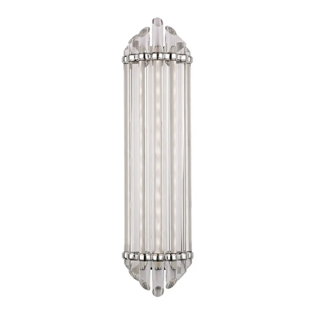 A fashionable fixture that features crystal rods with metallic accents, the Hudson Valley Lighting Albion Vanity Light shimmers with twentieth-century glamour. The tapered ends and rounded profile of the crystal gives the fixture a diamond shape that is accessorized by fluted metal rings. Illuminated by LED lamps behind a frosted glass diffuser, the light is brilliant and shines outward through the glass accents.