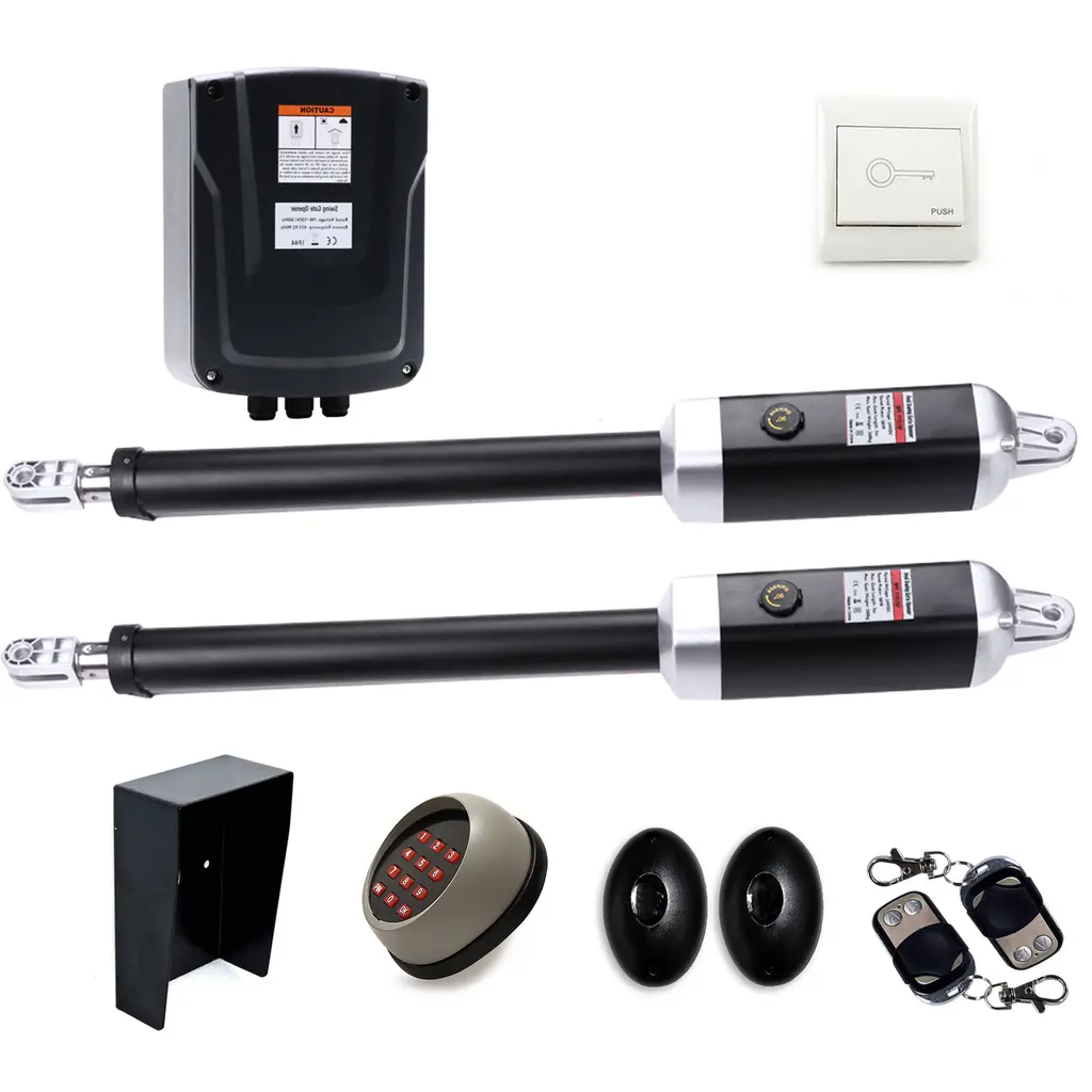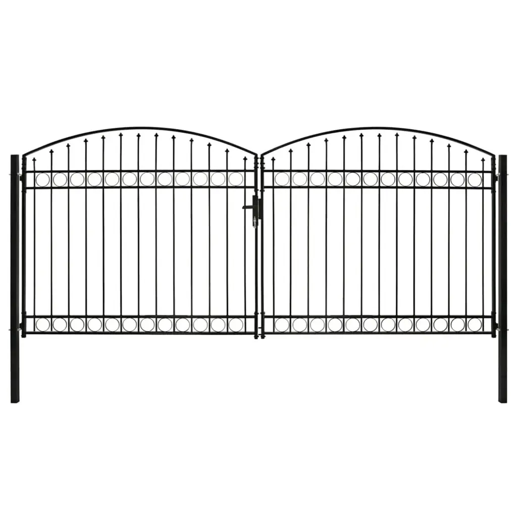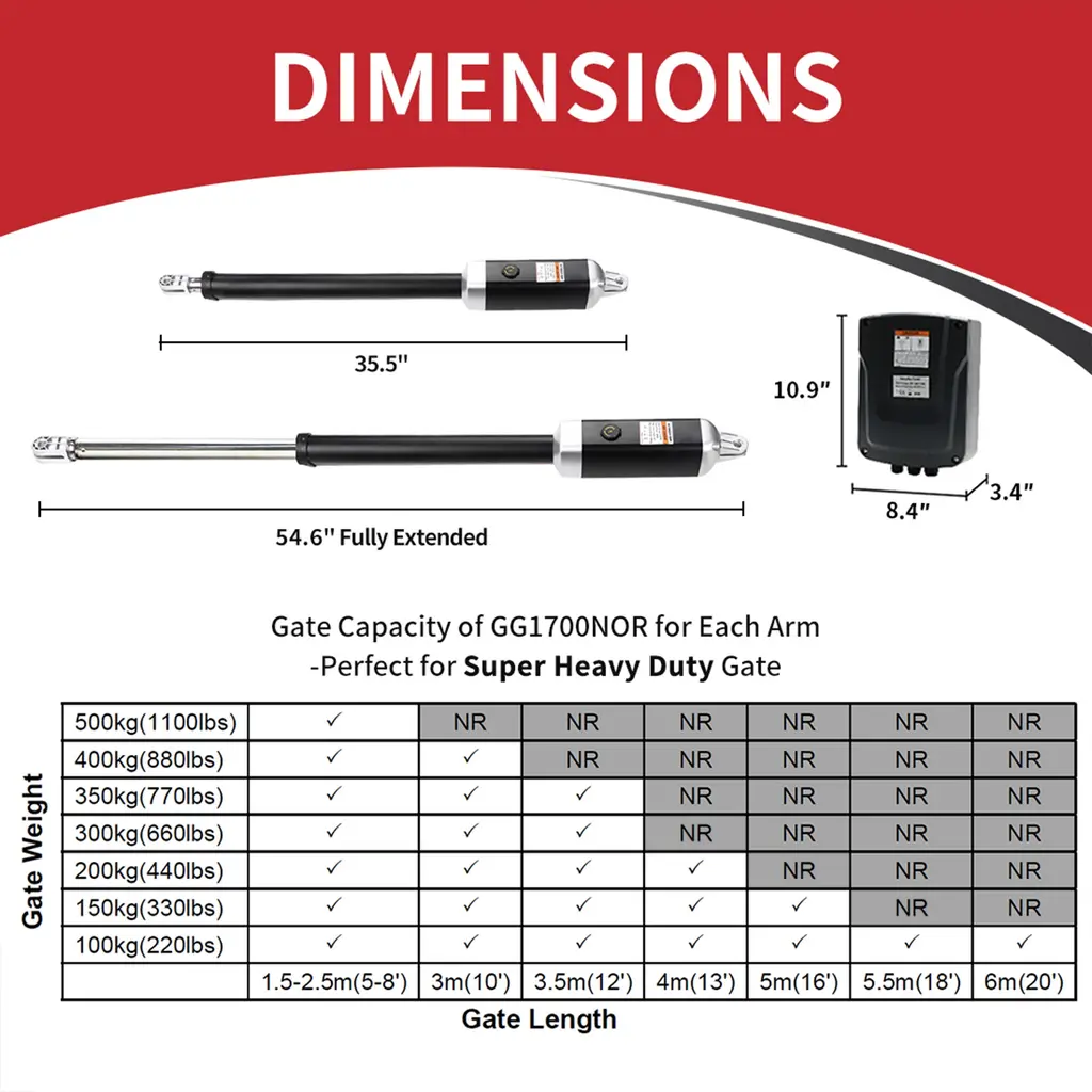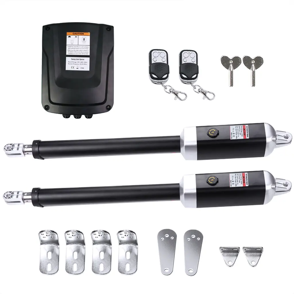 ALEKO Steel Dual Swing Driveway Gate with Automatic Gate Opener designed to capture the classic magnificence of historic wrought iron at a more affordable price point, these Paris style gates are meticulously crafted with elegant curves and dramatic details to boost your home curb appeal. ALEKO gate is fully welded from hot-dipped galvanized steel, and the powder-coated finish helps prevent rust, chipping, and wearing. ALEKO gates kits include the exact accessories needed to automate your gate. Stay warm and dry in your vehicle thanks to the gate operator exceptional starting torque and soft start/stop operation. Our automatic gate opener kit allows you to access your gate through a remote control or keypad, and has safety features in place, including: an emergency release key in case of power failure and a stop/reverse option in case of obstruction during opening/closing.Features: Complete kit includes Dual-swing Gate and Gate Operator with accessories Maintenance free, no painting or staining Duplex System (powder paint is applied to galvanized steel) Durable and strong all welded construction Great combination of strength, corrosion resistance Material: Galvanized steel gate with a powder paint coating Gate Dimensions L X H: 18 ft. x 6 ft. Gate Posts Dimensions: 8L ft. x 3.5W x 3.5H in Gate Warranty: 10 Years Color: Black Gate Opener Technical Specs: Motor: 24V DC, 100W per actuator, 5A current Power supply: 110V/60Hz Actuator speed: 5/8 inch per second (1.6 cm/sec) Open/closing running time: programmable (from 0 to 99 seconds) Actuator travel: 15 3/4" (400 mm) Gate Opener Warranty: 1 Year Gate Assembly Kit Included: 2 Gate Panels, 2 Posts, Regular Hinges J-bolt Gate Opener Kit Includes: 2 Metal Actuators, Control Box, 2 Release keys, 2 Remotes, Wireless Keypad, Wired Push Button, Set of Photocells, Mounting Hardware, Manual, Wire not includedPhotocells - keep your automatic gate opener from closing accidentally on a vehicle or more importantly on a person Push Button - simply push the button to start or stop your gate opener Keypad - provides convenience and security, restricts gate access to only residents and invited guests Remote - open or close a gate without leaving the car