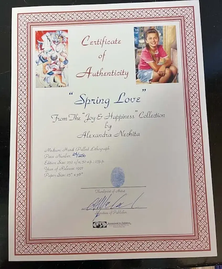 "Spring Love" by Alexandra Nechita Hand Signed and Numbered by the artist Spring Love "In Spring all the flower blossom, and it's that time of year when you get to smell the flowers - the tulips and the dandelions, and all those beautiful flowers. You can see there's a lot of love in this painting- red, pink, purple, and gold - because when flowers are blooming it's like love. We don't want to see the flowers closed up in their buds; we want to see them open, joining with the world. There is a little child on the left-hand side of the painting; it represents the love from our moms and dads and grandparents." Alexandra Nechita "Spring Love" Unframed Limited Edition Lithograph Art Print Hand signed by the artist Paper Size: 36" x 24" Image Size: 32" x 19" Edition Number: 24/250 Condition is Excellent Original Publisher's Certificate of Authenticity is included Alexandra Nechita was born in Romania in 1985. She began drawing at the age of two. At seven, Alexandra was painting with oils and acrylics, and her first exhibit was a one-woman (child) show held at a Los Angeles public library when she was just eight years old. Alexandra's talent was instantly recognized as capacity crowds came to see her amazing and often monumental paintings. After seeing her art, the press labeled her "The Petite Picasso." She attracted the attention of art critics and the media who began telling the world about this rarest of child prodigies - an artist who had mastered drawing and color, an artist who had created a visual language of her own, in a unique, lyrical, figurative, abstract cubist manner, an artist who had only recently turned nine years old. By age ten, Alexandra was producing strikingly accomplished canvases, which were easily compared to the work of talented, fully mature artists. Her works have a developed artistic personality, highly sophisticated and fully alive to the nuances and possibilities of her medium. In November of 1999, Alexandra was selected by the World Federation of United Nations to lead a Global Arts Initiative involving more than 100 Nations. Alexandra will touch millions of lives worldwide through her artwork and will be recognized as a global influence through the spirit of the arts in the 21st Century. Alexandra Nechita is the world renowned child prodigy artist of the 20th century. Her works are displayed at the Los Angeles Public Library, Mary Paxton Gallery Los Angeles, Canton Museum of Fine Art Ohio, Luckman Gallery Cal State University, Le Petit Palais Geneva, Tennessee State Museum Nashville, Rock and Roll Hall of Fame Cleveland, The Special Olympics Collection Washington D.C., Vatican Collection Rome. Nechita is also collected by celebrities such as Ellen DeGeneres, Whoopi Goldberg, David Letterman, Rosie O'Donnell and Oprah Whinfrey (just to name a few).