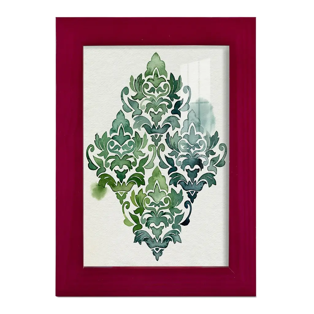 Algae and Azule Motif II -EZ SWITCH Framed Print w/glass-Cherry Red A delightful, framed print. Featuring a solid wood frame with real wood glass. This premium print is giclee quality. In addition, every frame features a removable back and table top stand. This allows you to change your art in the future or to just stand the art on a table for a new look. We are sure you'll enjoy our new series of EZ SWITCH Framed Art. Solid Wood Frame Real Glass Removable / Replaceable Art Built in Tabletop Stand Sizes range from 4x6 up to 12x15 - buy just one or pair them up as sets as you see fit.