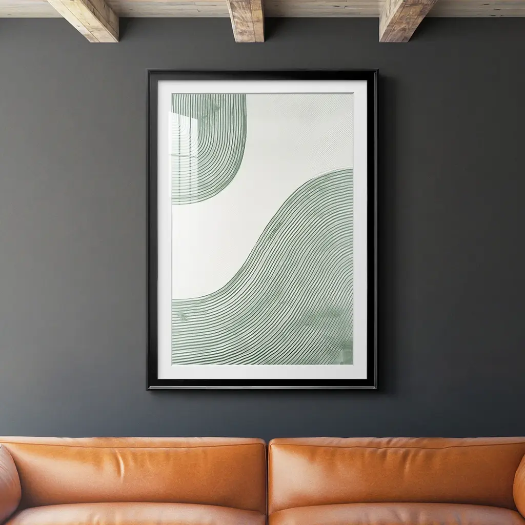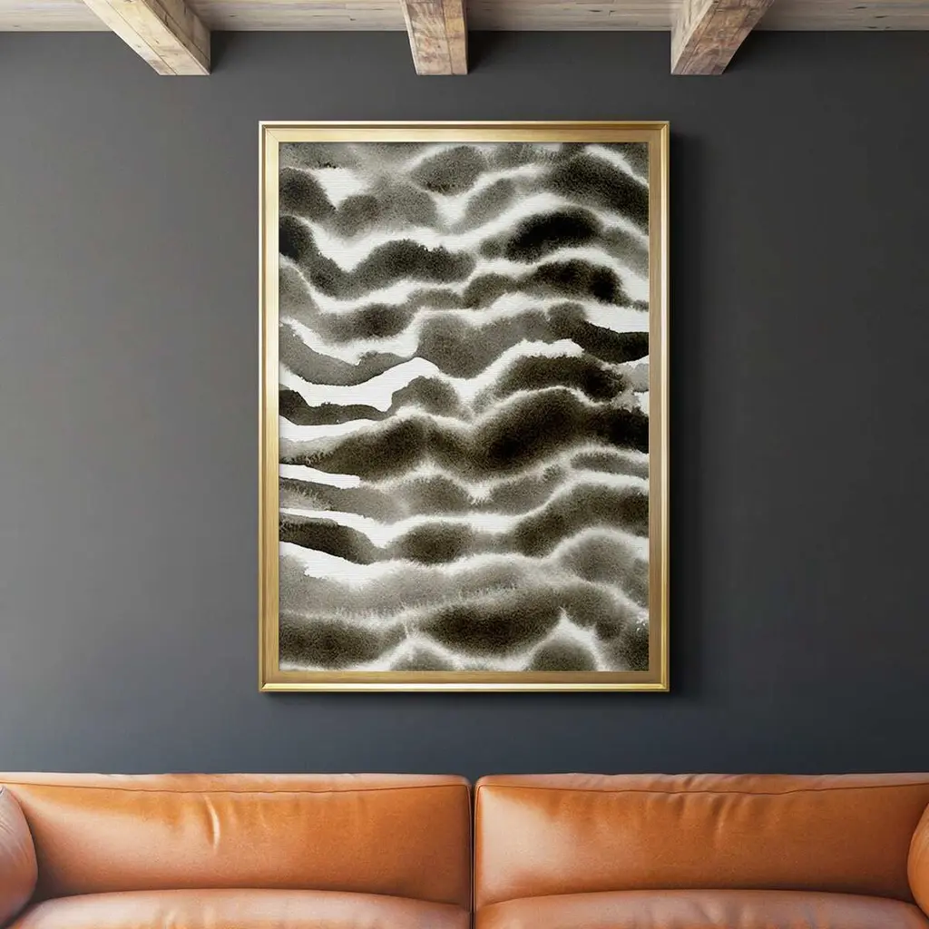 44"W X 66"H X 2"D Golden channels highlight beautiful tones of blue and grays that breeze through this celestial painting by Alger. The piece is wrapped in a black wood molding.