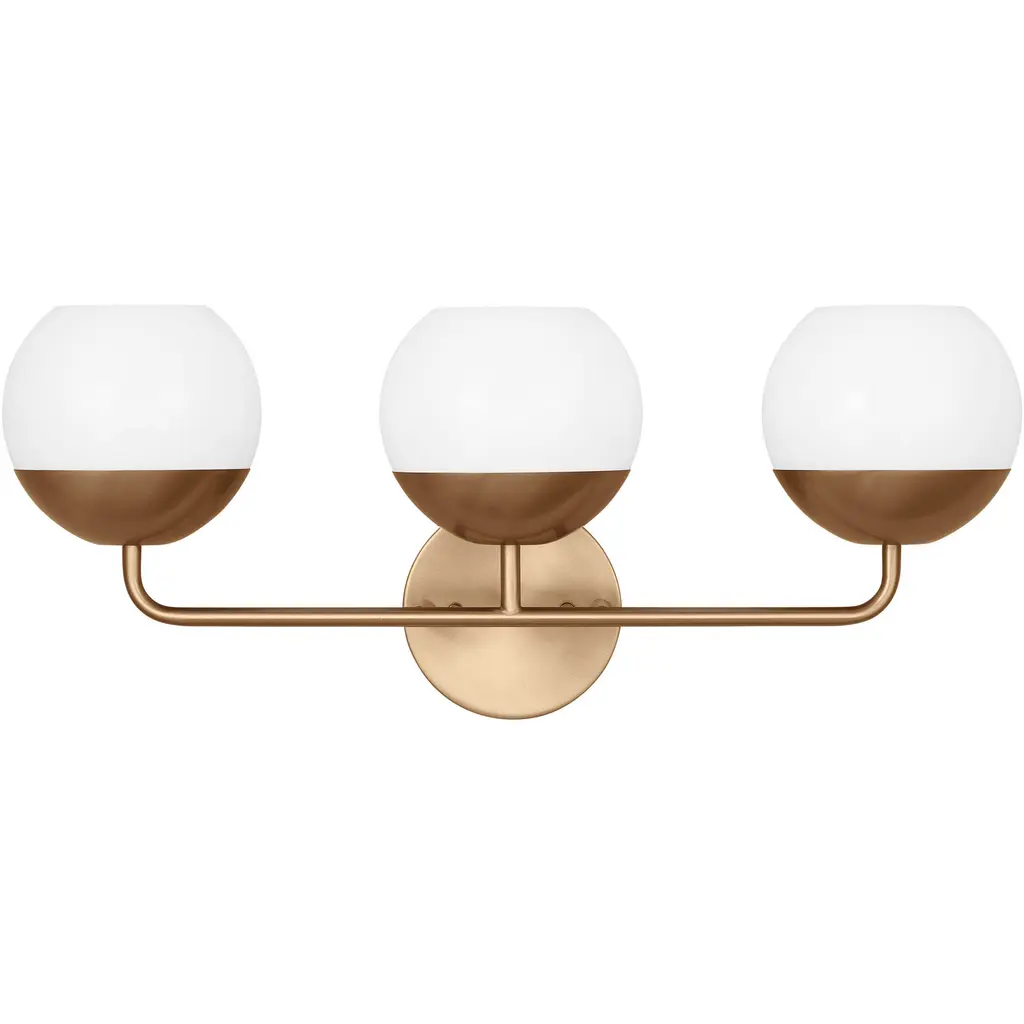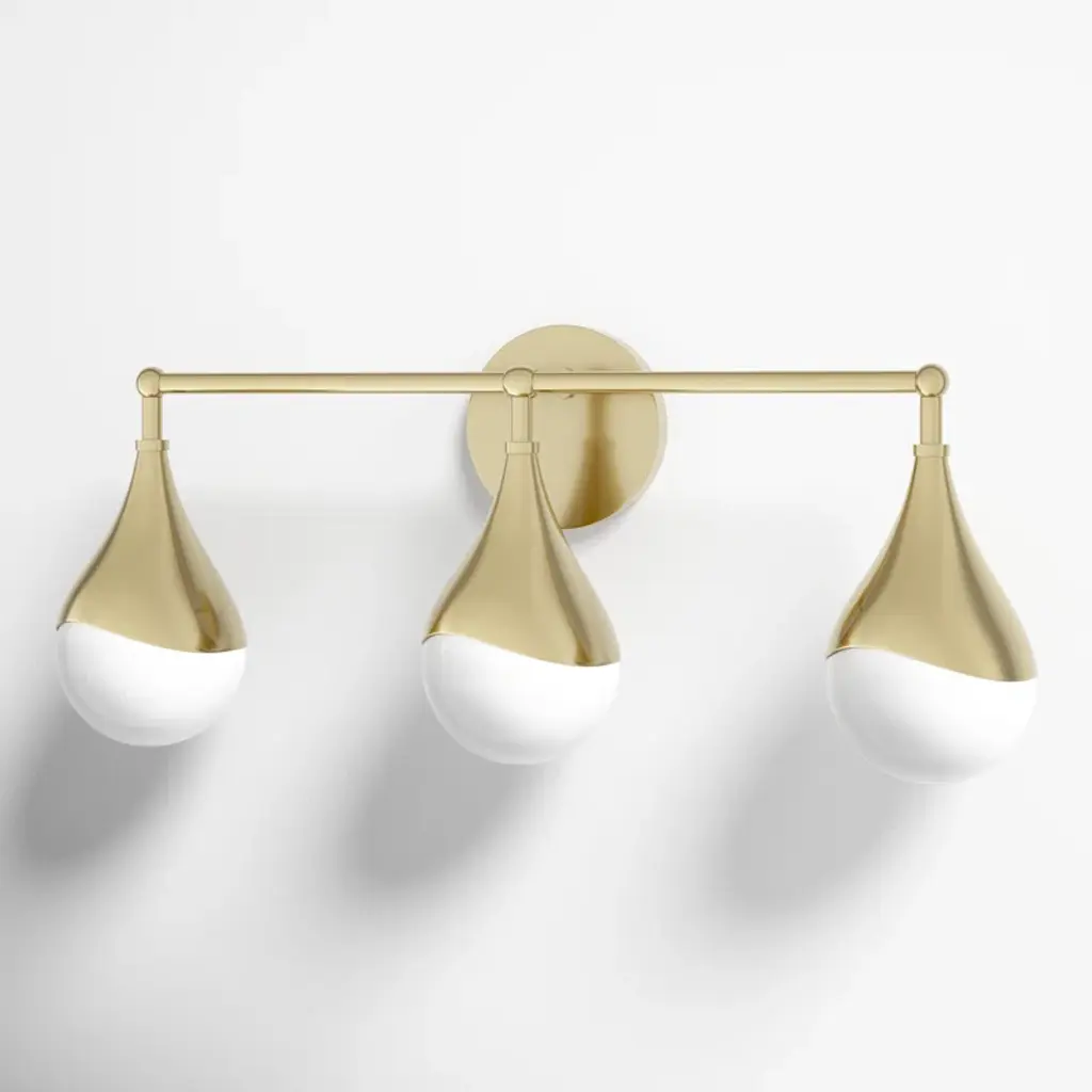 With its fluid, drip-like metal accents and globe shades, this 3-light vanity light adds an unexpected focal point to your bathroom. Crafted from metal, this piece features a circular backplate and slender arm. Three globe shades with metal finials hang from the arm, and the finials features a sinuous, curving design that flows over the tops of the shades for an elevated look. The glass of the shades is frosted to evenly diffuse the light of the integrated LED lights. This fixture is rated for damp spaces and is compatible with dimmer switches.