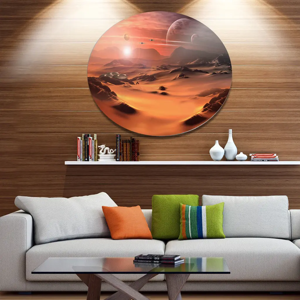 Bring Contemporary Abstraction to your home with this large Circle Metal wall art. This Alien Planet 3D Rendered Computer Art Metal Artwork makes it the focal point of any room or office. - White Gloss Coating ensures colors are extra vibrant with light reflection.- Aluminum grade Sheet Metal with 1 inch mounting frame on the back giving the illusion that the artwork is floating on the wall..- Mounting Brackets are included along with instructions.- High Quality Digital images are created directly into a glossy aluminum panel producing a stunning and captivating print into the glossy finish of the metal.- Water, Fire and Scratch resistant HD Aluminum panels.- Looks better than any photo paper and guaranteed to last at least 20 years- Easy to clean with a microfiber cloth. Colors are far superior to regular Canvas Art. - Easy to Hang