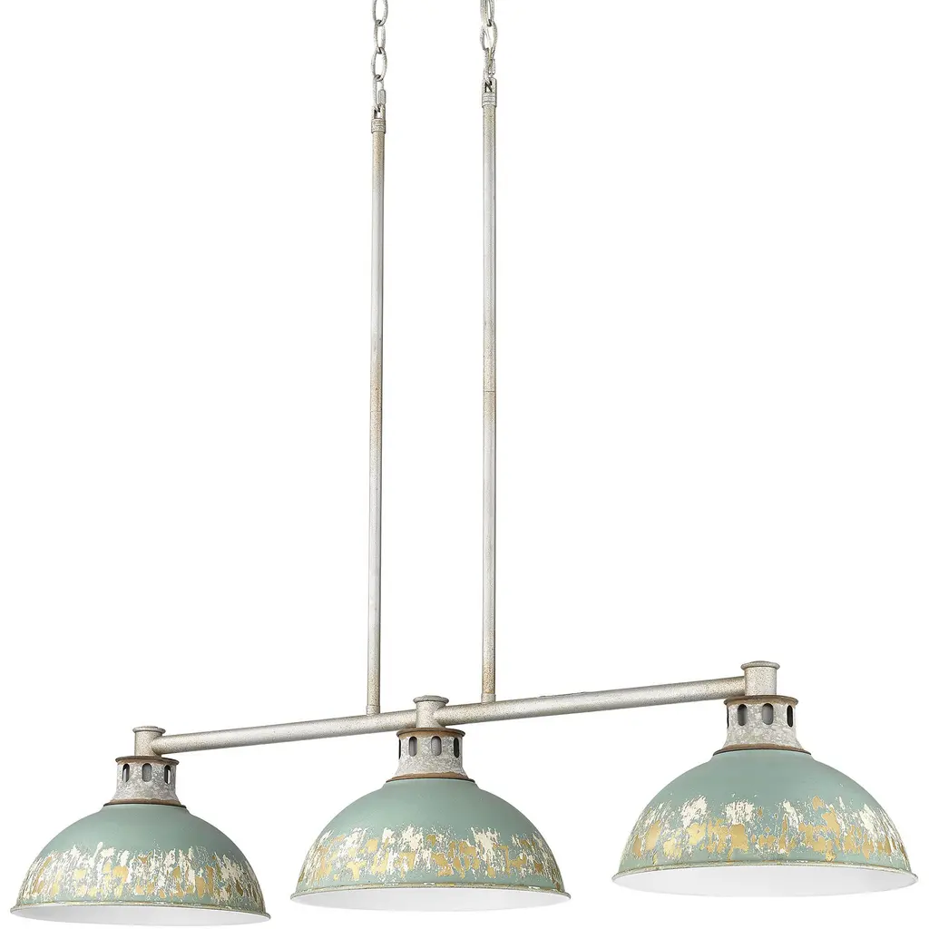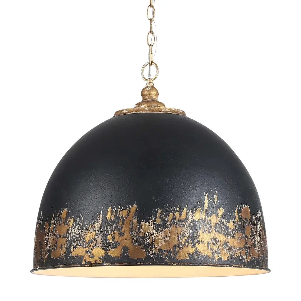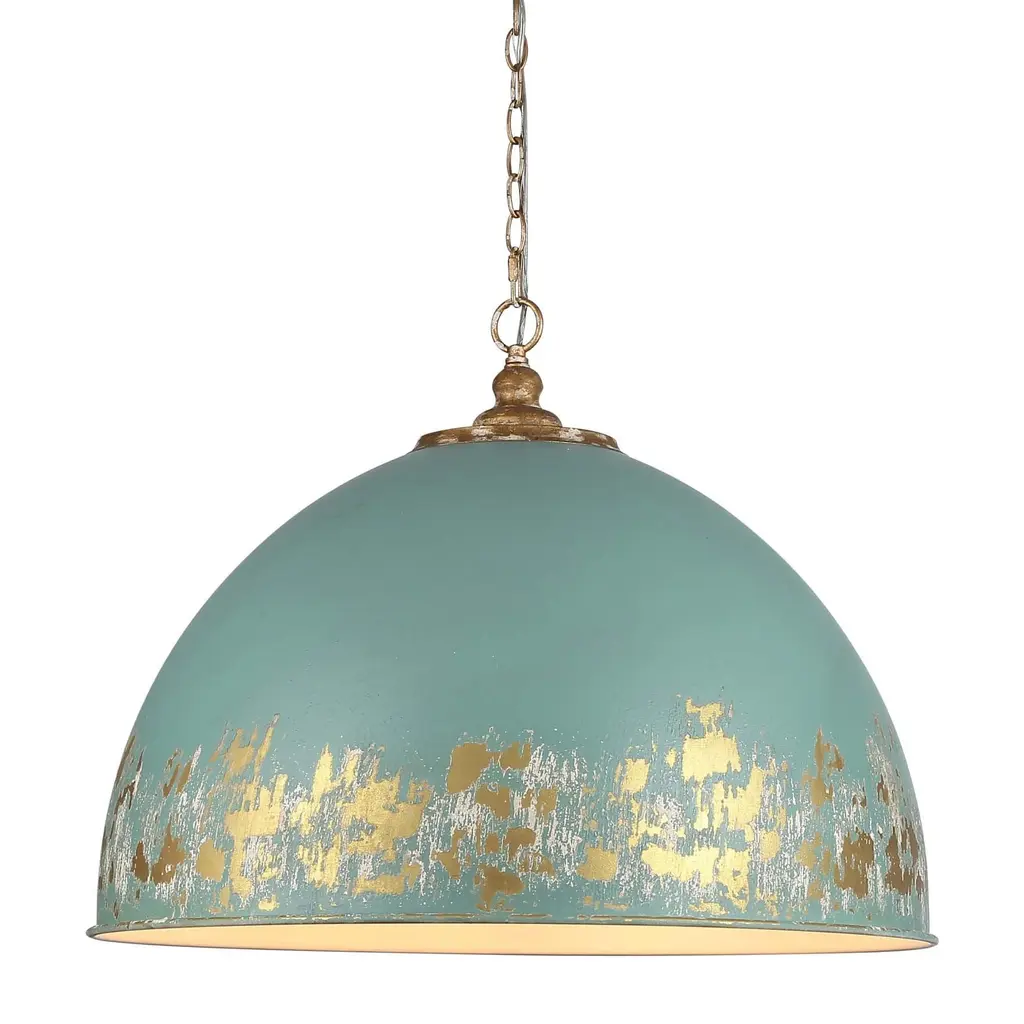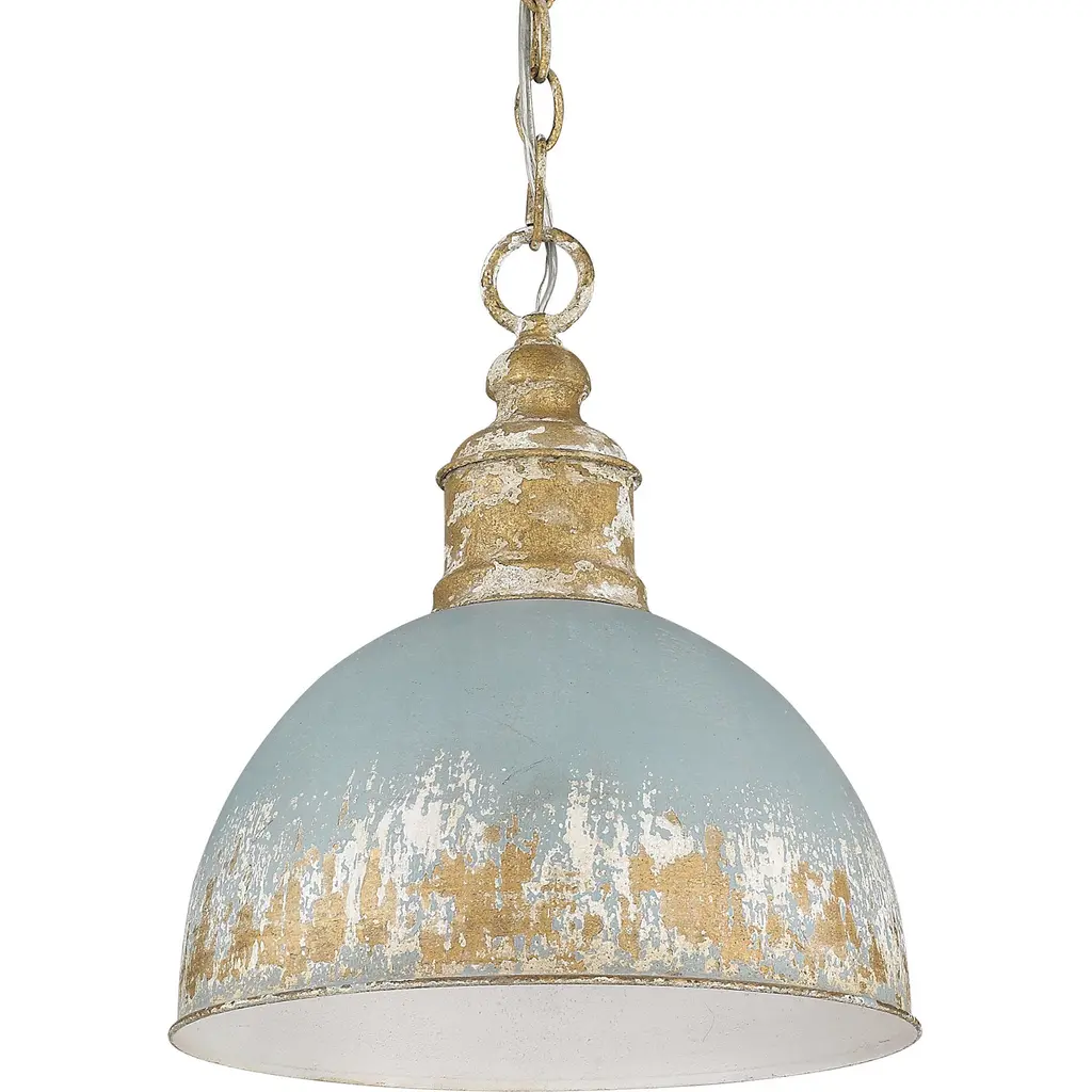 Bring traditional elegance into your home with the Golden Lighting Alison 1-light Pendant. Featuring a metal shade and a vintage gold frame, it creates a welcoming atmosphere.The antique teal metal shade boasts a heavily distressed, multi-layered look, revealing warm undertones that enhance the fixture's rustic character. This design adds a perfect touch of vintage charm, ideal for those looking to incorporate a unique, heirloom piece in their decor.The artisanal vintage gold finish is a handcrafted masterpiece, showcasing a one-of-a-kind chippy texture that embodies the essence of handcrafted design.Perfect for kitchens, dining rooms, or bedrooms, this fixture is damp location rated, ensuring suitability for spaces with occasional moisture. It is also sloped-ceiling compatible and adjustable in heightfrom 17.375" to 89.375"making it versatile for various ceiling types.Overall dimensions measure 12"W x 13.88"H x 12"D, and it requires 1 E26 medium base bulb, max 100 watts. Elevate your spaces with luxurious charm and craftsmanship that stands out in any setting.
