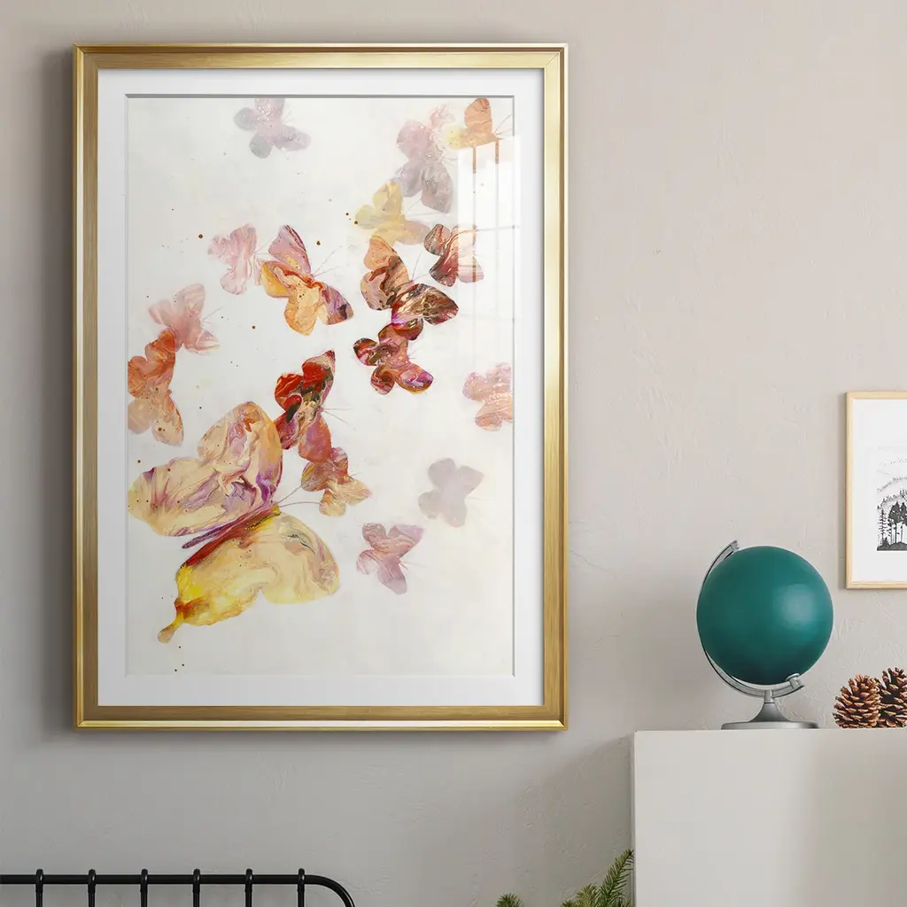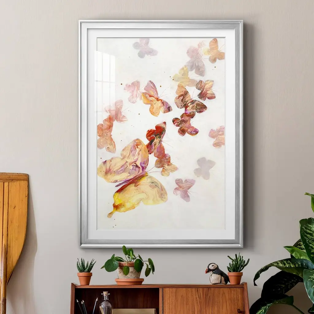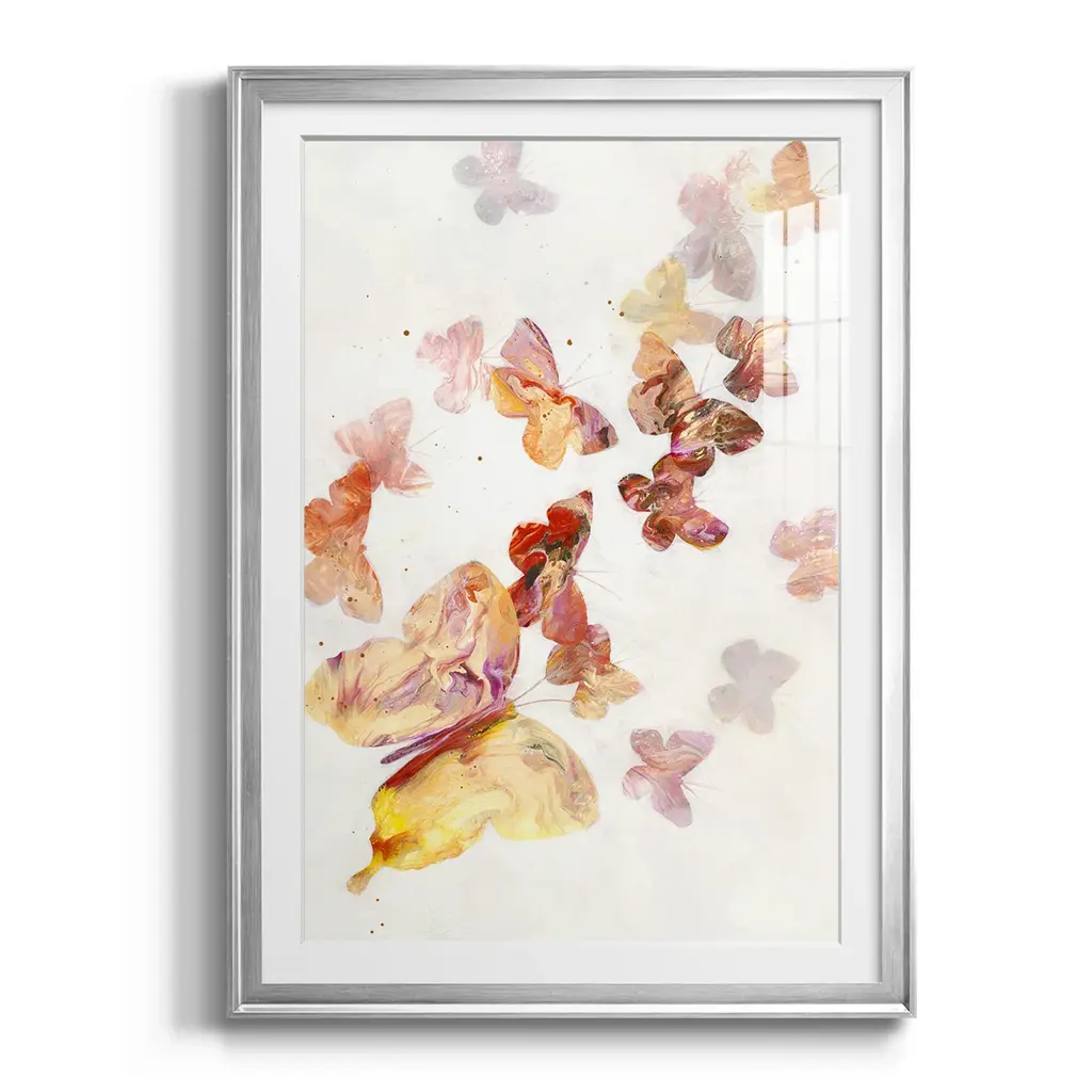 All A Flutter Premium Framed Print - Ready to Hang A Premium Framed Print created to last. Framed in distressed wood and available in an array of sizes and colors Featuring a beveled a solid wood stretcher bar, each piece comes ready to hand 4 SIZES AVAILABLE 30.5''X42.5'' - Overall Size 26.5'X36.5'' - Overall Size 22.5''x30.5'' - Overall Size 18.5''x24.5'' - Overall Size Each piece is made to order. Each piece comes with hanging hardware. Made in the USA Ready to Hang Giclee Paper Print Acrylic Glass Beveled Matt Board