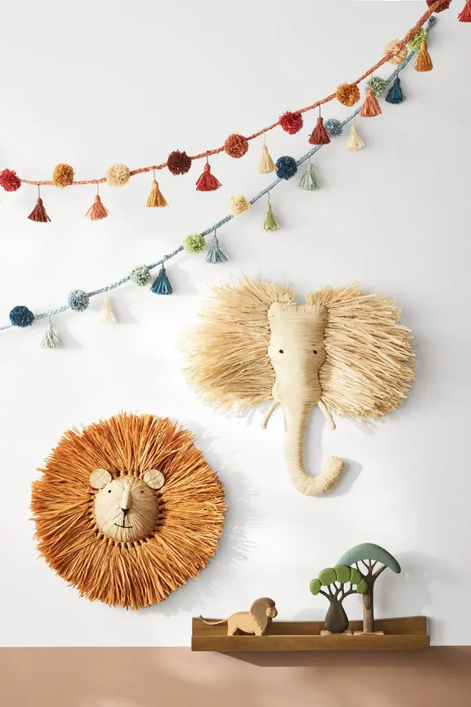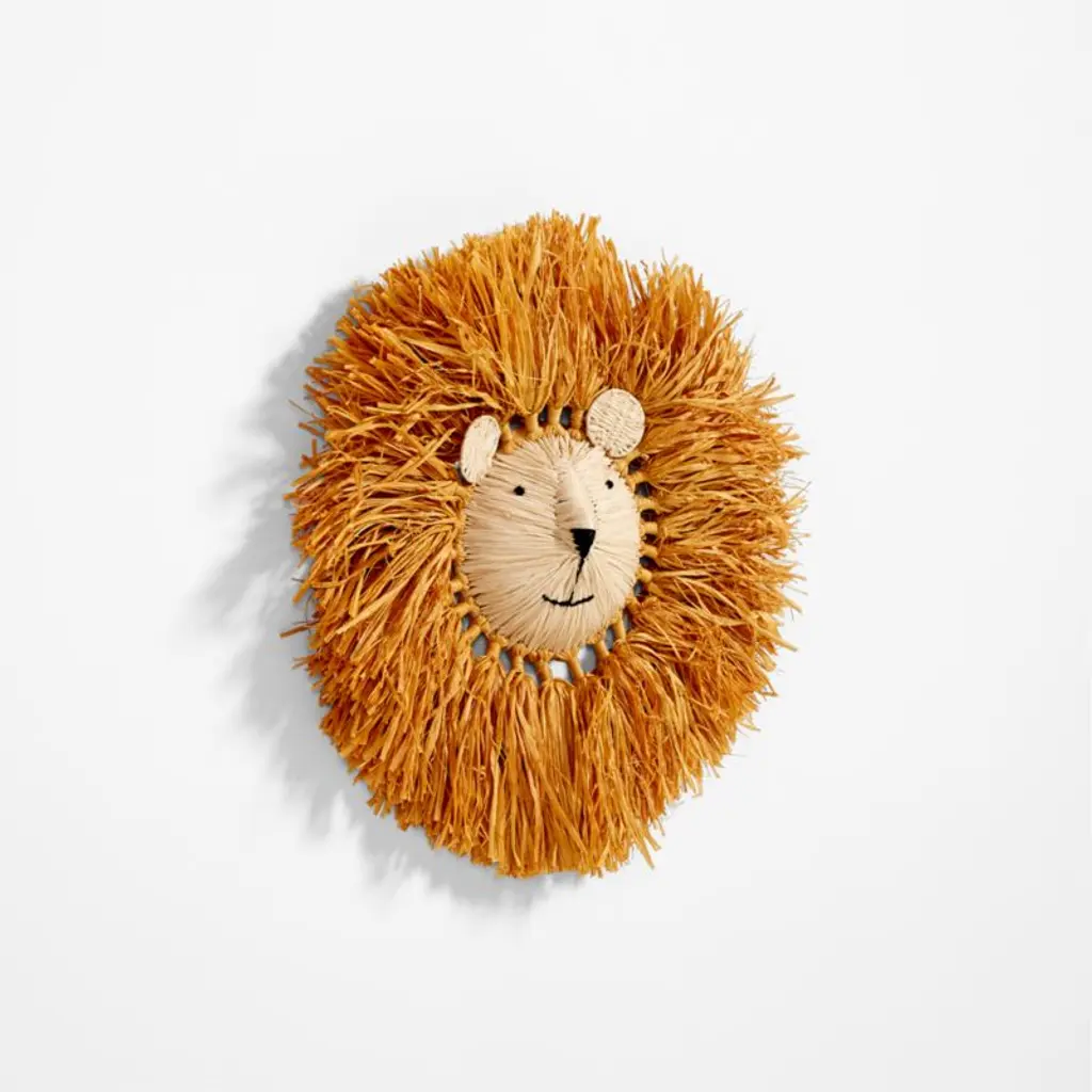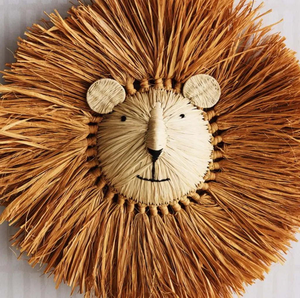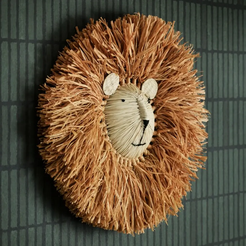 The perfect statement piece for little animal lovers, our enchanting lion wall art is handwoven of natural raffia. Kids will love the charmingly oversized main and sweet smile. These raffia animals are handcrafted by a women's cooperative in Uganda, which provides artisans with fair wages for their families.